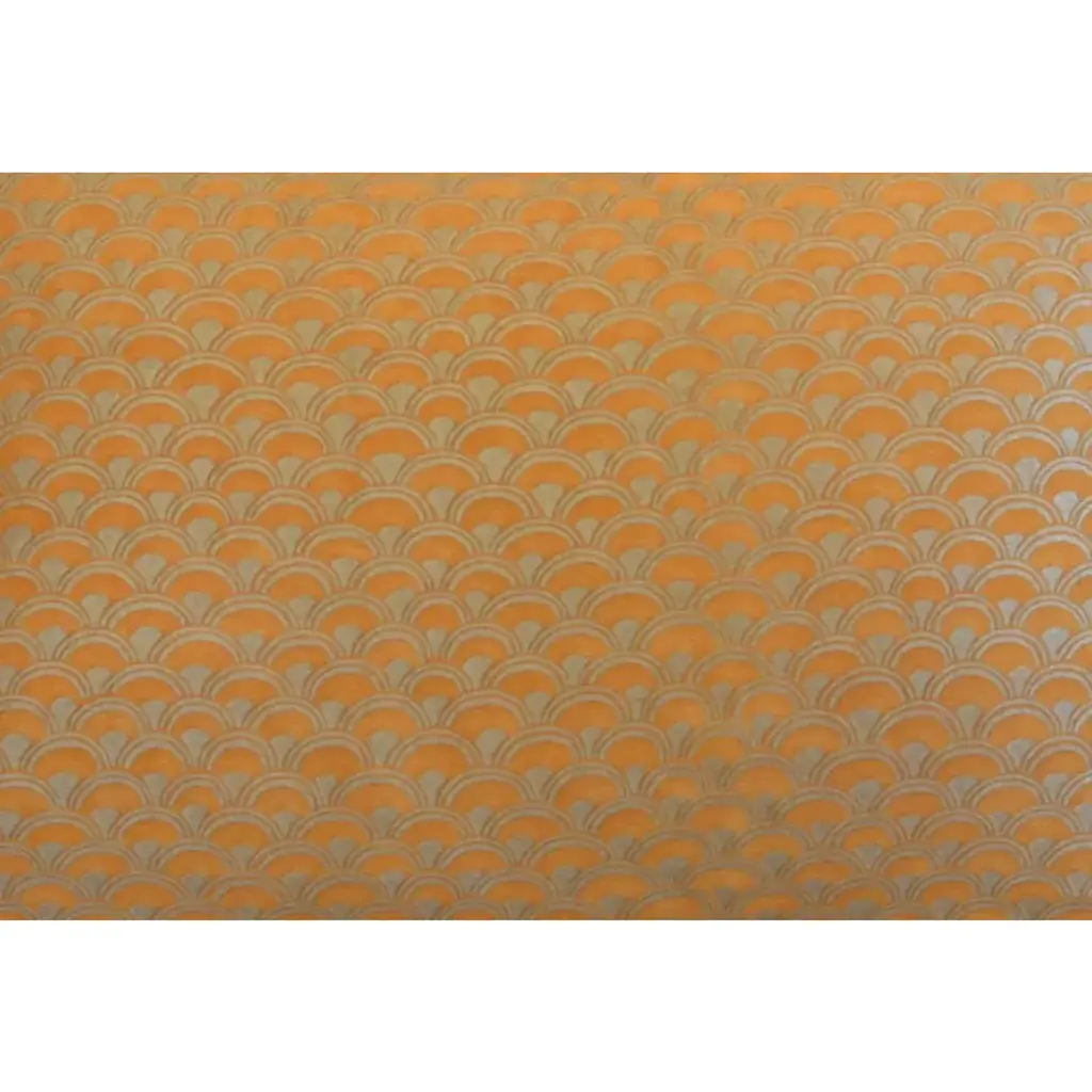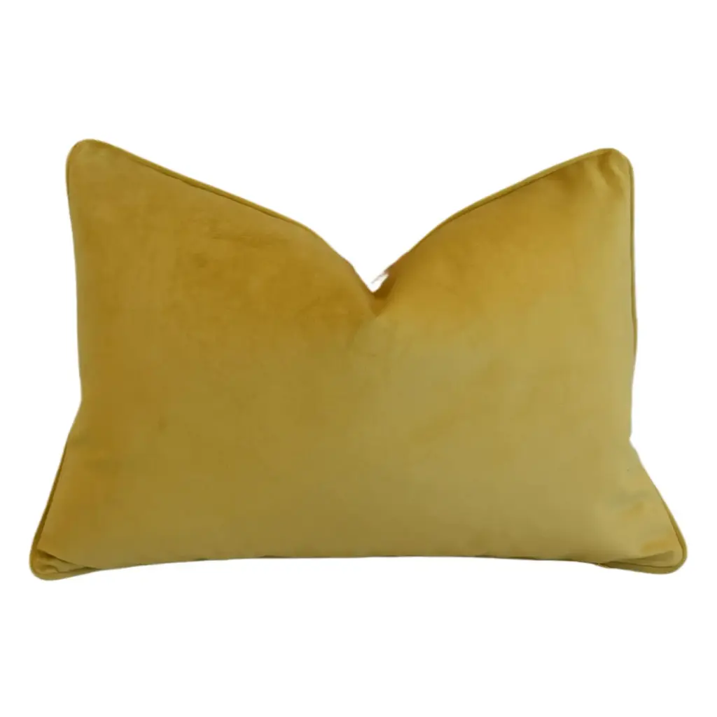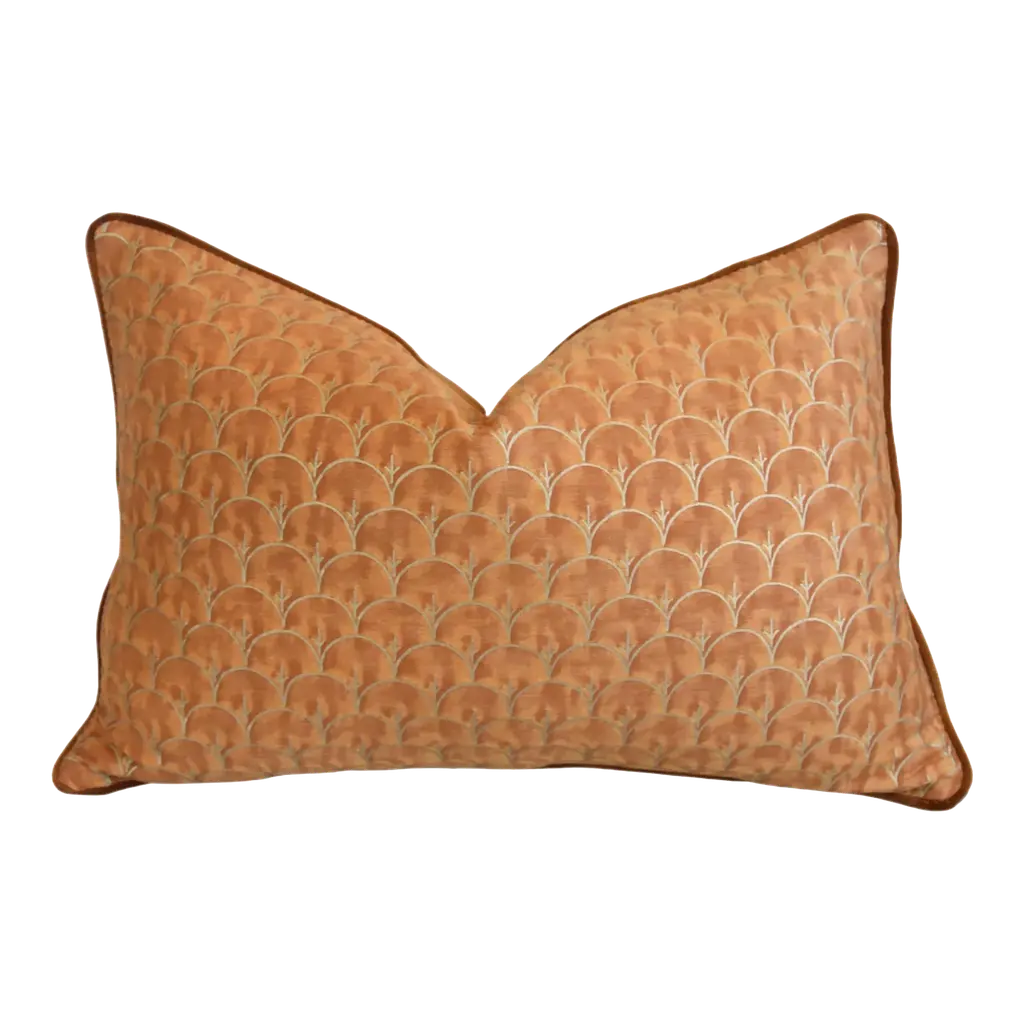 Custom-tailored pillow in Italian designer Mariano Fortuny's premium cotton fabric called "Papiro�������� in a gold and cream marmalade colorway. Simple in design, PAPIRO is an early 20th-century teardrop scallop motif derived from the early drawings of Mariano Fortuny. PAPIRO suggests a reedy marsh and fan-shaped blossoms. Gold-colored cotton velvet fabric back Custom linen cord piping trim. Zipper closure. Generous plump goose feather-and-down insert. Excellent new, unused, beautiful condition!!!