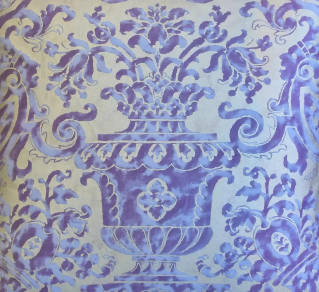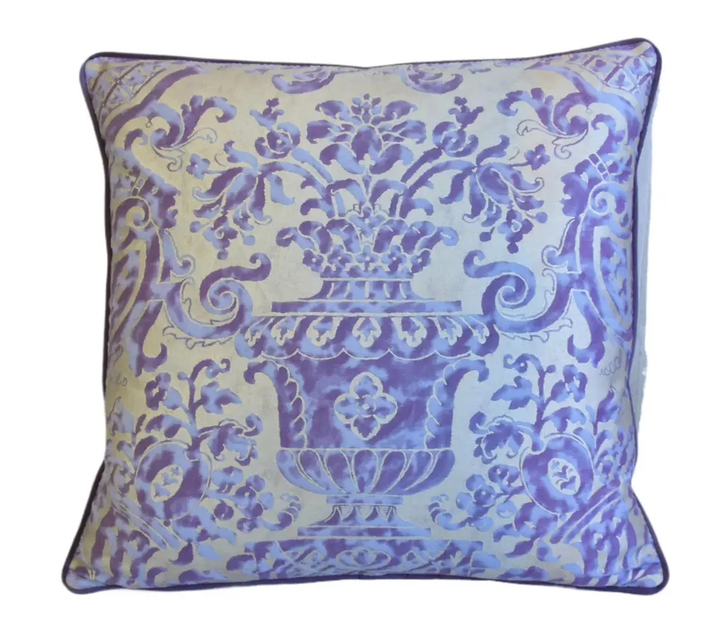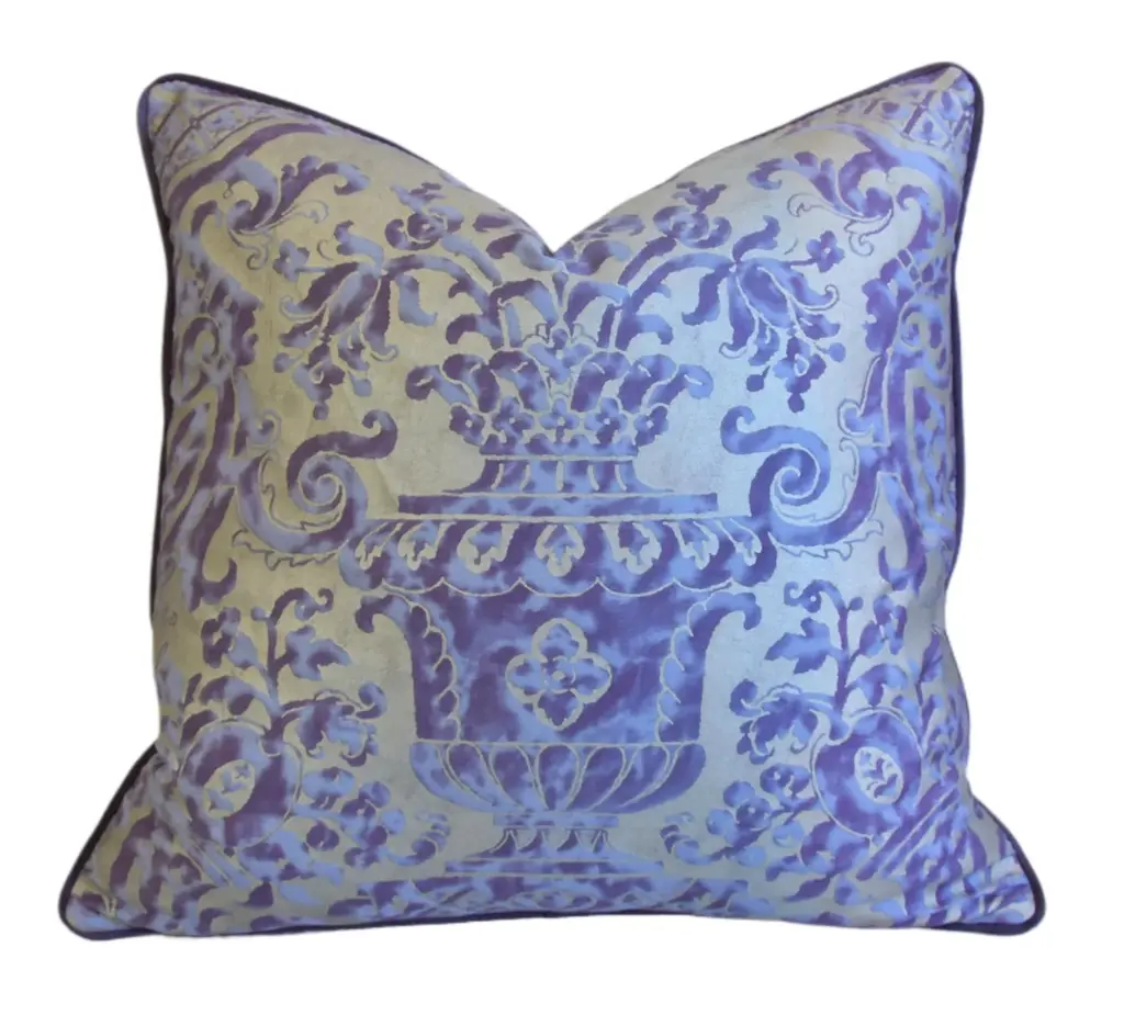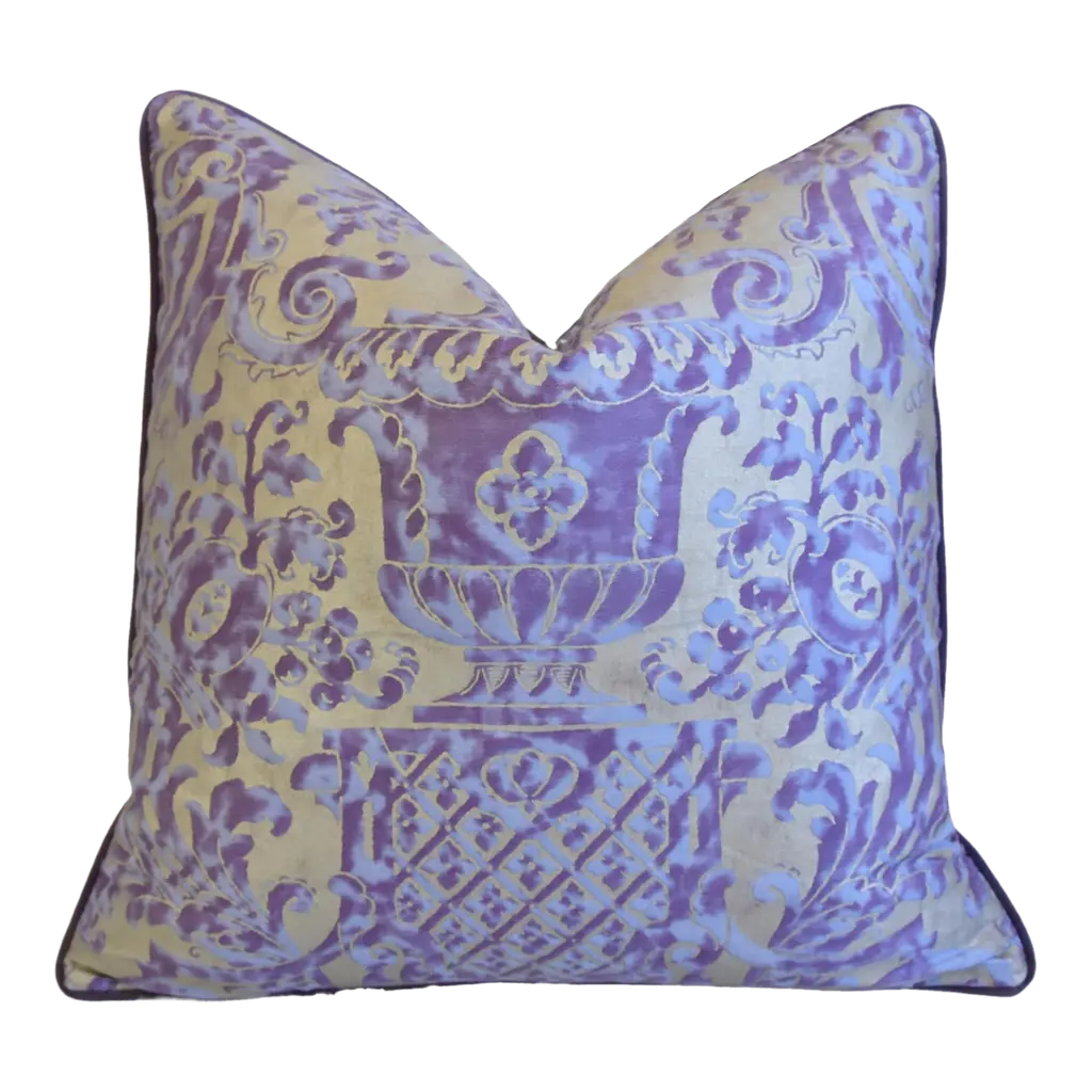 Custom-tailored pillow in Italian designer Mariano Fortuny's premium Egyptian cotton fabric called "Carnavalet" in a beautiful royal-purple and silvery-gold colorway. The design was inspired by a 17th-century French design. The pillow reverse is a complementary purple cotton-velvet fabric. Custom cord piping trim. Hidden zipper closure. Plump, generous goose feather-and-down insert. All pillows in this listing have an identical front pattern design layout. Excellent new, unused condition!! ***PLEASE NOTE: I will combine shipping whenever possible if you purchase multiple items from my shop. Warm regards, Mike Seratt ***Also don't forget to take a peek at my other current listings...you just might find something you can't live without!!! It's easy just click on my name to the right of any listing highlighted in black "Mike Seratt of The Prized Pig" and presto it will bring you to my storefront!!! Cheers!!! Mike Seratt I SHIP OUT IMMEDIATELY, SO THE ESTIMATION YOU SEE FOR THE DELIVERY TIMELINE IS CHAIRISH'S OVERALL GENERAL TIMELINE, BUT I WILL GET THIS OUT THE NEXT DAY AND DELIVERY IS USUALLY 5-7 DAYS AT MOST