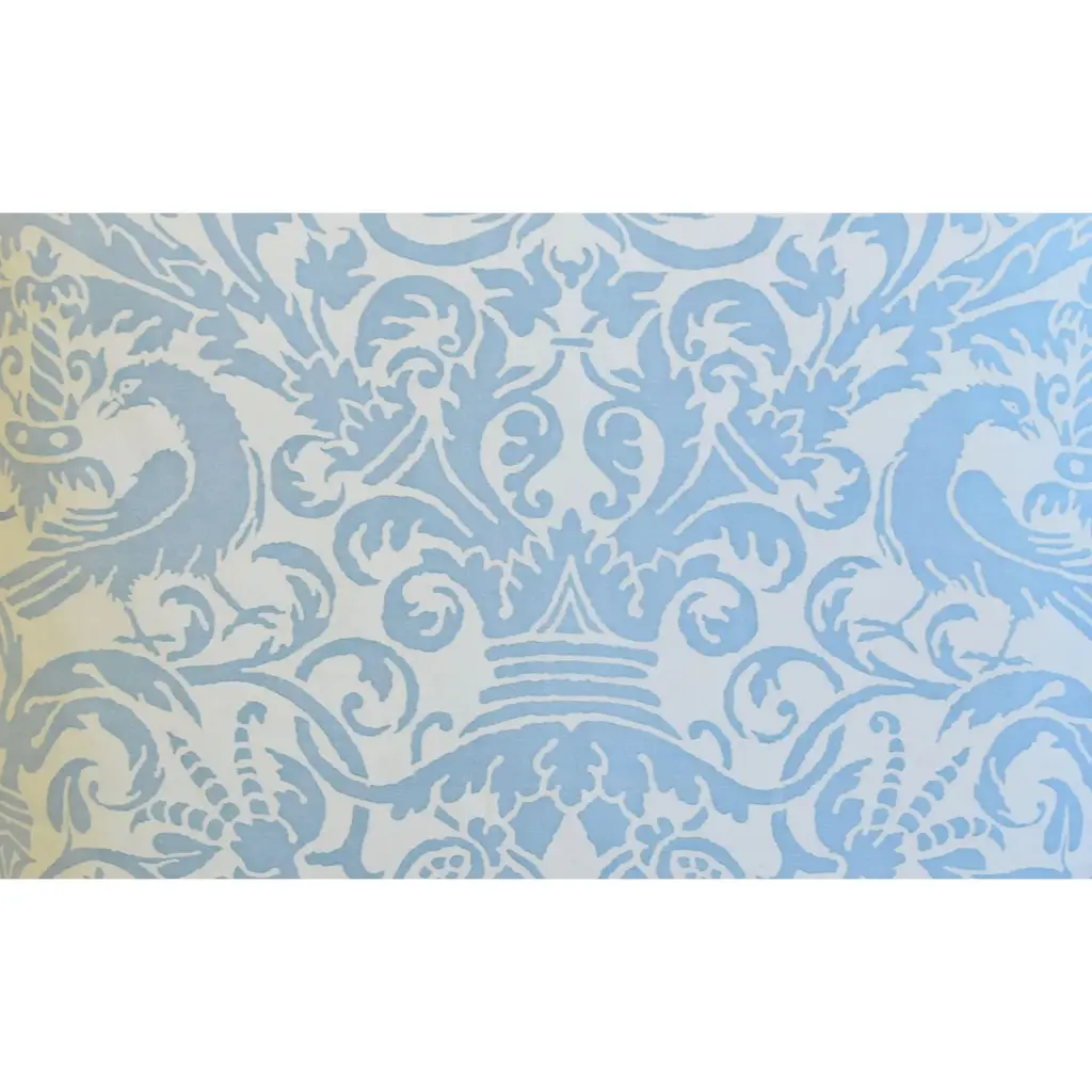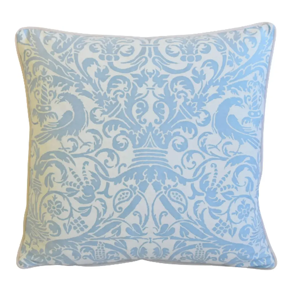 Custom-tailored pillow by Mike Seratt of The Prized Pig in Italian Mariano Fortuny cotton fabric called "Uccelli" in a blue and white colorway. The design was inspired by a 17th-century French bird motif. Off-white cotton velvet back. Zipper closure. Generous plump goose down/feather insert. Excellent new, unused condition!!!