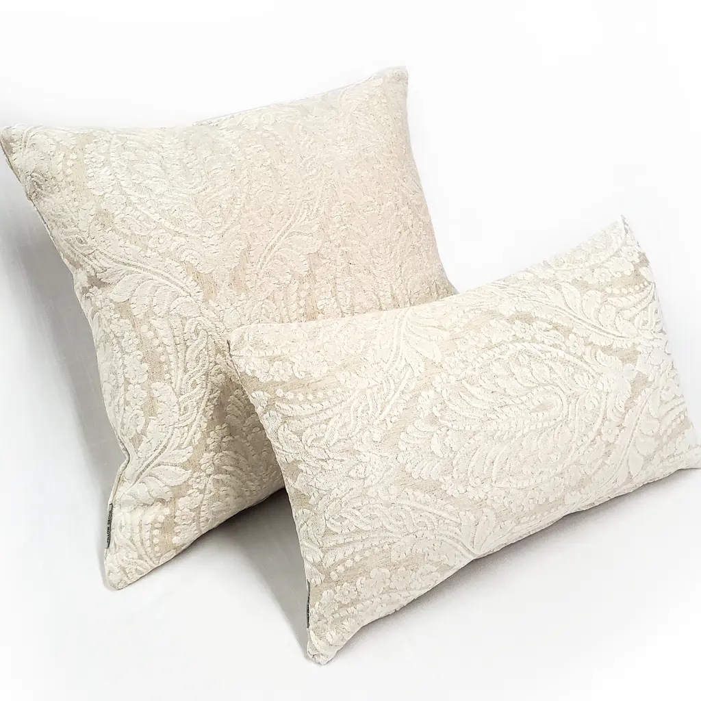 The luxurious 19" square Jacquard Damask in Cream Throw Pillow makes a timeless addition to any home decor. The tone-on-tone ivory damask pattern on a darker cream background exudes sophistication and elegance, while the soft fabric adds delightful texture and warmth. This pillow is perfect for any room and its neutral color scheme seamlessly blends with any decor. Upgrade your home with this high-quality, statement piece that offers both style and comfort. Size: 19"x19" Square Fabric: 86% Viscose/14% Polyester Same fabric on front and back Knife edge seams. Inside seams are serged for strength and durability. Hidden zipper closure in bottom seam of pillow cover Dry Clean Made in Canada: Designed and made in Pillow Decor's Vancouver workroom.