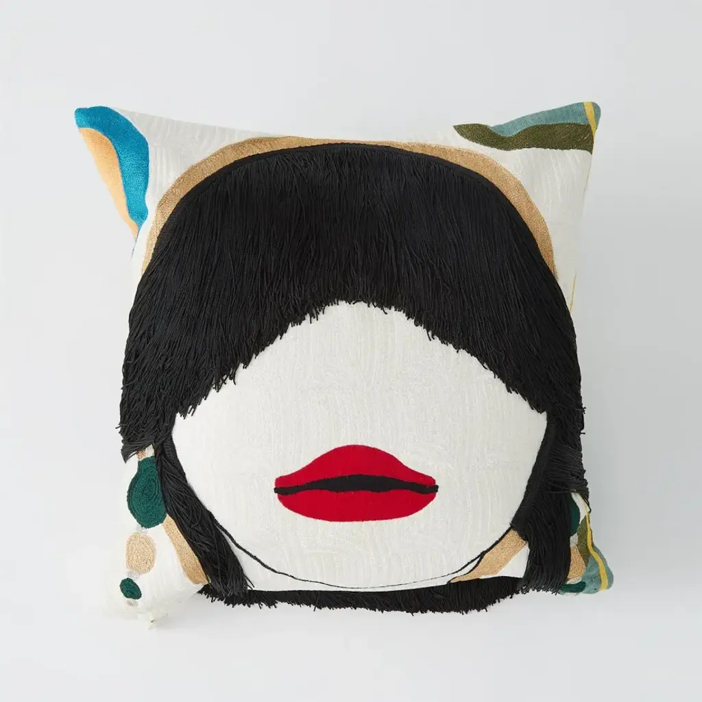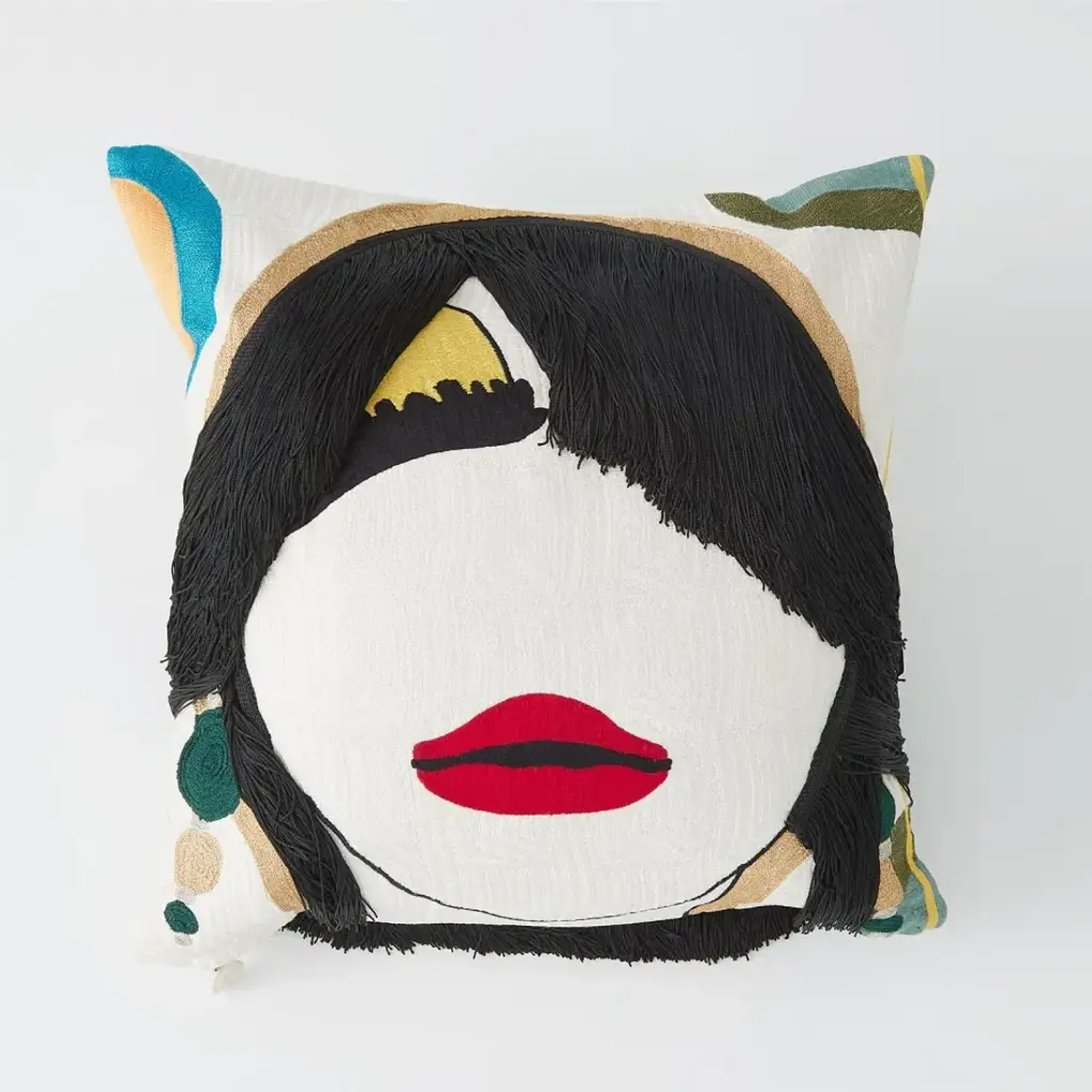 Fun, playful pillow fully embroidered on both sides and includes poly silk hair. Down fill insert. From a fashion forward perspective, Global Views offers accessories, furniture, statement lighting, and an assortment of rugs and mirrors to add beauty and joy to your home.
