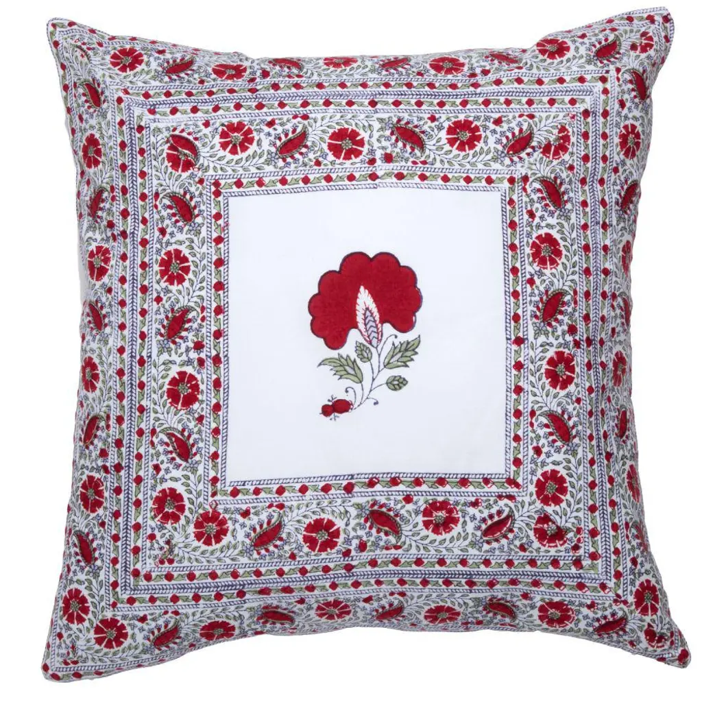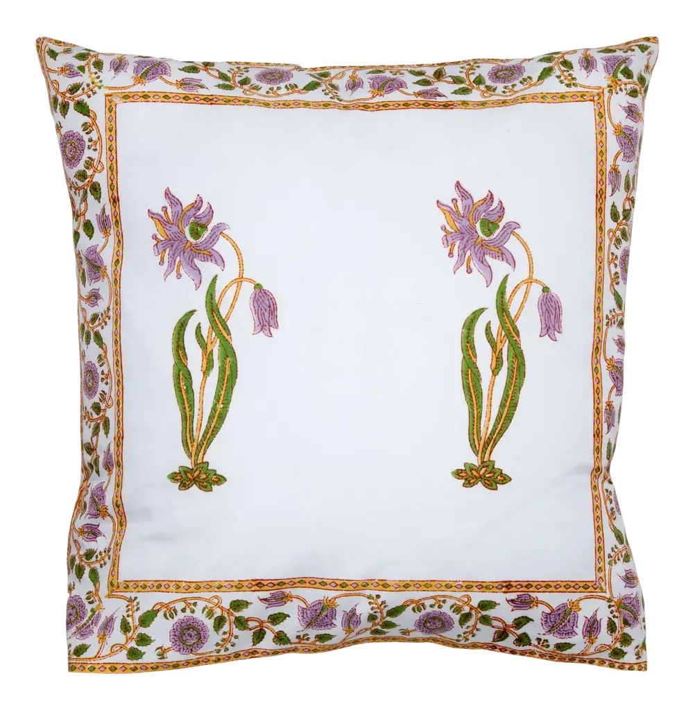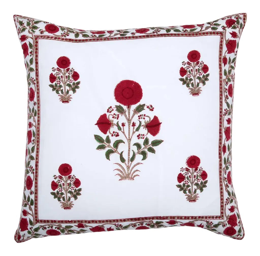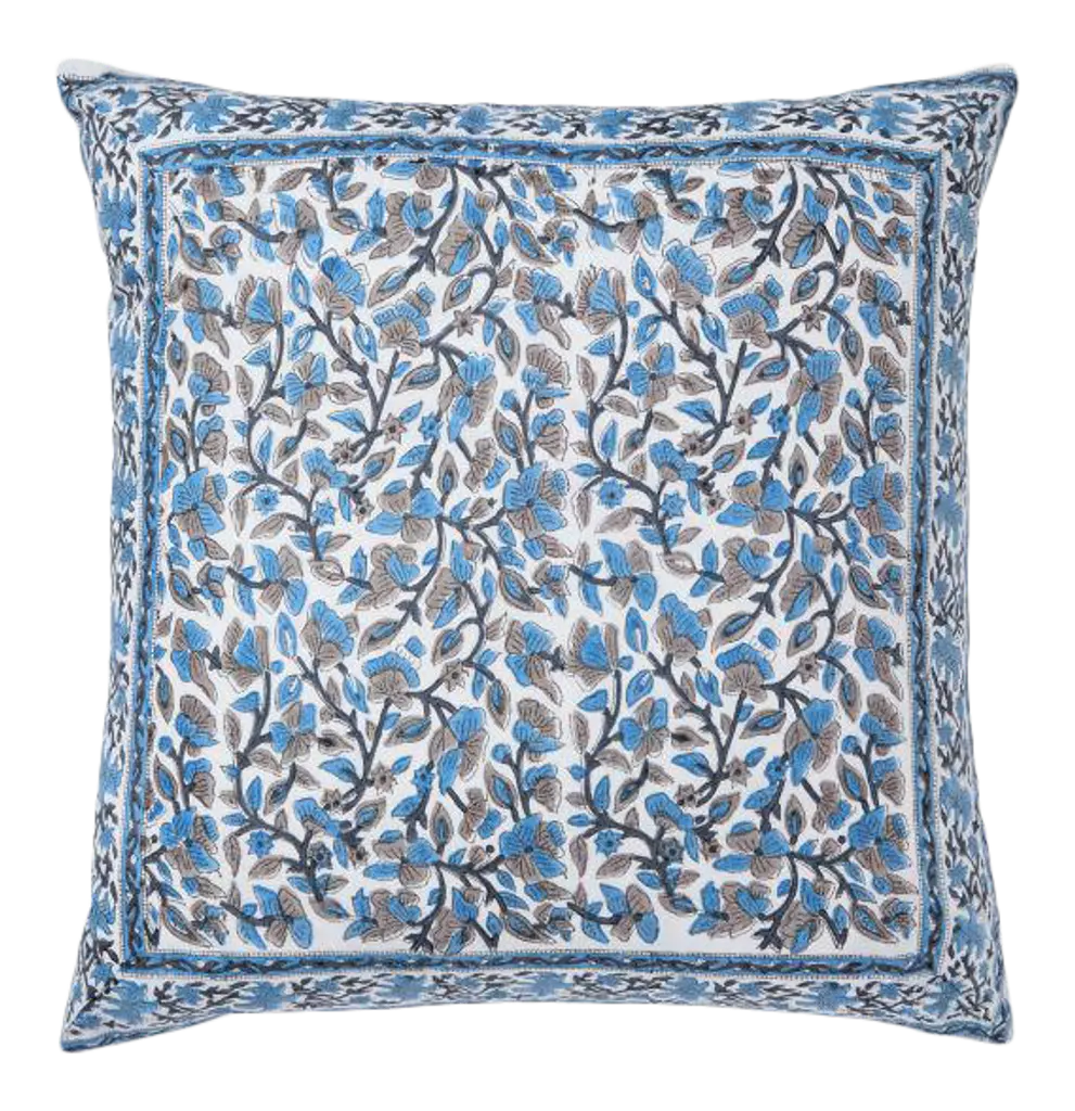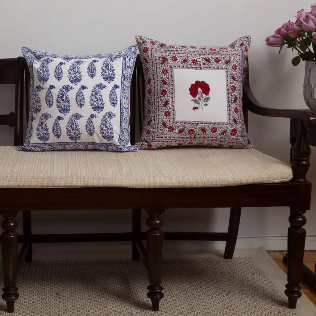 With an exuberant all-over flower pattern, the Janvi design presents a modern take on traditional, nature-inspired motifs. A beautifully detailed border makes for a striking finish. Ancient printing techniques and delightful traditional designs printed on 100% cotton. make our Indian block print pillow covers one of a kind. The hand-crafted nature of these fabrics gives rise to charming imperfections, highlighting the skill and artistry that go into making them. Add a subtle splash of color to a room, or bury your sofa and bed in an eclectic blend of patterns and hues with these chic Indian style pillow covers. Materials: 100% cotton. Product Features: Finished with an envelope closure on the edge for easy reversibility. Decorative Pillowcase/Pillow Case - cover only. Insert not included. Crafts: Hand block printing. DIMENSIONS Pillow Cover: 18" x 18" square CARE & MAINTENANCE Protect from direct sunlight when using. Hand or machine wash separately in cold water on gentle cycle. Use a mild detergent without any bleach or fabric softeners. Do not soak or wring the fabrics. Scrub gently if needed. Tumble dry on low heat or air dry in the shade. Iron at medium setting. Test stain remover on a small area before applying.