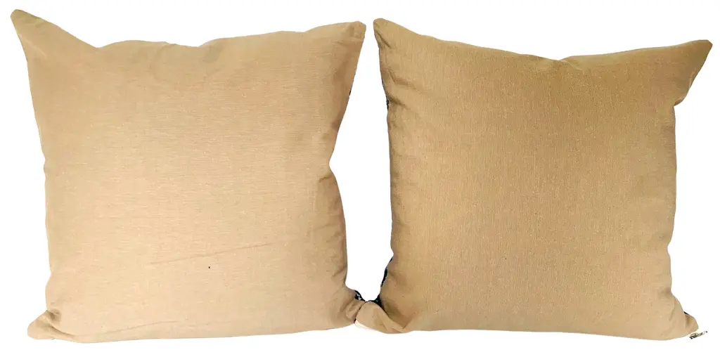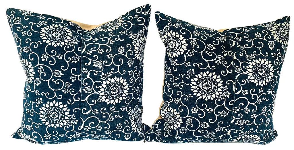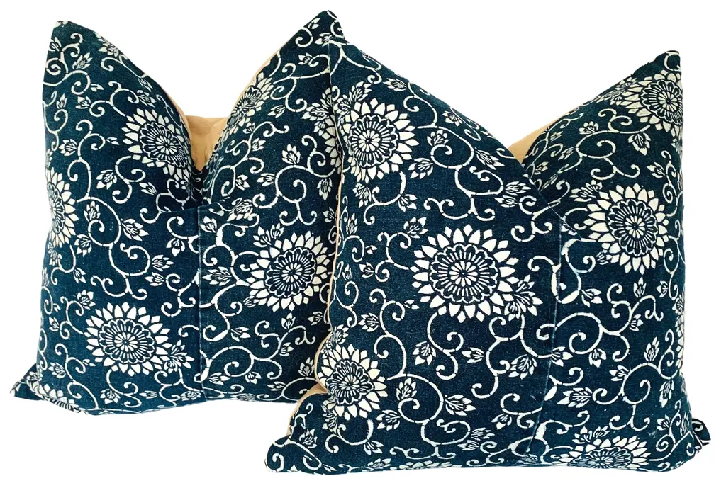 Pair of hand-printed throw pillows in the Japanese style of Kata-Zome, a centuries-old Japanese stencil dyeing technique. It uses a paste-resistant process and is used to dye both cloth and paper. Kata-zome incorporates elements of printmaking/painting and relies on simple natural materials, often with indigo dye as it was first only available to royalty and Samurai. Fabric found in an estate of a world-traveling couple & recently custom-made into throw pillows. Light age to front.