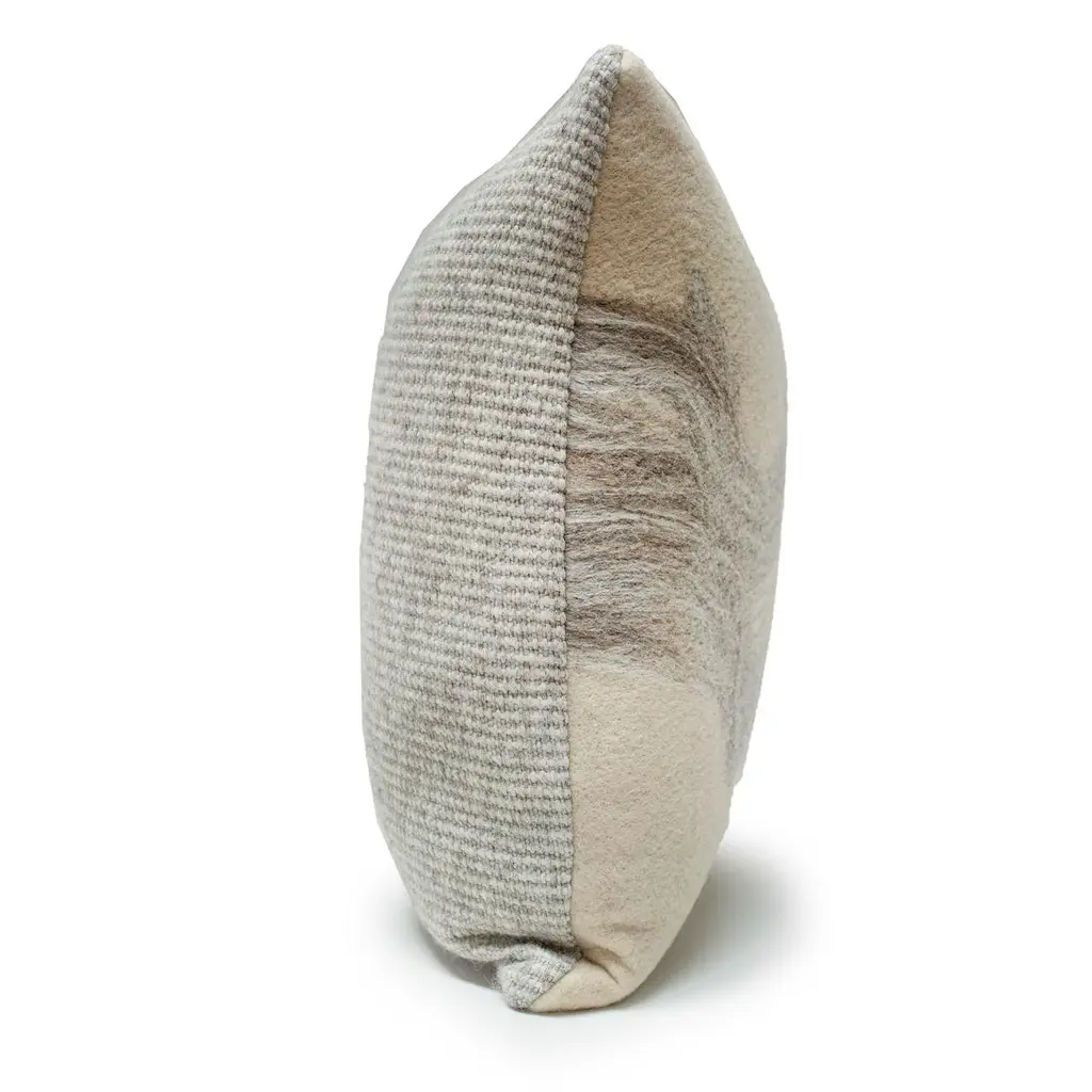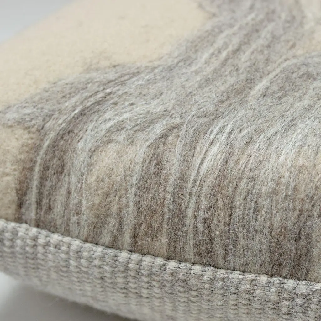Pillow front in hand-painted, Grey Ribbon felted wool fabric by JG SWITZER, backed with Sandra Jordan Prima Alpaca fabric in Casa Pebble.Pillow comes with a hidden zipper enclosure and ships with a high quality, custom insert. This is Dry Clean Only.