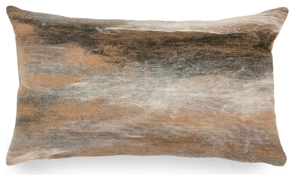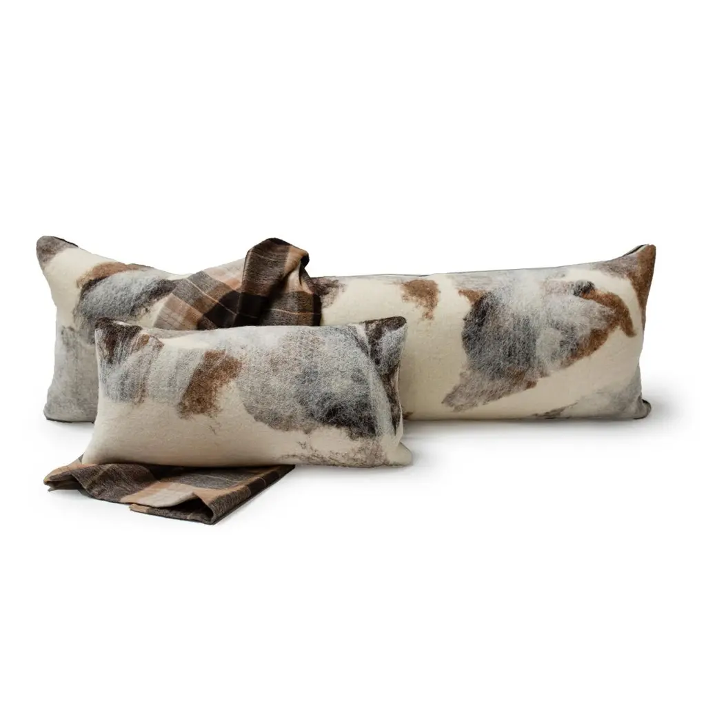 Pillow front in hand-painted, Tahoe with Cream felted wool fabric by JG SWITZER, backed with Sandra Jordan Prima Alpaca in Plaid Espresso Camel.Pillow comes with a hidden zipper enclosure and ships with an insert. This is Dry Clean Only.