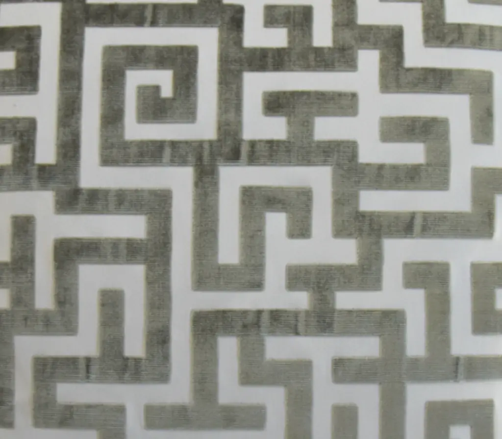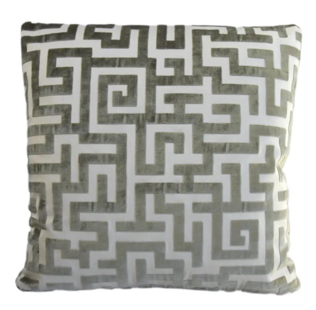 Custom-tailored pillow in Jim Thompson's "Apollon" green velvet fabric, depicting a stunning Greek Key geometric pattern. Same fabric on the back. Zipper closure. Plump, generous goose down-and-feather insert. New, unused, beautiful condition!!!