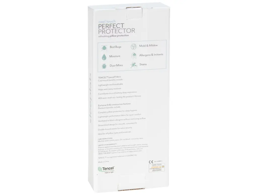 Cool Touch Perfect Protector gives refreshing pillow protection with natural, soft, and smooth Tencel fibers. The ultimate protection for allergy sufferers, or anyone looking to keep their pillow clean and protected from stains and moisture. This 6-sided pillow protector is expertly designed to allow airflow while still protecting your investment. A zippered barrier protecting against moisture, allergens, bed bugs, dust mites, mold, mildew, and stains. The ultimate protection for a clean, breathable, sleep experience.