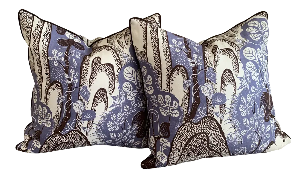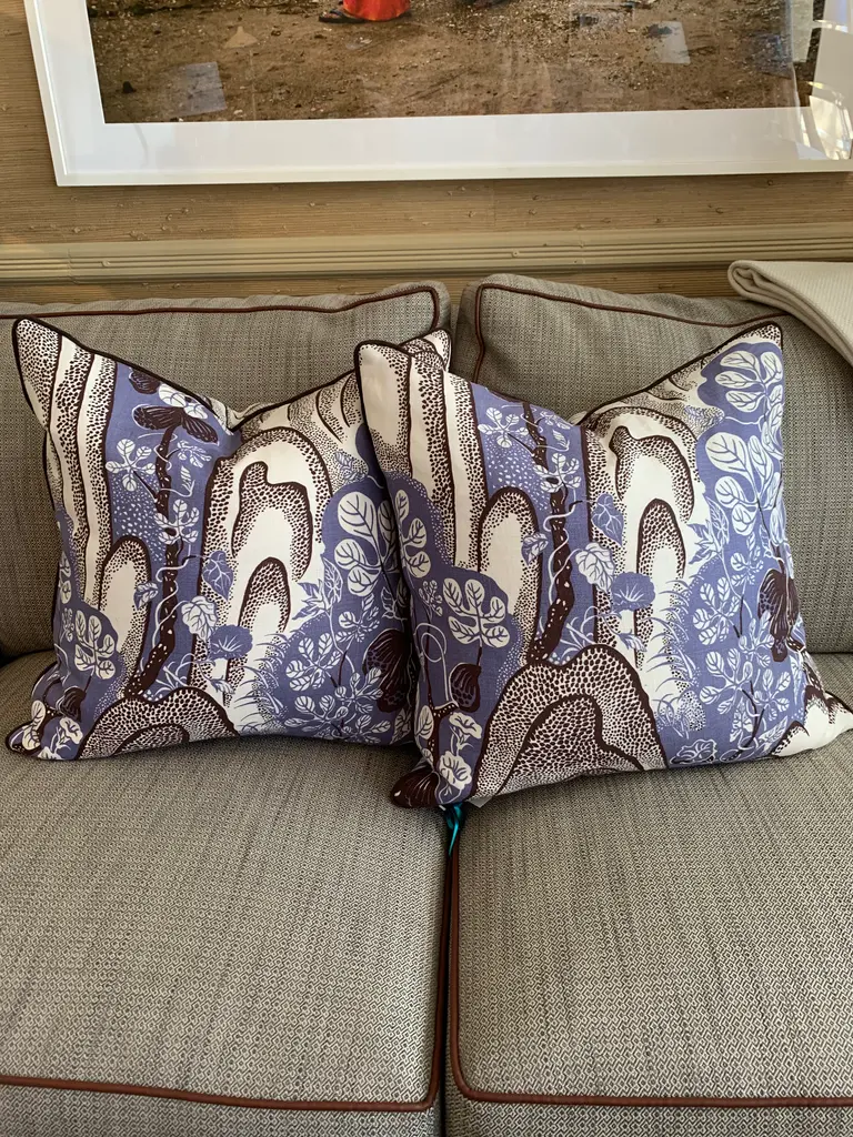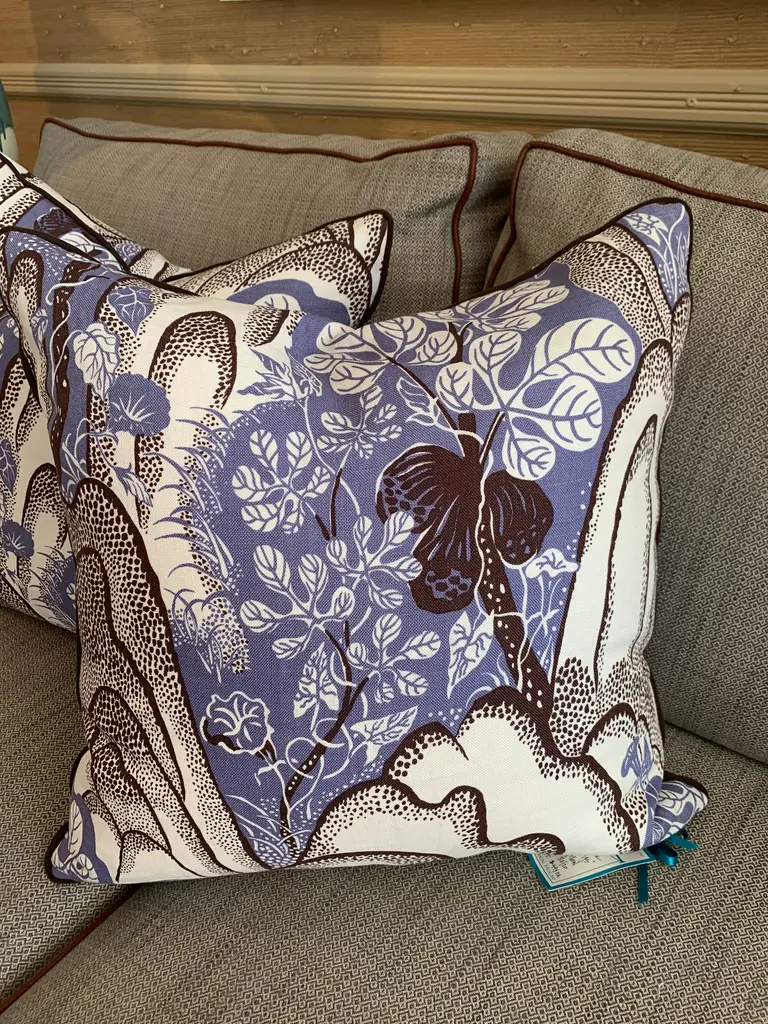 Josef Frank “Rocks & Figs” custom pillow with grosgrain trim and 80/20 down feather insert.