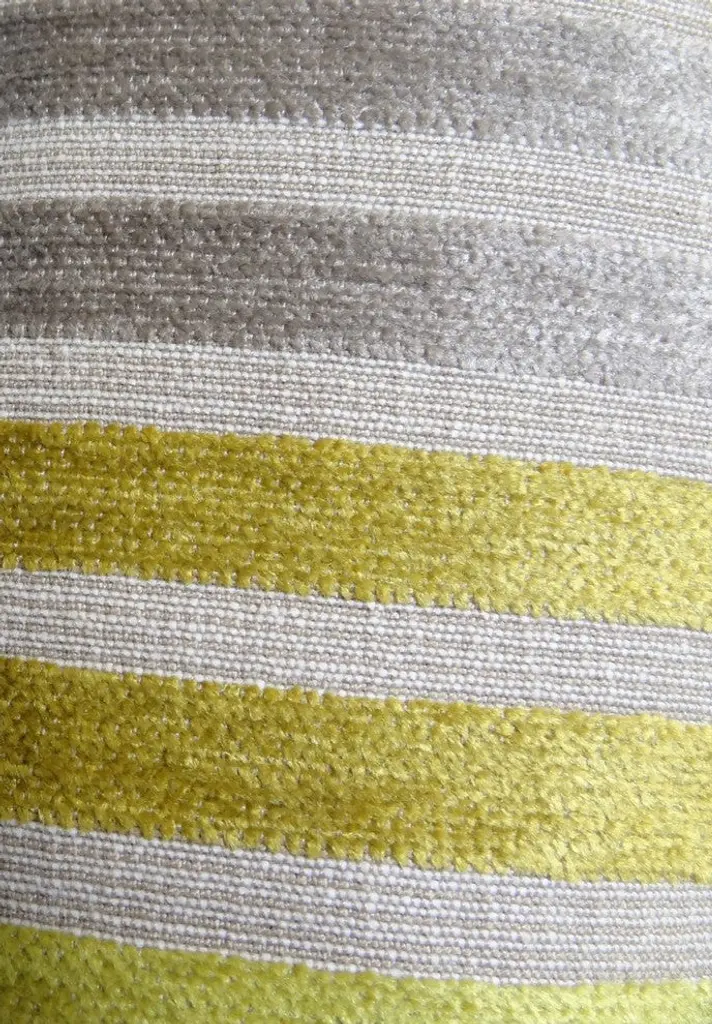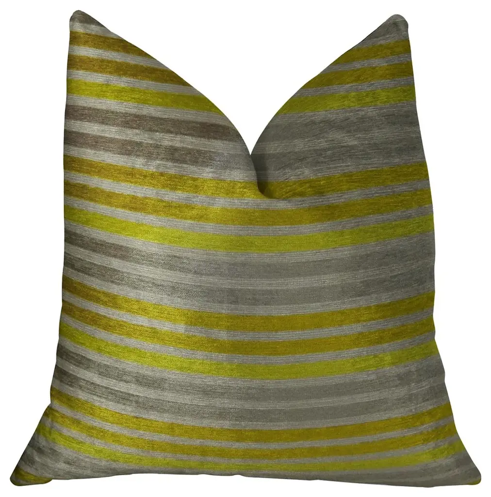 Bring this eye-catching, edgy and sumptuous statement piece to your room. Add a great conversational piece in the house with this plutus kaleva lime and gray handmade luxury pillow. The fabric is a blend of Cotton, Polyester and Viscose.Pillows are Handmade in USA• Color: Lime and Gray• Double Sided pillow• Invisible zipper enclosure for a tailored look• All seams are over-locked and stitched for a professional finish• Pattern placement may vary slightly• Pillow measurements are seam to seam from the inside• Pillows include • Made in USA• Hypoallergenic Down Alternative Polyfill Insert• Dry Clean recommended• Fabric Content: 46%Cotton/31%Polyester/23%Viscose• Pattern: Striped