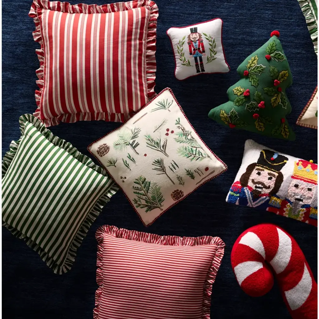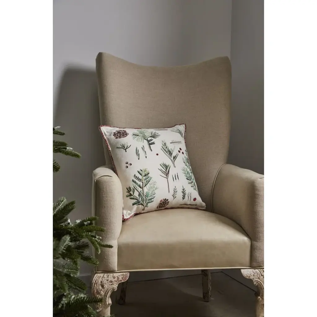 Create the feel of a lodge in the mountains with the Botanical Pine Pillow, featuring a holiday greenery screen printed on white fabric with embroidered details, an included insert, and red & white piping for a festive contrast.