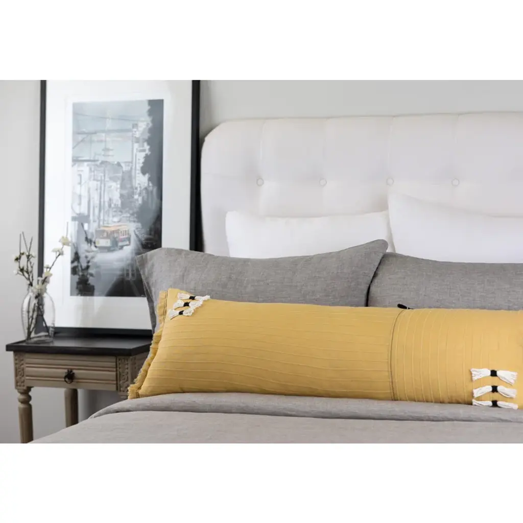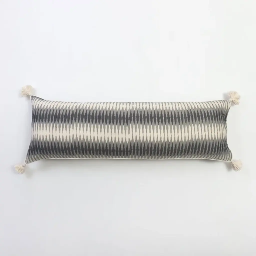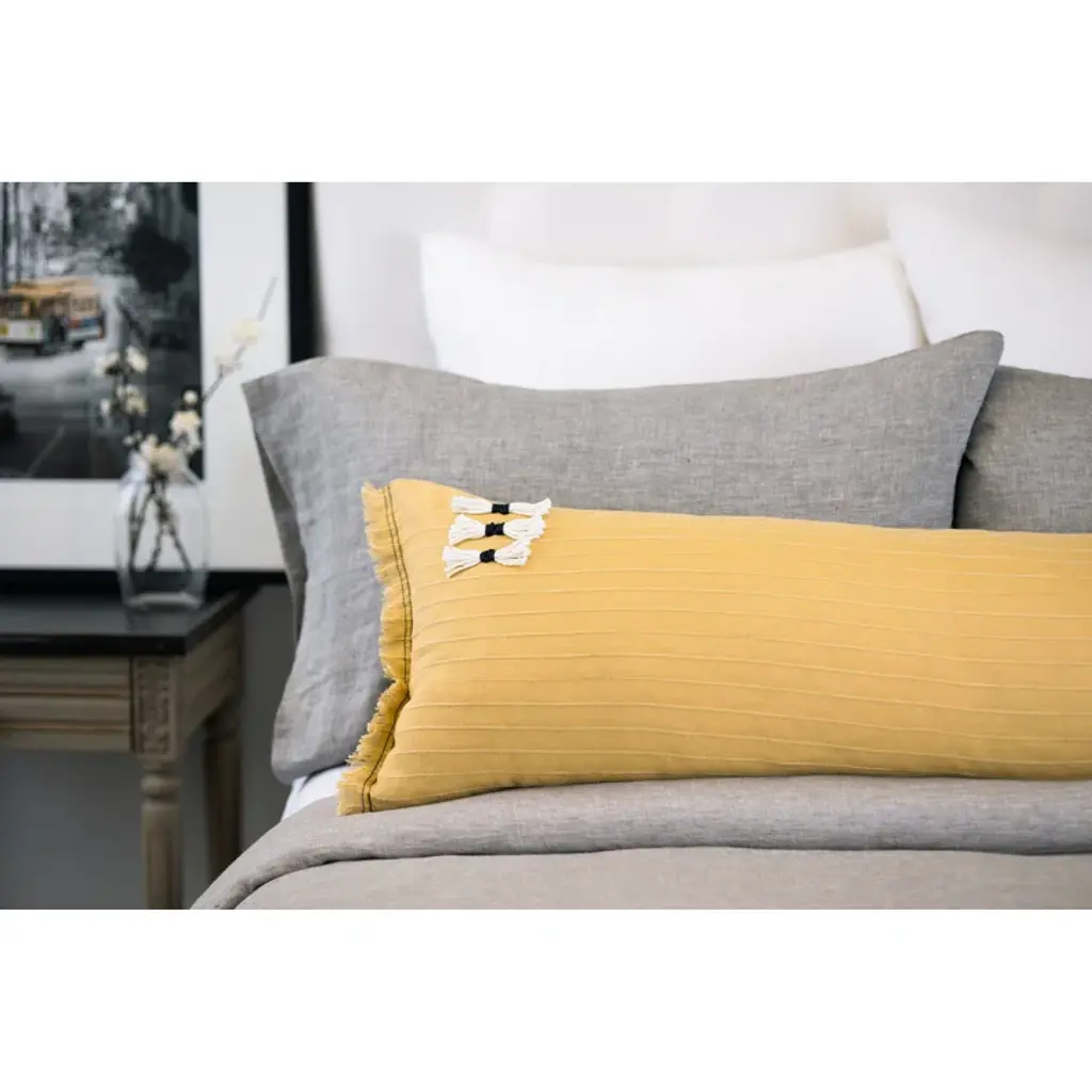 A new staple, this x long bolster to match our Cambria duvet cover is understated enough to be solid, yet boasts a touch of interest. Small tassels add a dramatic contrast to subtle textures.