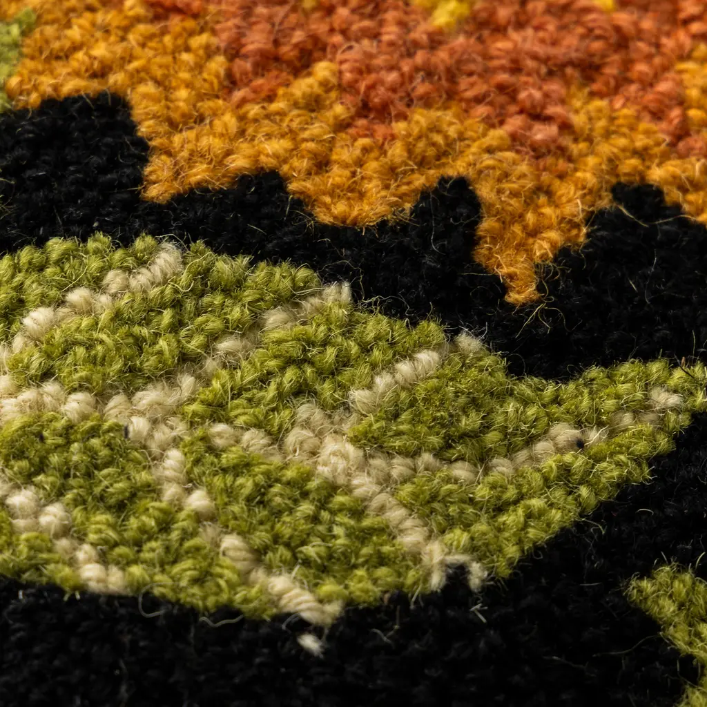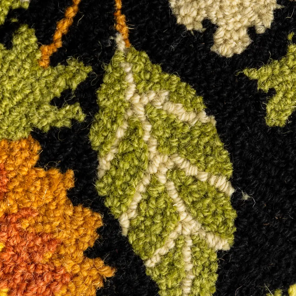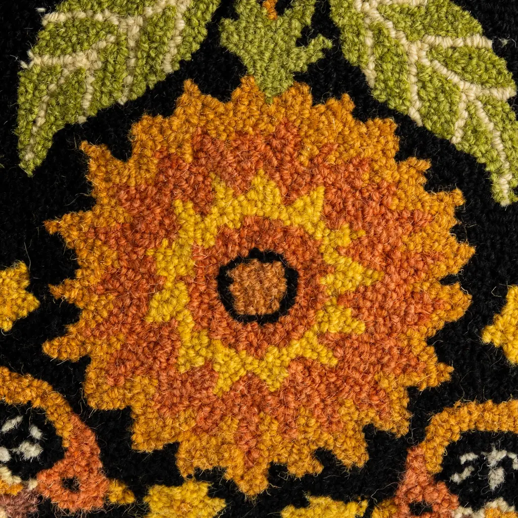 This Fall Throw Pillow features a lovely representation of a sunflower visited by a pair of feathered friends. The front is made from 100% wool with a hooked design while the back is made from cotton velvet.The 16" square pillow has polyester filling and a zippered closure. We recommend dry cleaning or spot cleaning onlyThe black background lets the autumn hues of the flowers, leaves and birds take center stage. You'll love this pillow as a part of your fall decor and as a soft place to rest your head.