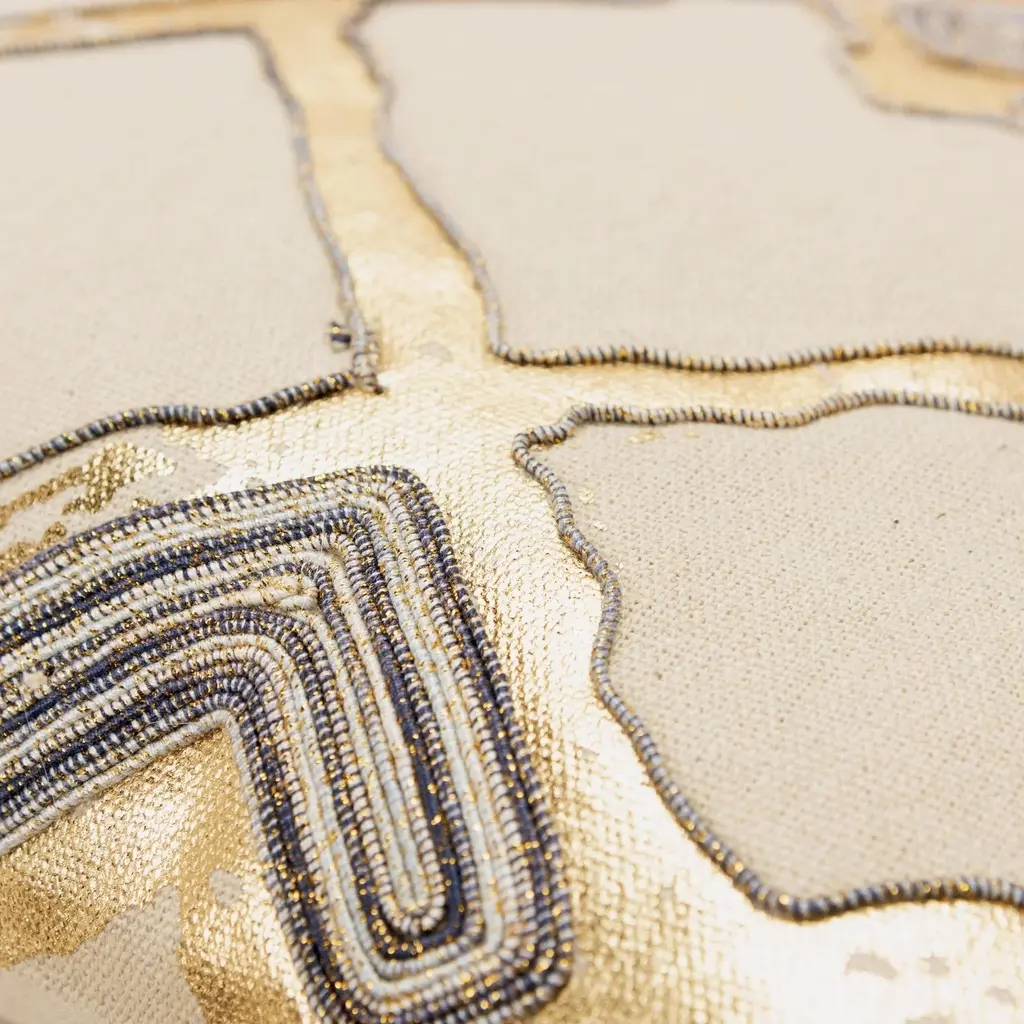 Radiant metallic gold accents the square pattern and then a variegated grey cording is sewn to accent the gold and add texture to this Beige, Gold, and Grey Square Geometric Throw Pillow. This pillow is a large piece that will enhance your transitional style home décor. The back of the piece features a solid beige cotton fabric with a hidden zipper for access and is finished with a knife edge.