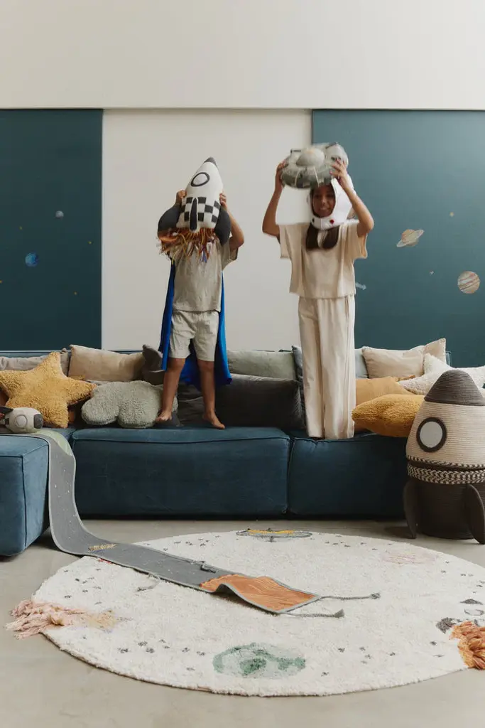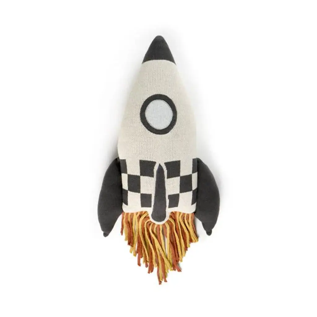 3...2...1... Takeoff! Hop on the Knitted Rocket Cushion and leave Earth's atmosphere behind as we head into outer space with comfort and style. This cozy cushion, made from cotton, looks like a rocket with a natural-colored base and dark grey details. The long fringes on the edges make it look like the rocket is blasting off, adding a playful touch to your space-themed decor.