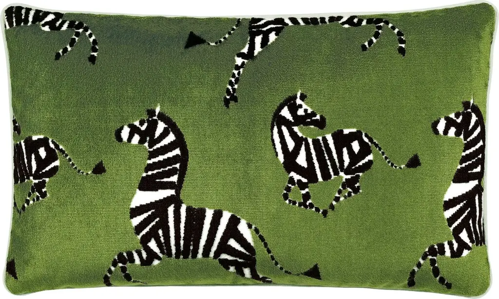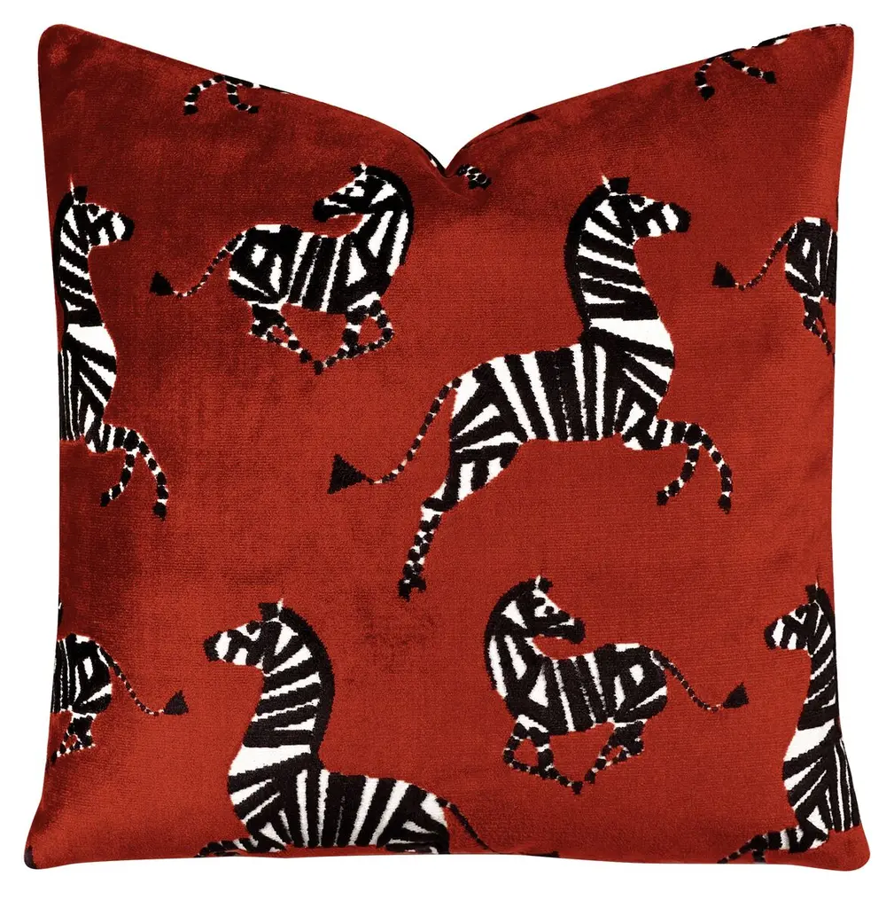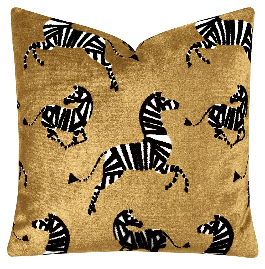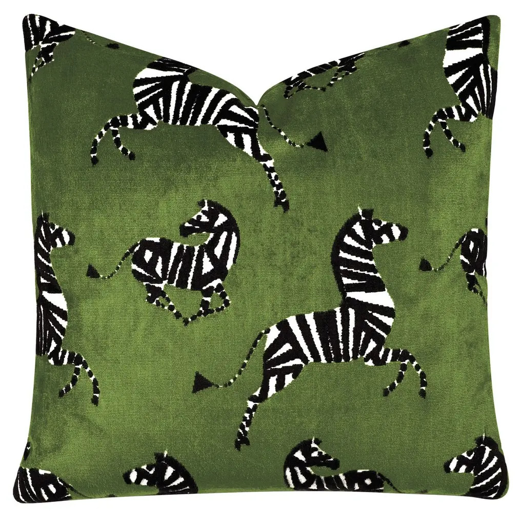 Exclusive to One Kings Lane: Zebras frolic on both sides of this velvet throw pillow. Made in the USA, the pillow is amply filled with plume feathers for long-lasting comfort. Zipper closure.