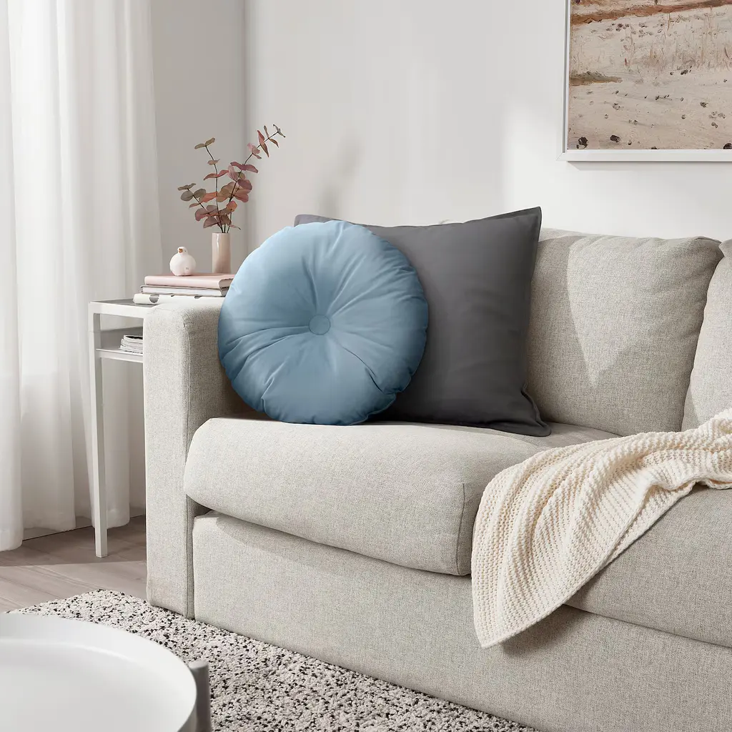 KRANSBORRE Cushion - dark blue 16 ". Polyester velvet feels ultra soft against your skin. The filling in this cushion is made of recycled polyester. Using recycled material as a resource takes us one step closer to a more sustainable future.