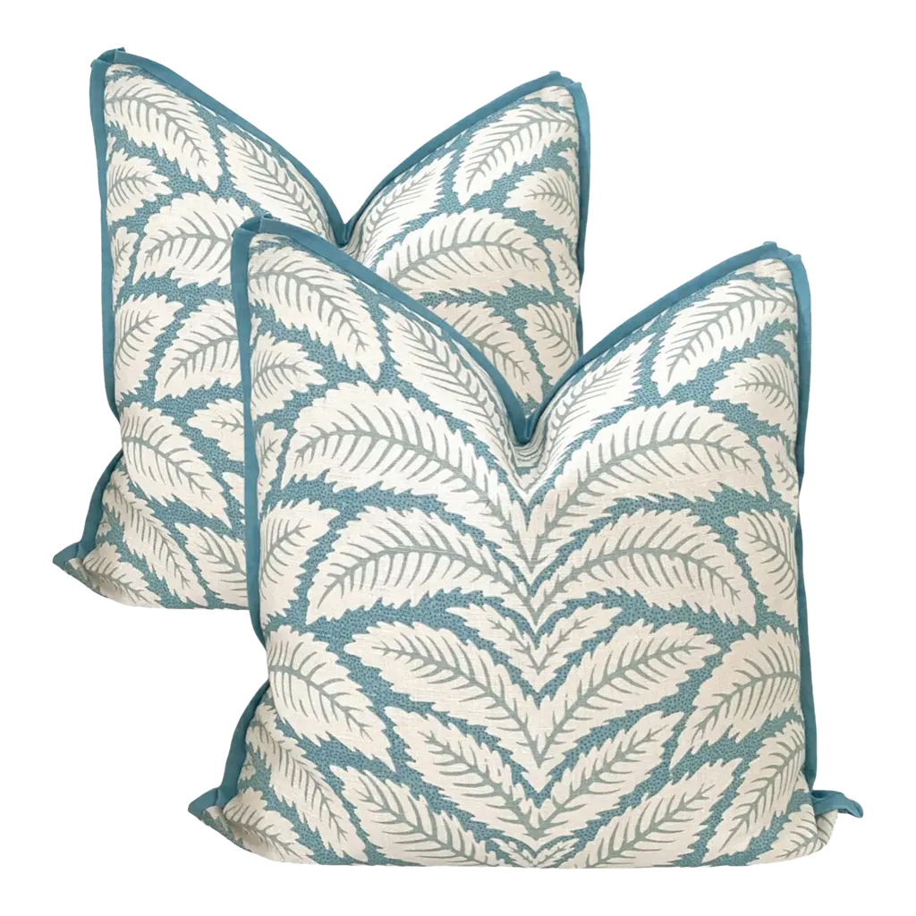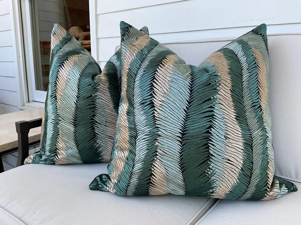 This is a stunning embroidered fabric from the exclusive couture line of Kravet. Featuring rich and dynamic shades of dark and light green, and gold this fabulous leaf print is truly a work of art.K “Plumage” in colorway 4 (teal). Has a rich iridescence in rippling embroidered shades of teal, blue and silver. (Think Peacock!) Backing is plush black velvet."About UsAt Accent Marks, each designer pillow is crafted with care using the finest hand-selected fabrics and trims, paired with durable, discreet invisible zippers. We specialize in creating beautiful, high-quality pieces that elevate your home decor. While most of our listings feature 22"" pillow pairs, we also offer a range of sizes and single pillow options to suit your needs. All of our Accent Marks pillows are proudly made in the United States.If you don't see the fabric you're searching for, please reach out via message as we have other fabrics available upon request and can create anything that you like. Thank you for visiting Accent Marks!"
