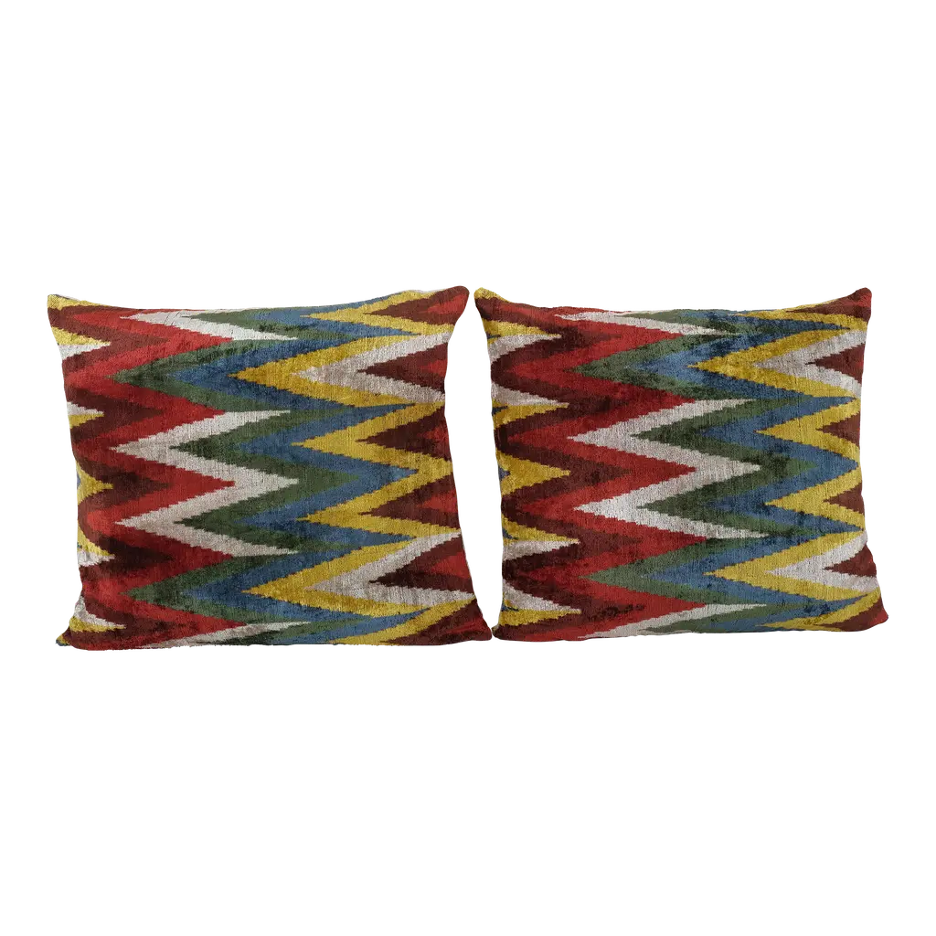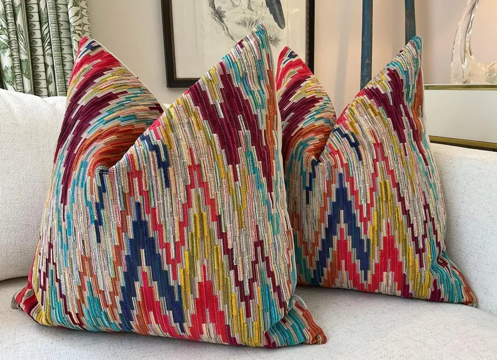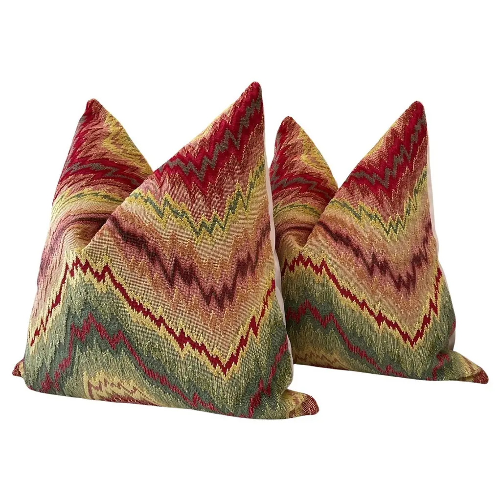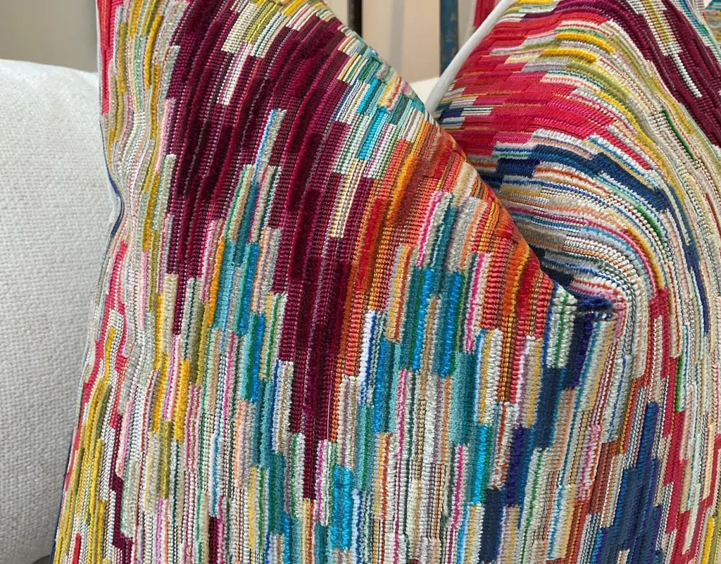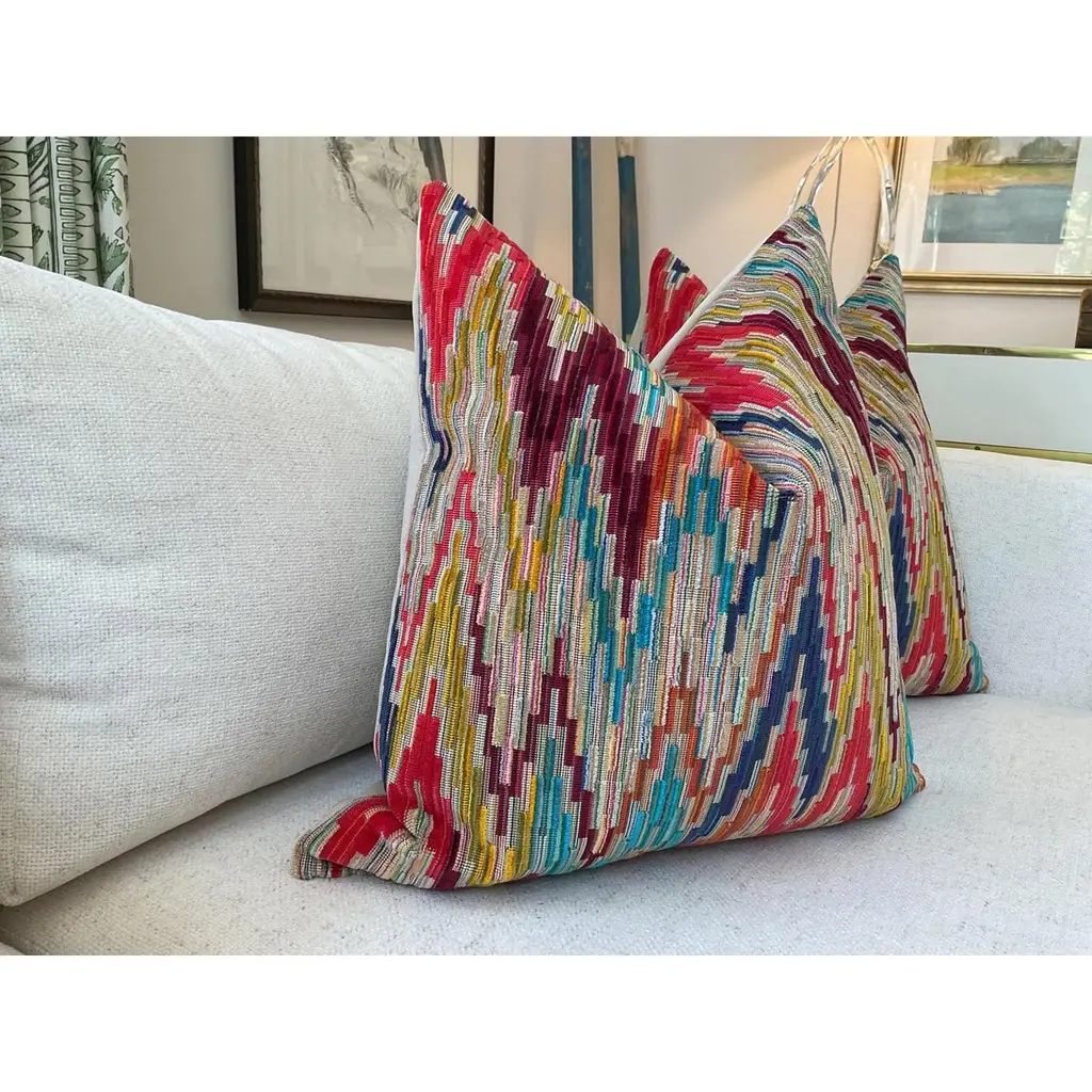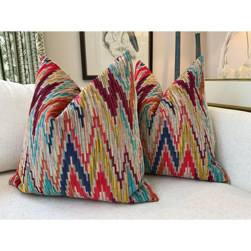 This is a stunning carved velvet from the exclusive couture line of Kravet. Featuring rich and dynamic shades of magenta, bold orange, turquoise, yellow, royal blue, and lime green, this Missoni-inspired flame stitch is truly a work of art.These covers will be backed in a coordinating plush tan velvet. Please reach out if interested in a double-sided pillow as we can certainly accommodate such requests. Closure will be by way of an invisible zipper. These will come as a 22" pair with plush down inserts.About UsAt Accent Marks, each designer pillow is crafted with care using the finest hand-selected fabrics and trims, paired with durable, discreet invisible zippers. We specialize in creating beautiful, high-quality pieces that elevate your home decor. While most of our listings feature 22" pillow pairs, we also offer a range of sizes and single pillow options to suit your needs. All of our Accent Marks pillows are proudly made in the United States.If you don't see the fabric you're searching for, please reach out via message as we have other fabrics available upon request and can create anything that you like. Thank you for visiting Accent Marks!