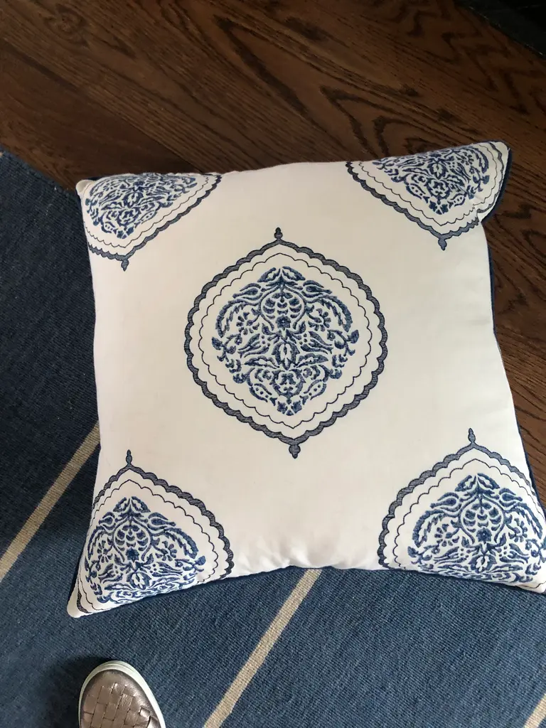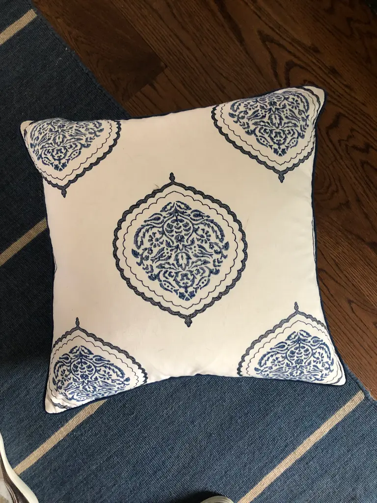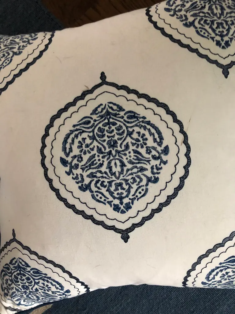 Beautifully made pillows with invisible zippers on this gorgeous Kravet fabric white background and blue design. NO inserts provided.