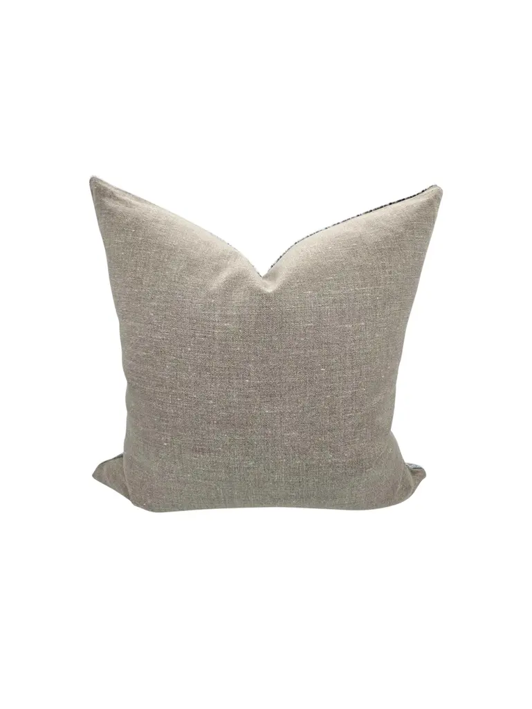 Pair of handcrafted pillows fashioned with Kravet Mountainscapes in light blue fabric on the front and backed in a flax colored linen. Meticulously crafted with serged interior seams, invisible zipper closure, and 95%Feather/5% Down fill insert. Brand new condition.