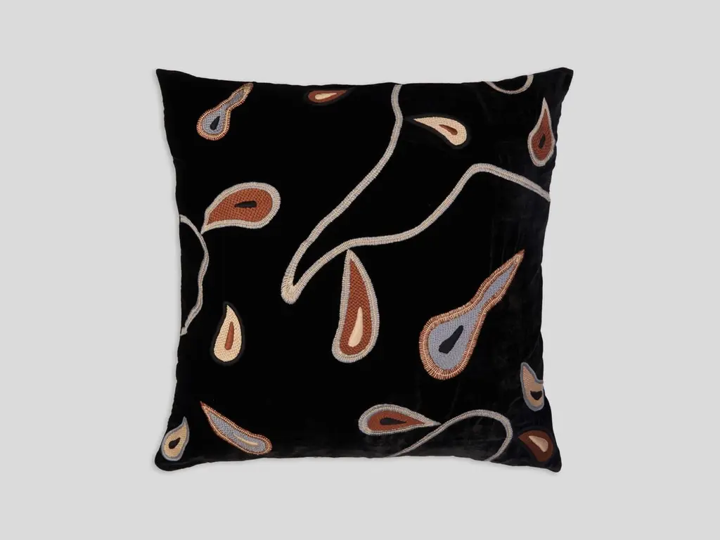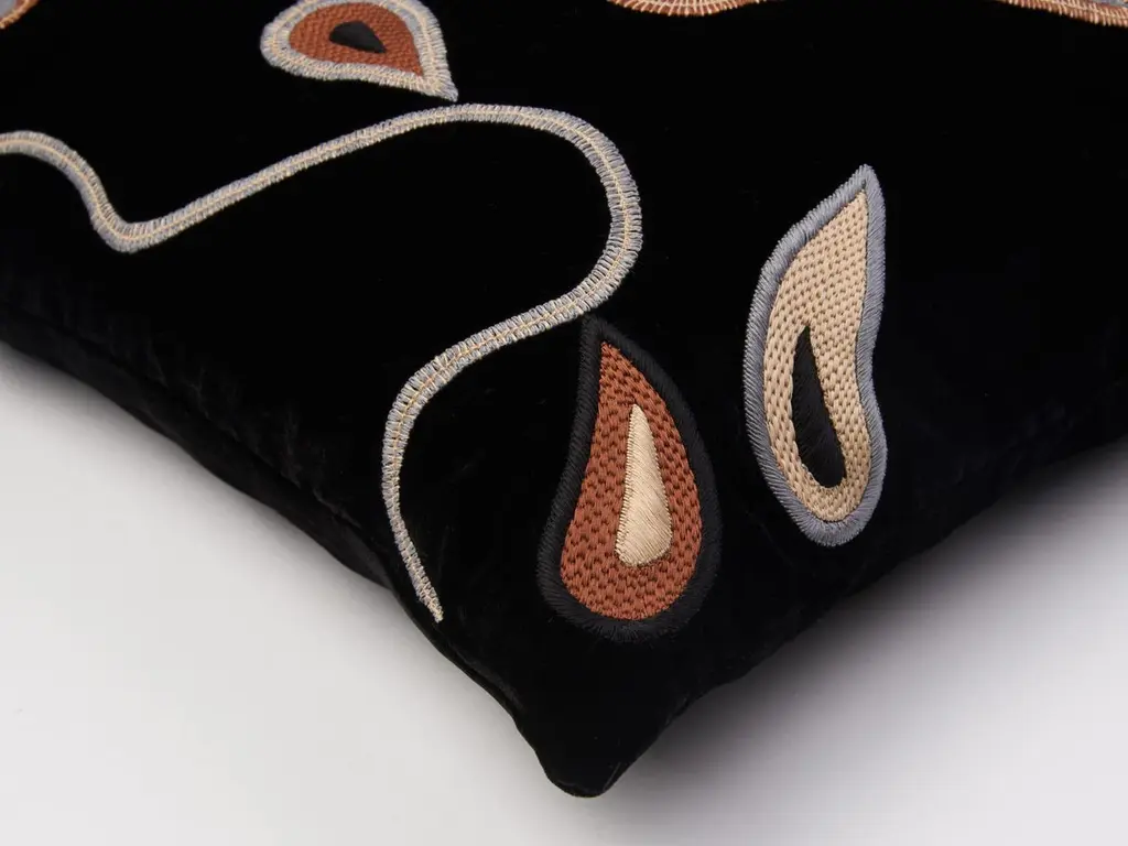Intricate rich textures set in an interesting colour combination embroidered by hand. Black silk velvet cushion cover with an intricate design entirely embroidered by hand. Standard size 80 x 40 cm. Customisable in other sizes, colour combinations or fabrics on request. Based in the Netherlands and India's Uttar Pradesh, Jupe by Jackie is an internationally renowned fashion and interior brand born out of a desire to shine light on the art of hand embroidery: a dying Craft in today’s fast-paced fashion industry.