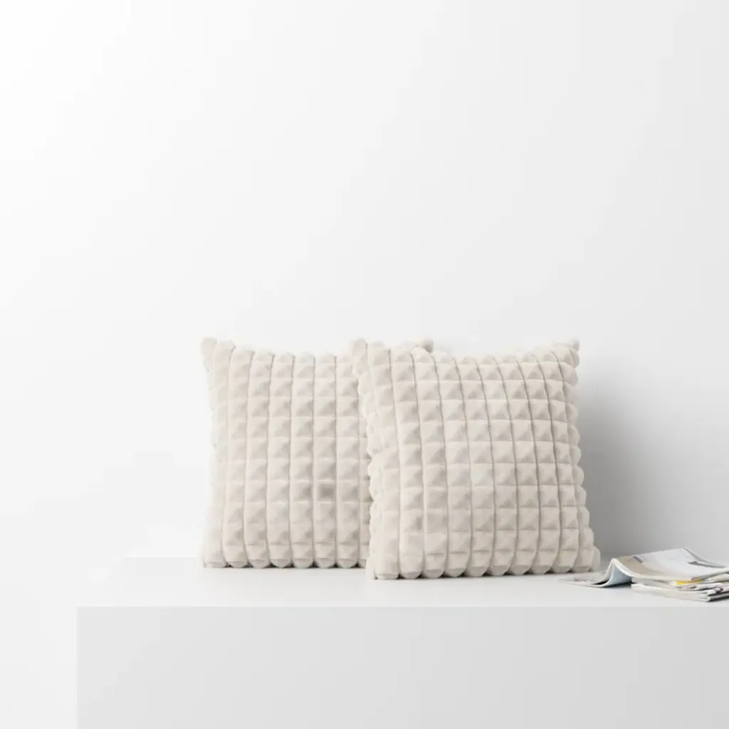 Enliven and cozy up your home with our plush and chic pillow set. A grid pattern is embossed to attain a richly textured and graphic presence. The three-dimensional appeal of our pillow is accentuated by the plush textures of faux fur. Featuring a cozy and intriguing tactile feel, it remains a fun and fashionable addition to any corner. The pillows showcase a versatile beige color to make a stunning statement on your sofa, bed, or armchair.