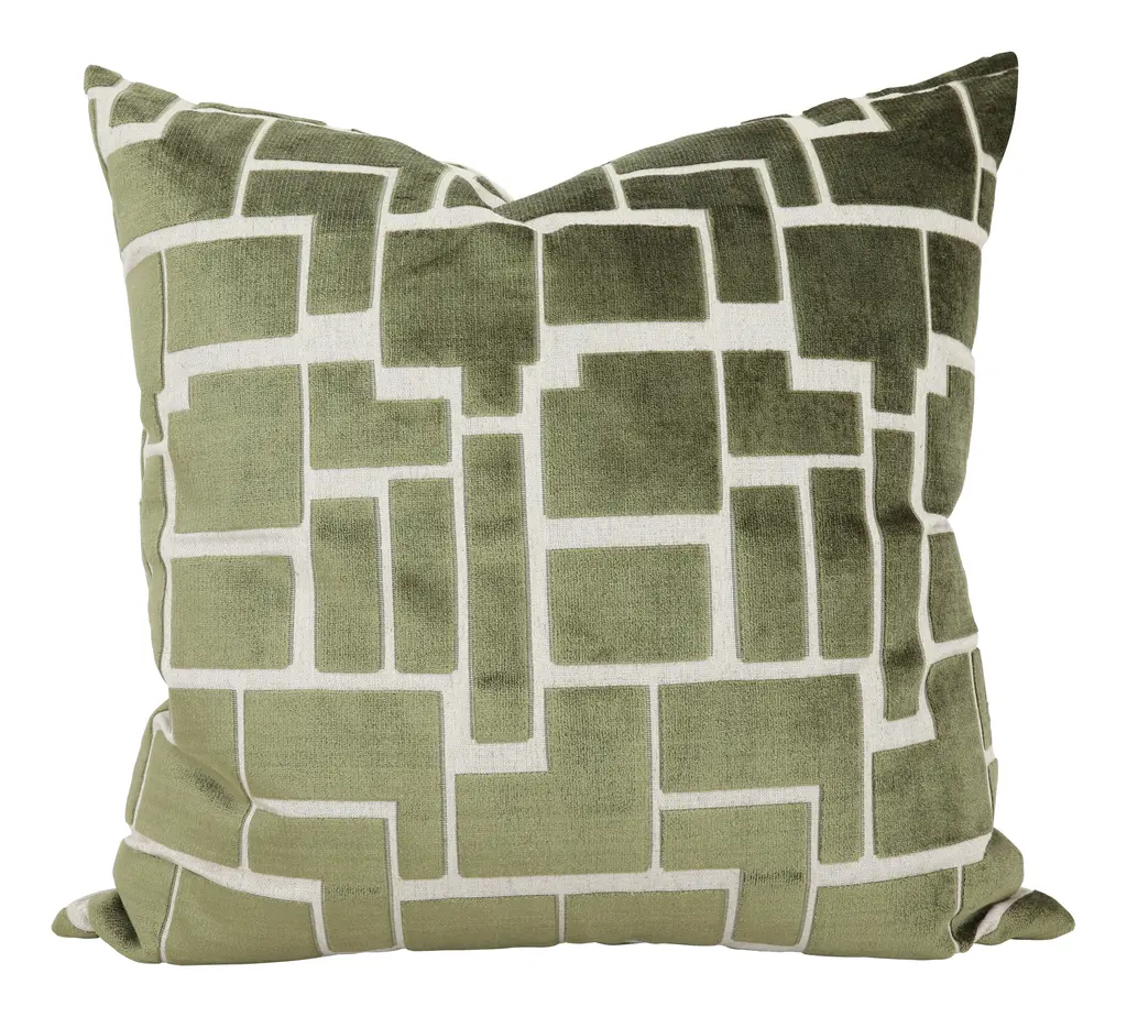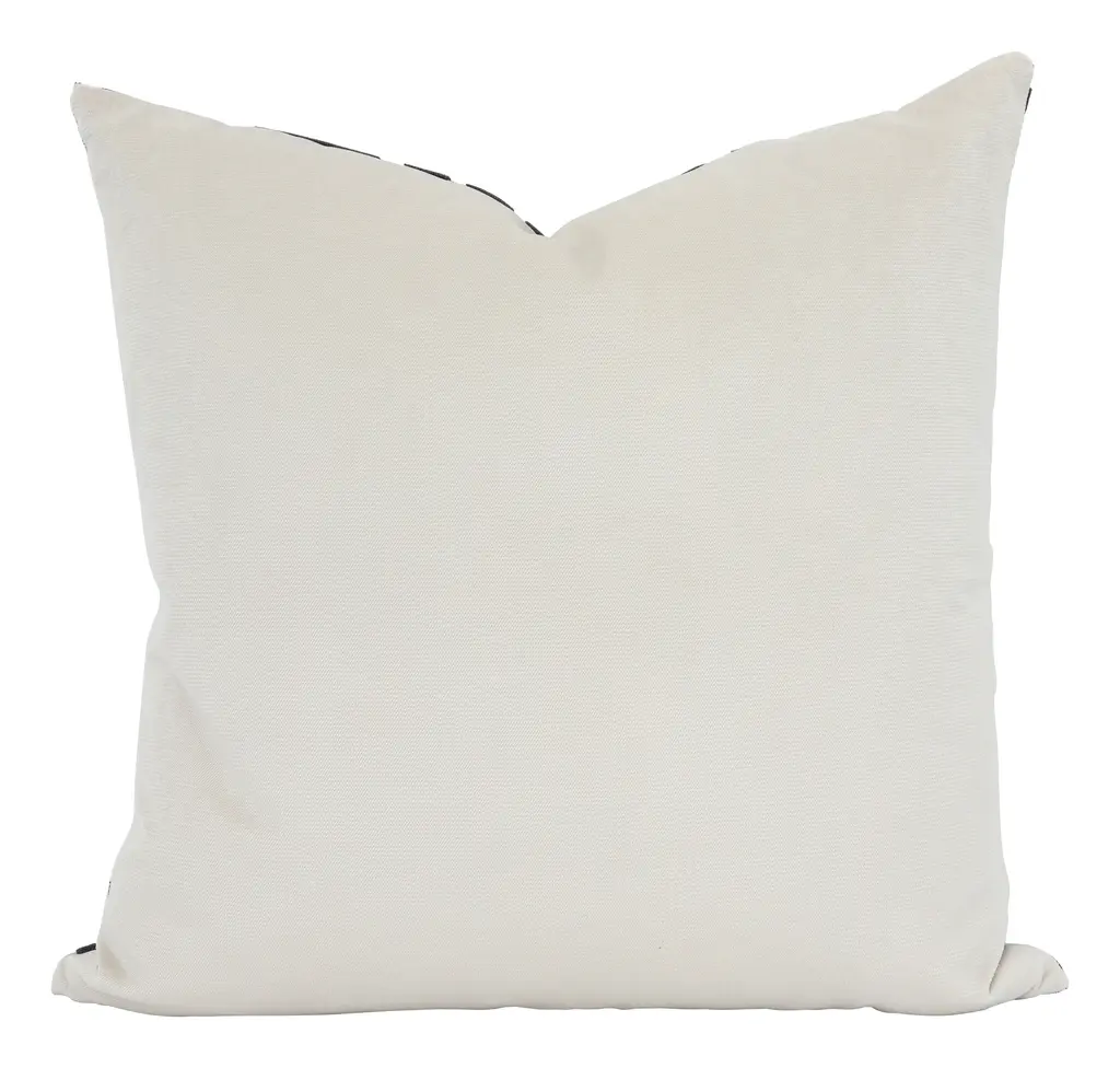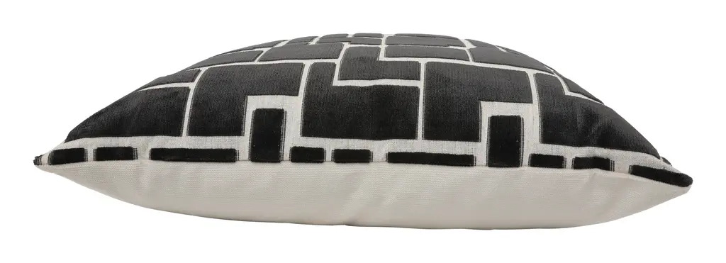 Get lost in our velvety Labyrinth Charcoal Pillow’s modern, maze-like design. This simple geometric pattern is made up of irregular, blocky shapes in charcoal grey on a white ground. We’ve paired it with a matching solid white velvet backing, a hidden zipper closure and a plush down and feather insert for a luxurious feel. Perfect for adding visual interest to a solid-colored armchair all on its own, Labyrinth’s neutral palette also makes it easy to mix in with other layers on the sofa or bed. •approximately 24" x 24" •rayon, polyester and linen blend •cut velvet design•white rayon, polyester and linen backing with velvet texture •knife edge •hidden zipper closure •down and feather insert