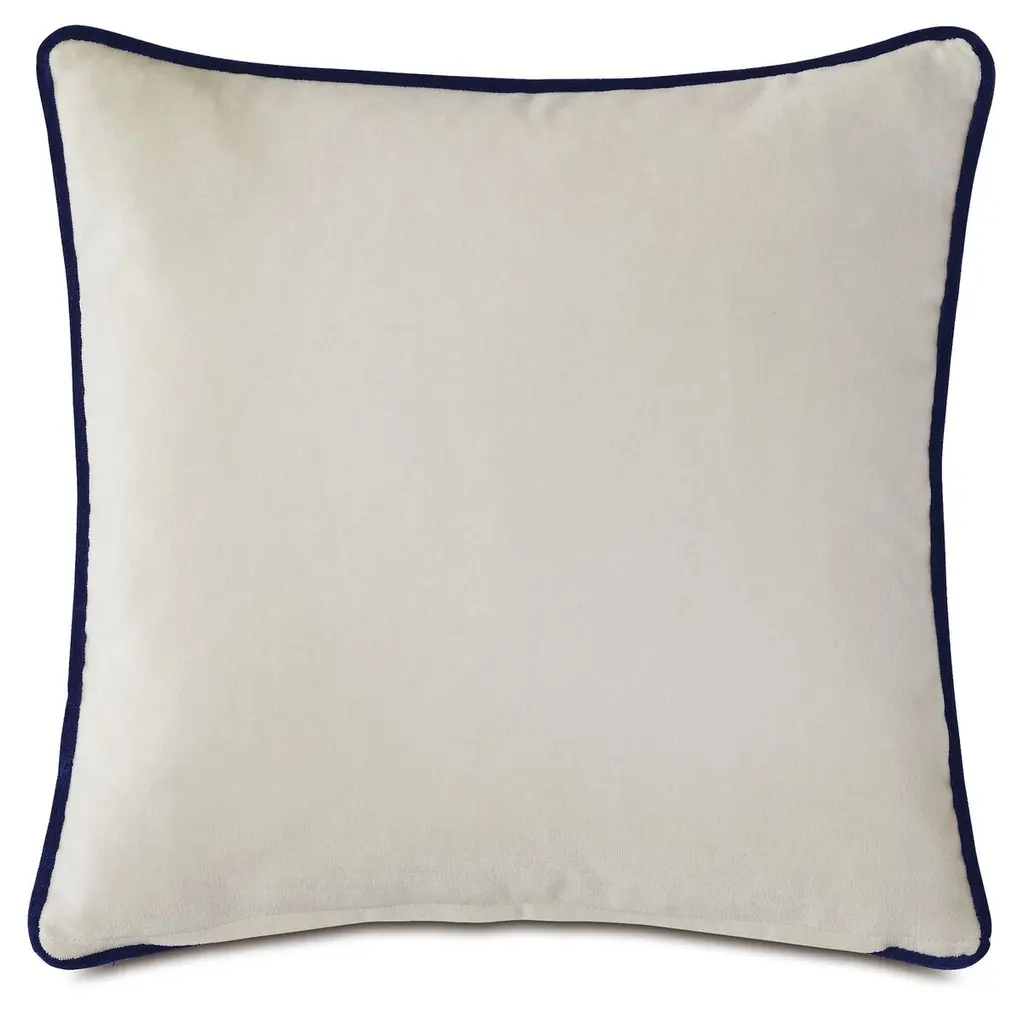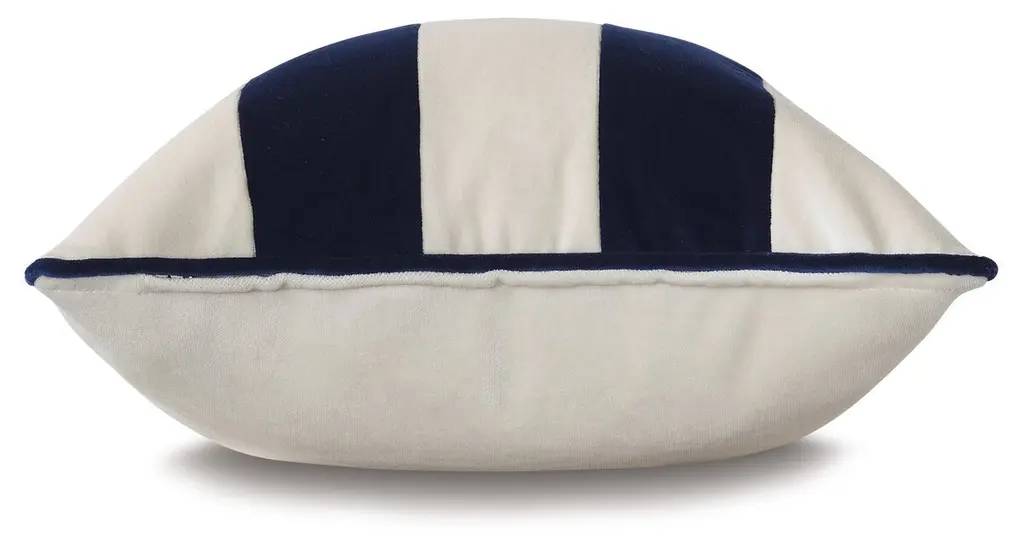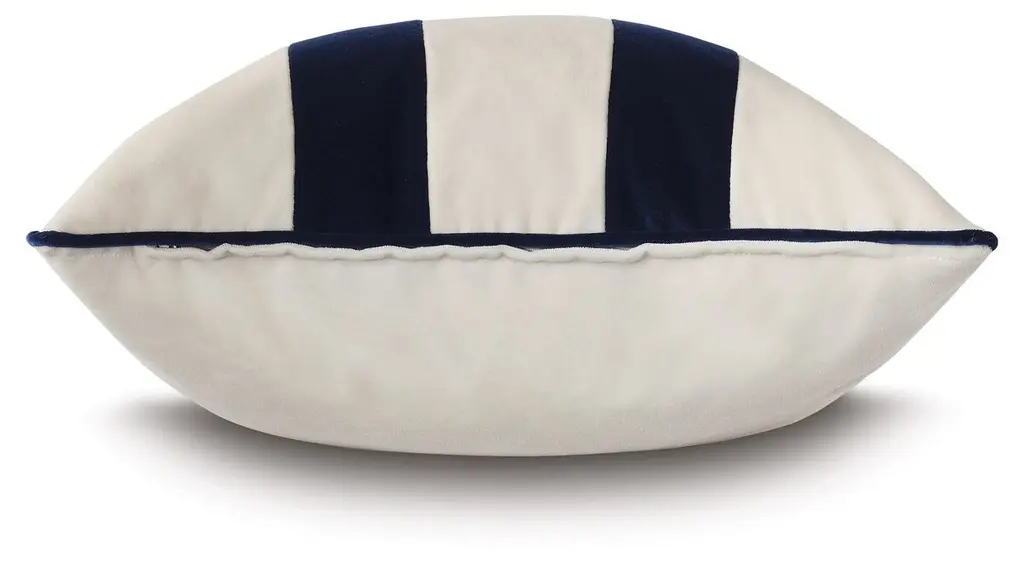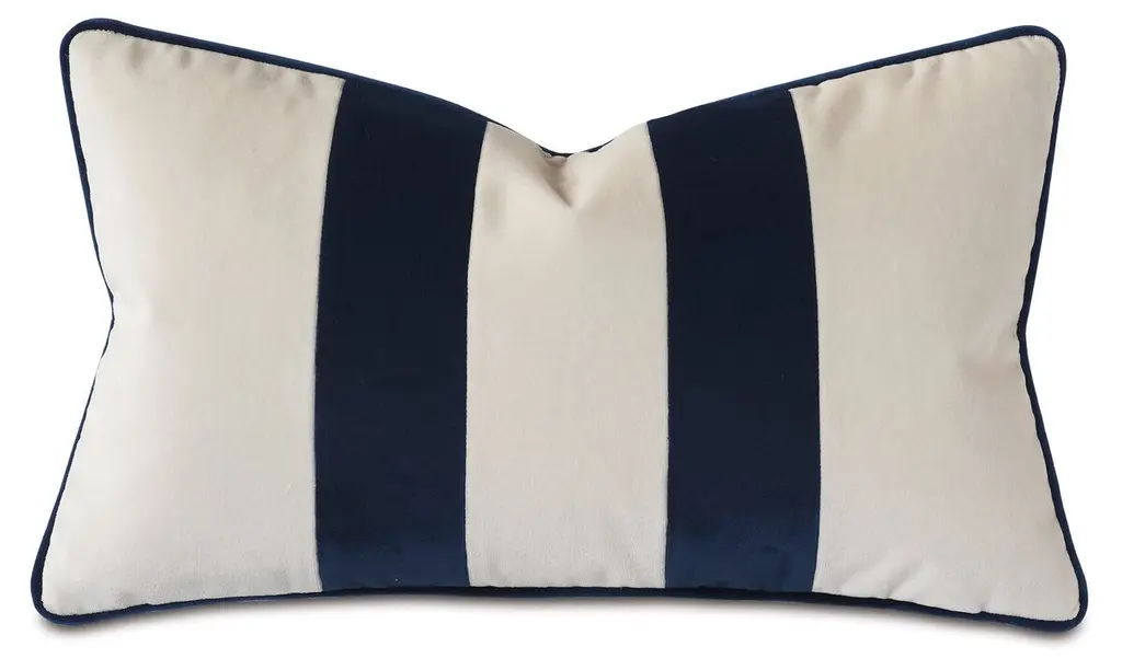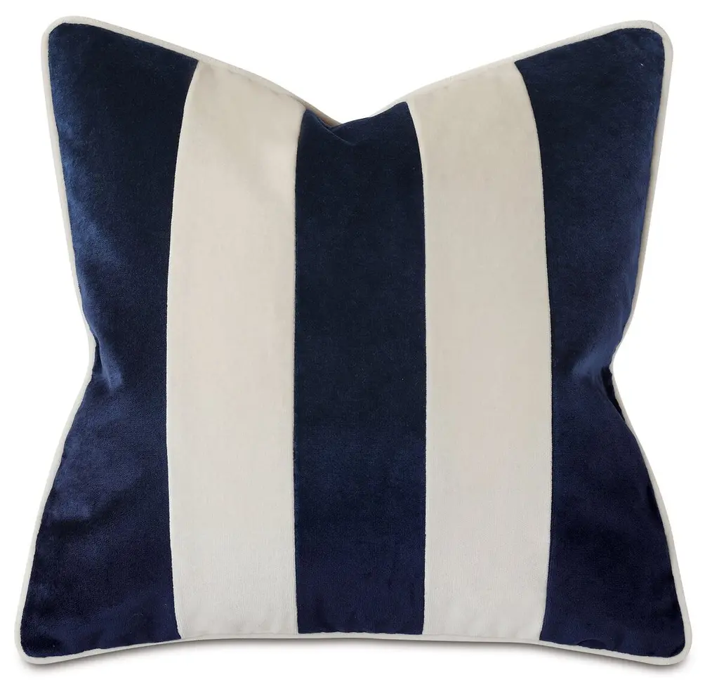 Exclusive to One Kings Lane: Two navy stripes on the front and matching welt give this crisp cotton pillow a nautical glamour. The small-feather fill ensures luxe loftiness. Hidden zipper closure.