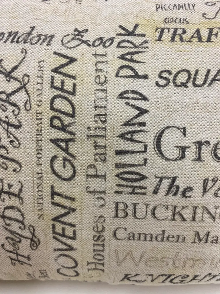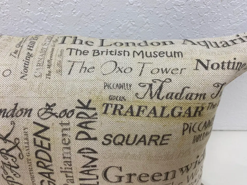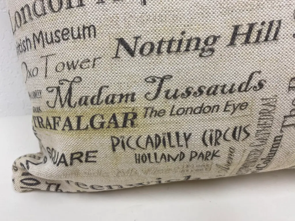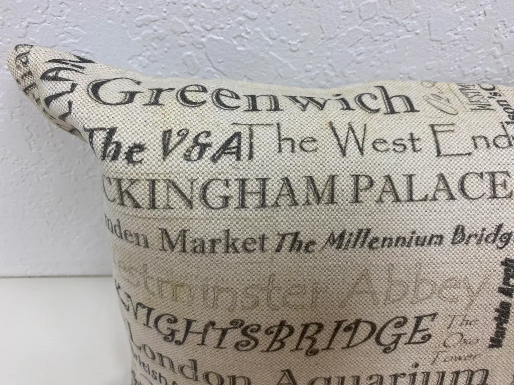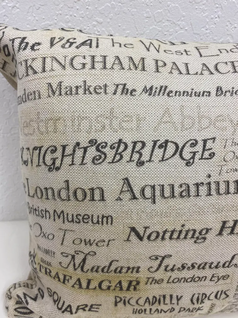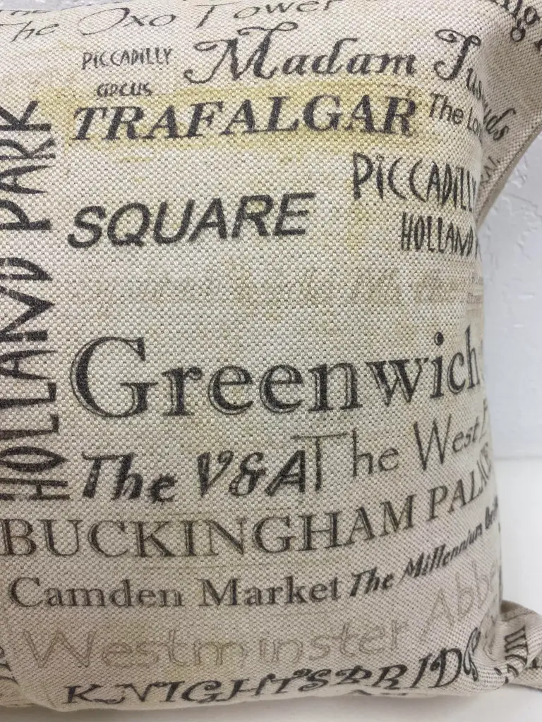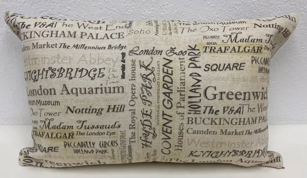 Large Bolster Pillow Plastered With The Names of London's Most Popular Tourist Attractions - Made in UK. Measures 24" X 7" X 15" This nostalgic London Tourist attraction bolster pillow was made in Wales, UK., by a small cottage designer/manufacturer owned by a lovely couple. The cover has a hand painted look. Nice mixture of London's most famous attractions. This pillow has not been used. The cover is made of linen (53%) and cotton (47%). The cover measures 15" x 24" and the feather insert is 17" x 25" to give it a nice full look. Dry clean only. Pillows are sold only with insert. For other designs and sizes, please check our shop here.