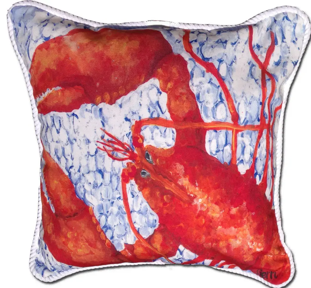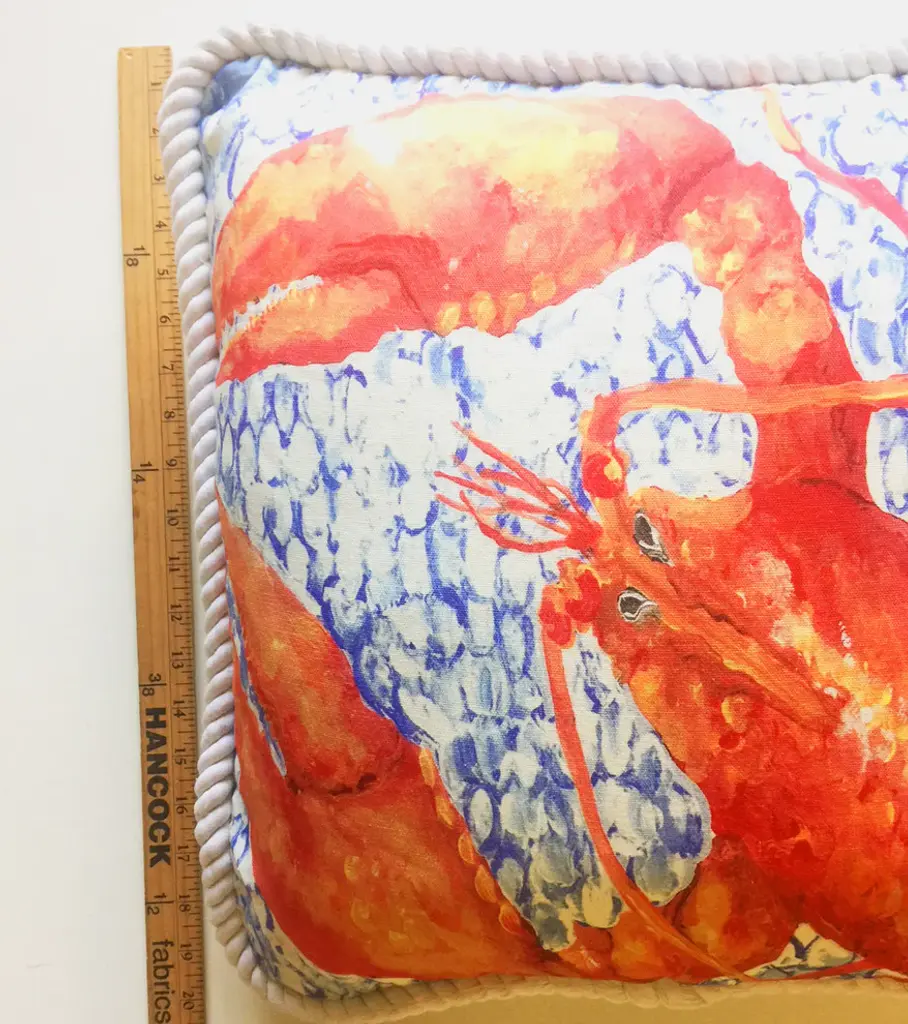 Lobster Pillow Is Bright And Cheerful In Shades Of Orange, Red And Blue. Trimmed In White Nautical Braid, it is sure to add a pop of color to your beach house or mainland home! You''ll love the colors of orange, red, and blue.This big coastal pillow has a zipper on back so you can easily remove the cover and machine wash the cover! Pair it With Crab Pillow for a great coastal look. Original lobster art by Gerri Hyman.
