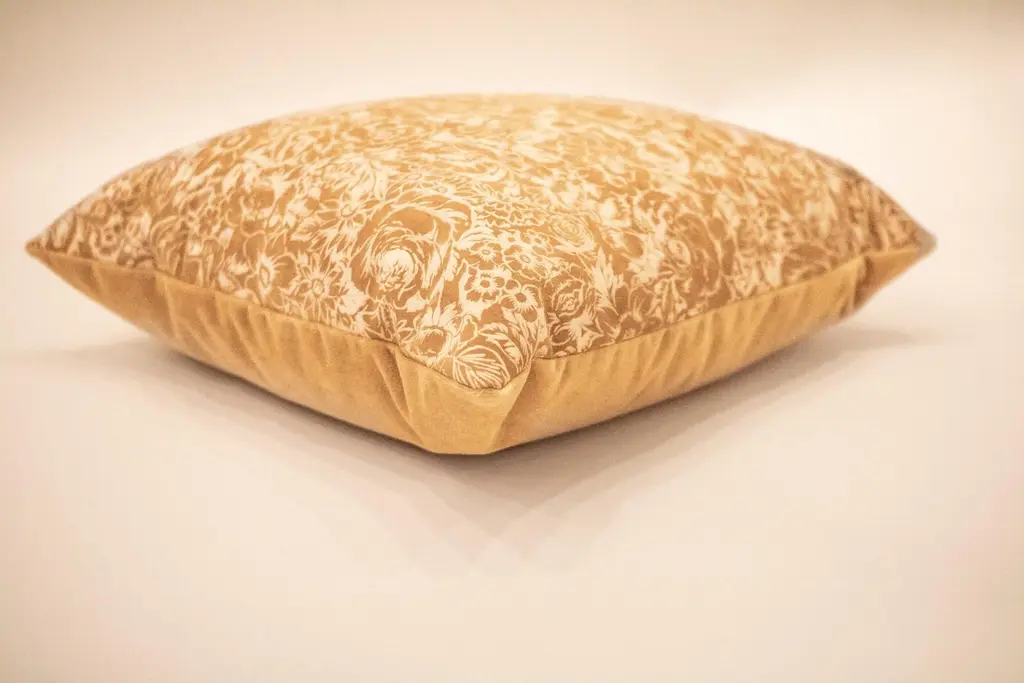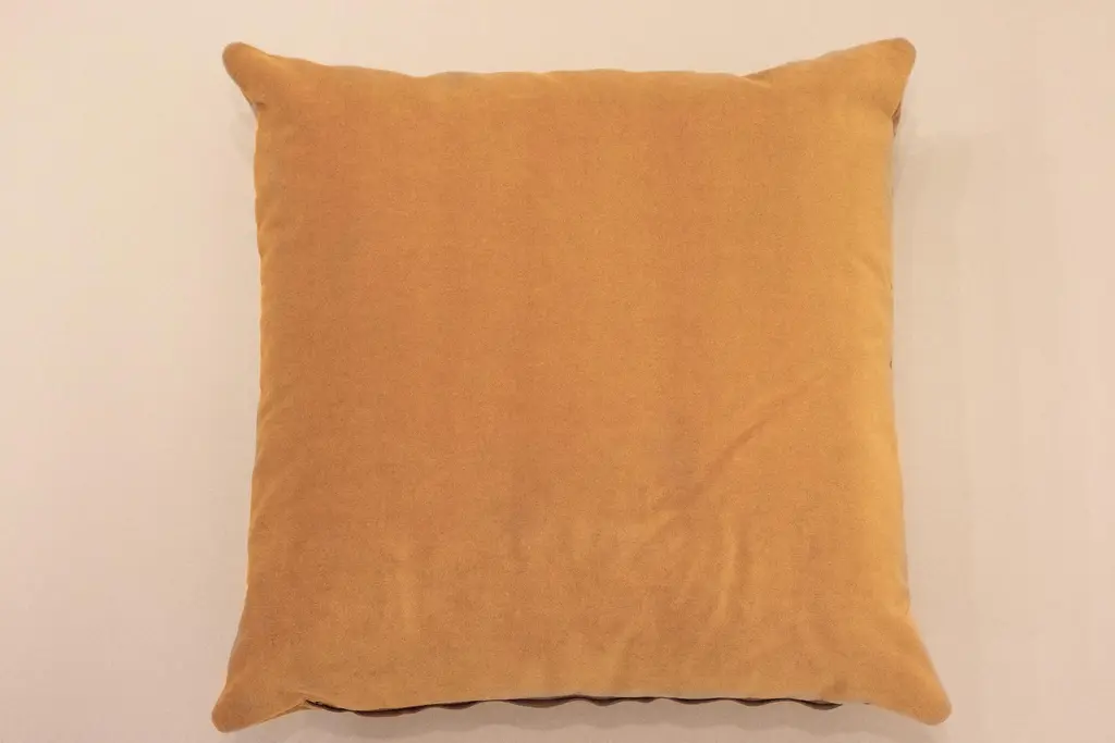 Made in the USA, this is made with an Italian artistic suede with textured white flowers. The backside is a color matching cotton velvet. It has a hidden zipper and fiber insert.