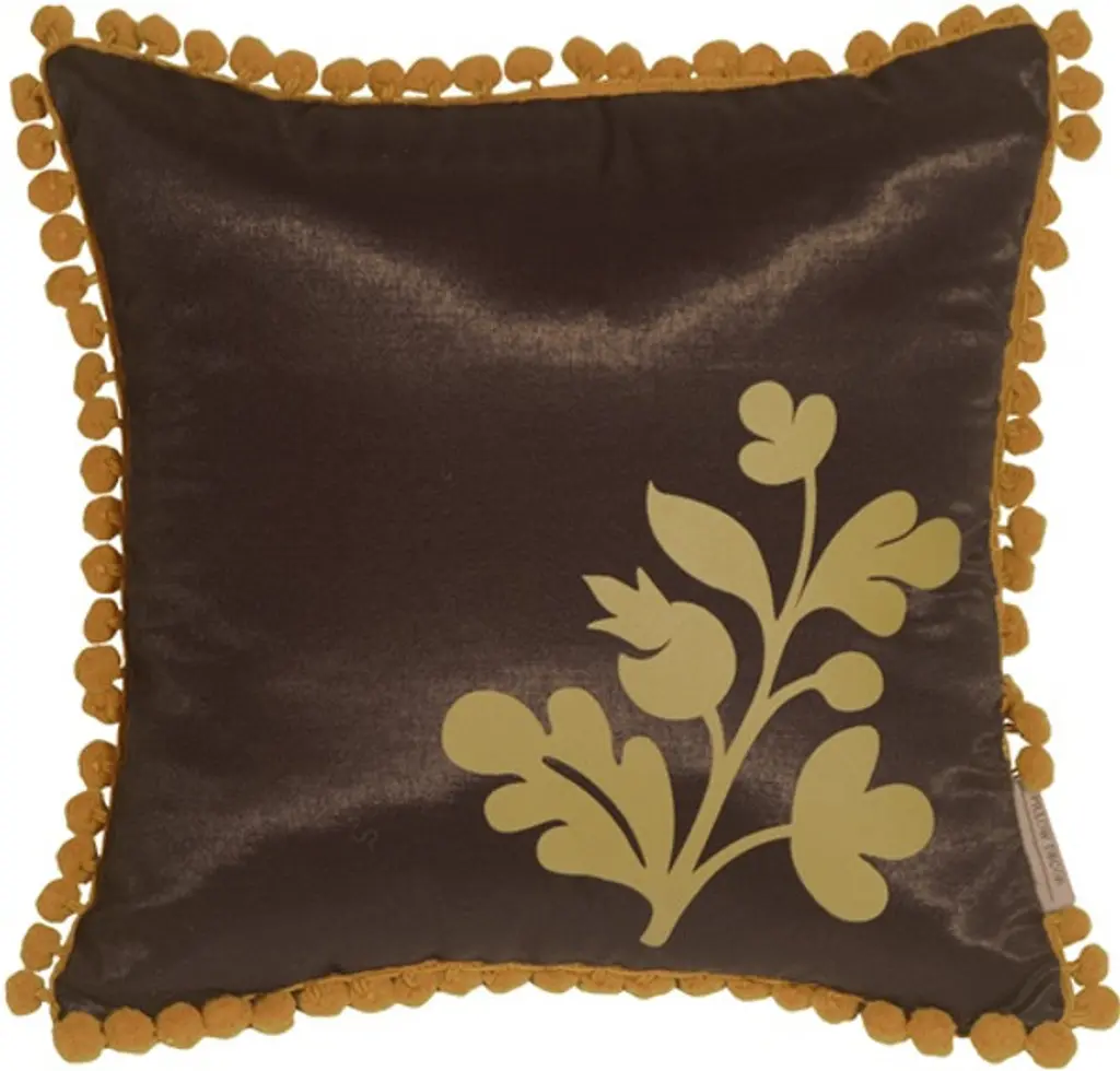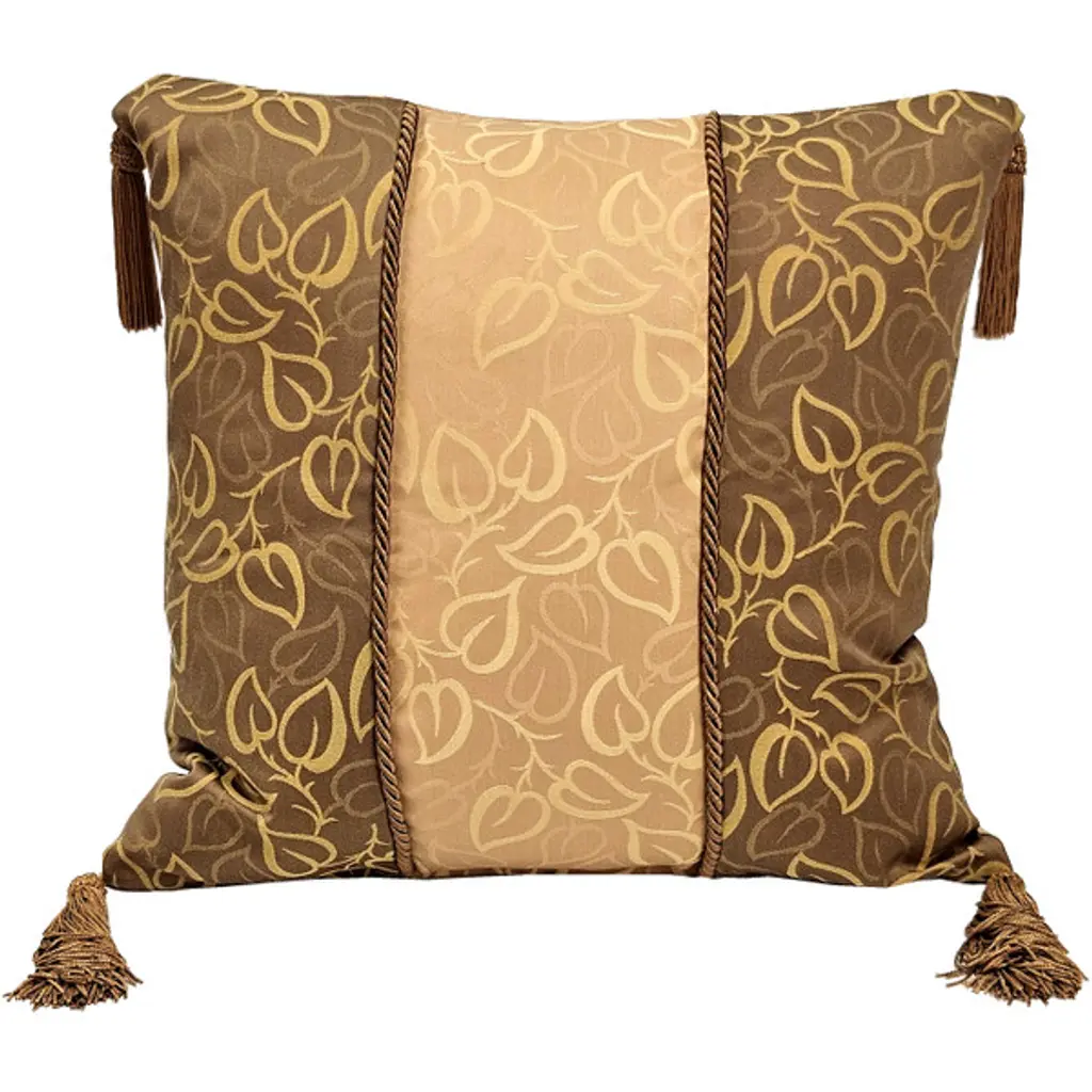 A diverse mix of textures and colors make this leaf printed pillow so versatile! Soft yellow golds are the predominant background color of the fabric, with taupe, soft cinnamon and camel threads woven in for depth. Adding contrast are textured chenille leaves in camel and cream. Each corner is embellished with a tassel in soft silky gold. This pillow works with so many decorating schemes, you'll want to incorporate the whole series into your home! Enhance a window seat with this pillow, along with solid color pillows in faux suede. Mixed with solid colored silk pillows, this fabric brings a beautiful casual elegance to a neutral color scheme in a master bedroom. Combine this pillow with other textured fabrics and coordinated striped pillows in a family room or den for a warm and soothing accent. Transform a dull neutral toned room with texture by adding a pair of these pillows, along with some coordinating striped pillows for punch. Size: 17"x17" Square Fabric: 70% Cotton, 30% Acrylic fabric content Same fabric, front and back Knife edge seams Color matched zipper closure