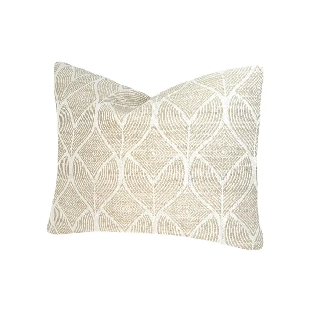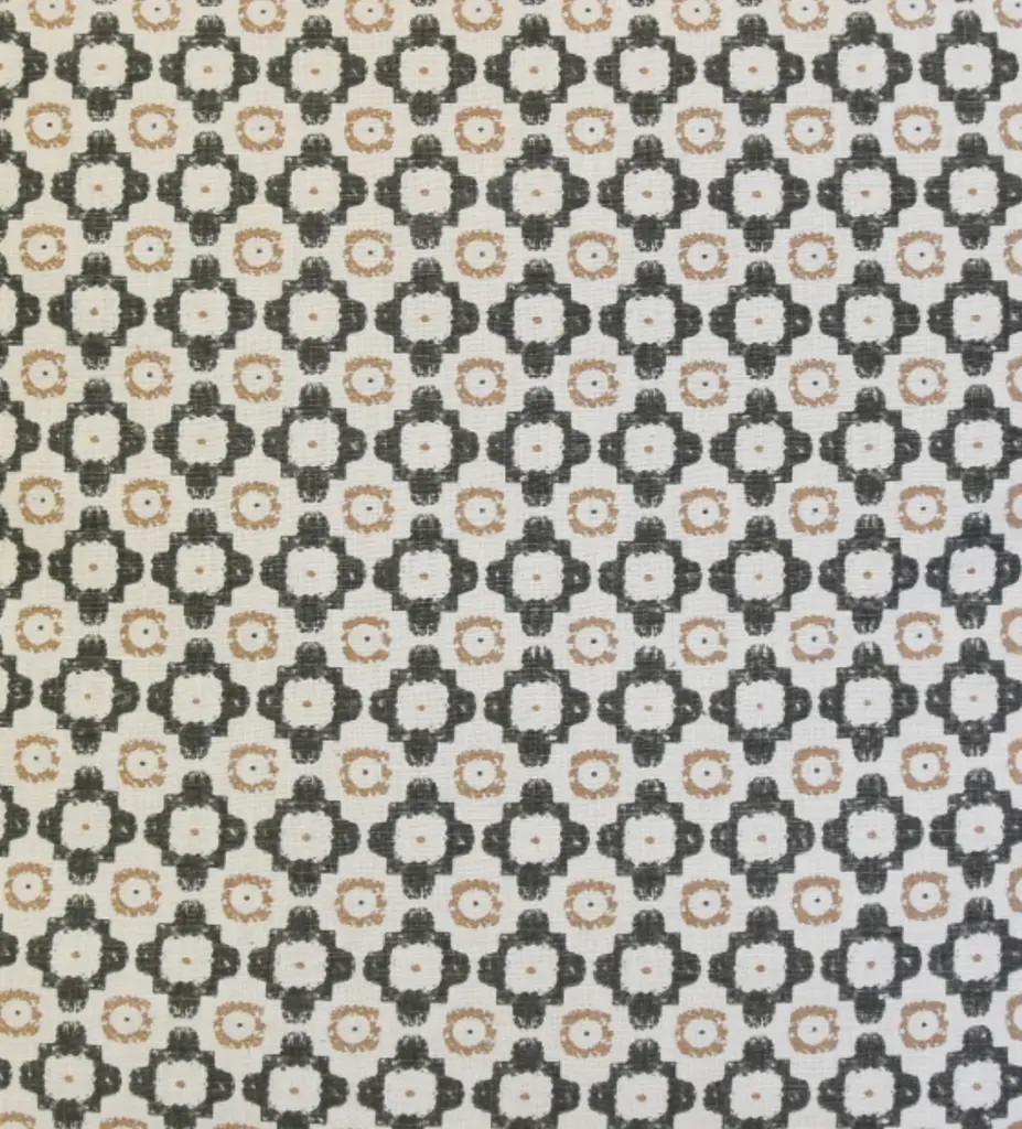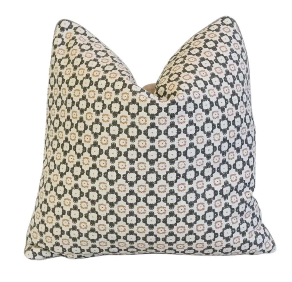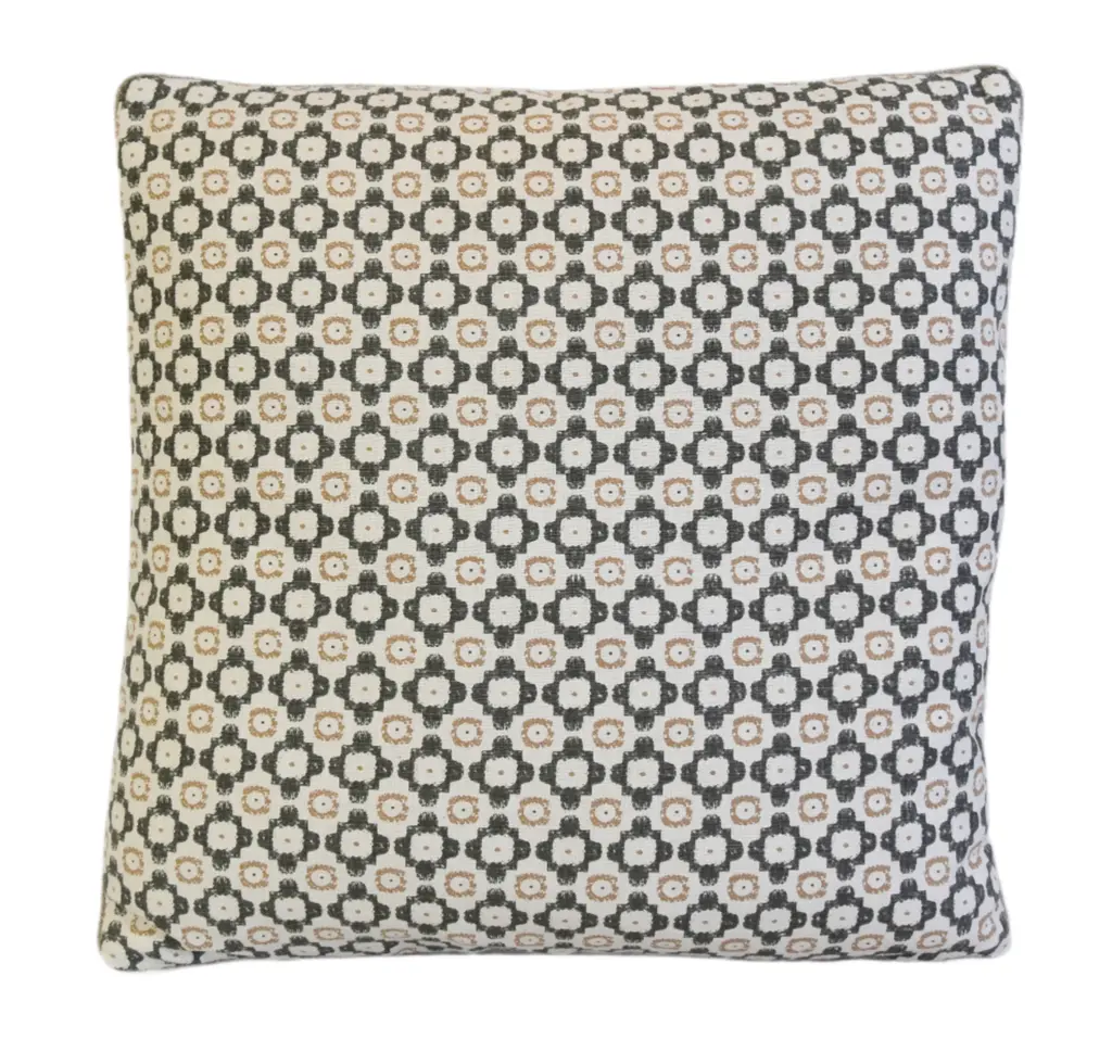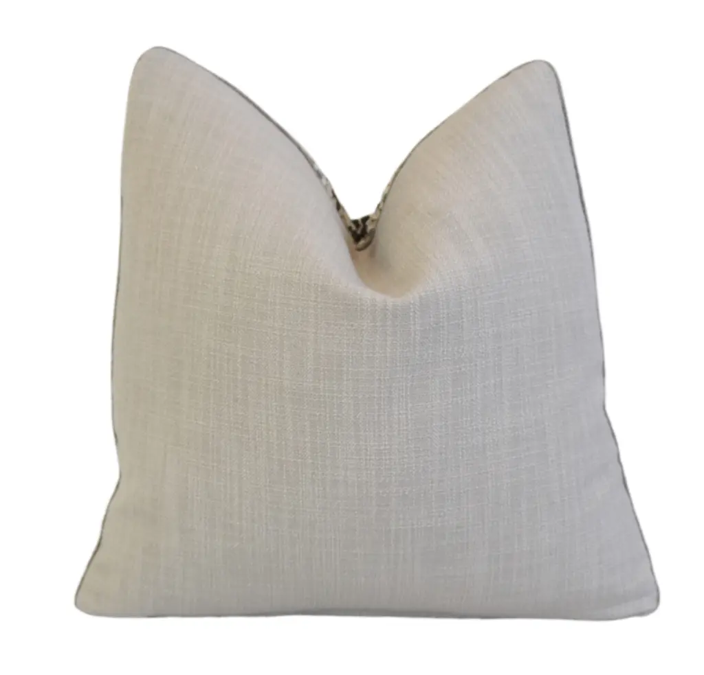 Custom-tailored pillow in designer Lee Jofa cotton fabric called "Ambit Charcoal�� depicting a stunning natural palette design. Brown-tan woven linen fabric reverse. Custom cord piping trim. Zipper closure. Generous plump goose feather-and-down insert. Excellent new, unused beautiful condition!!