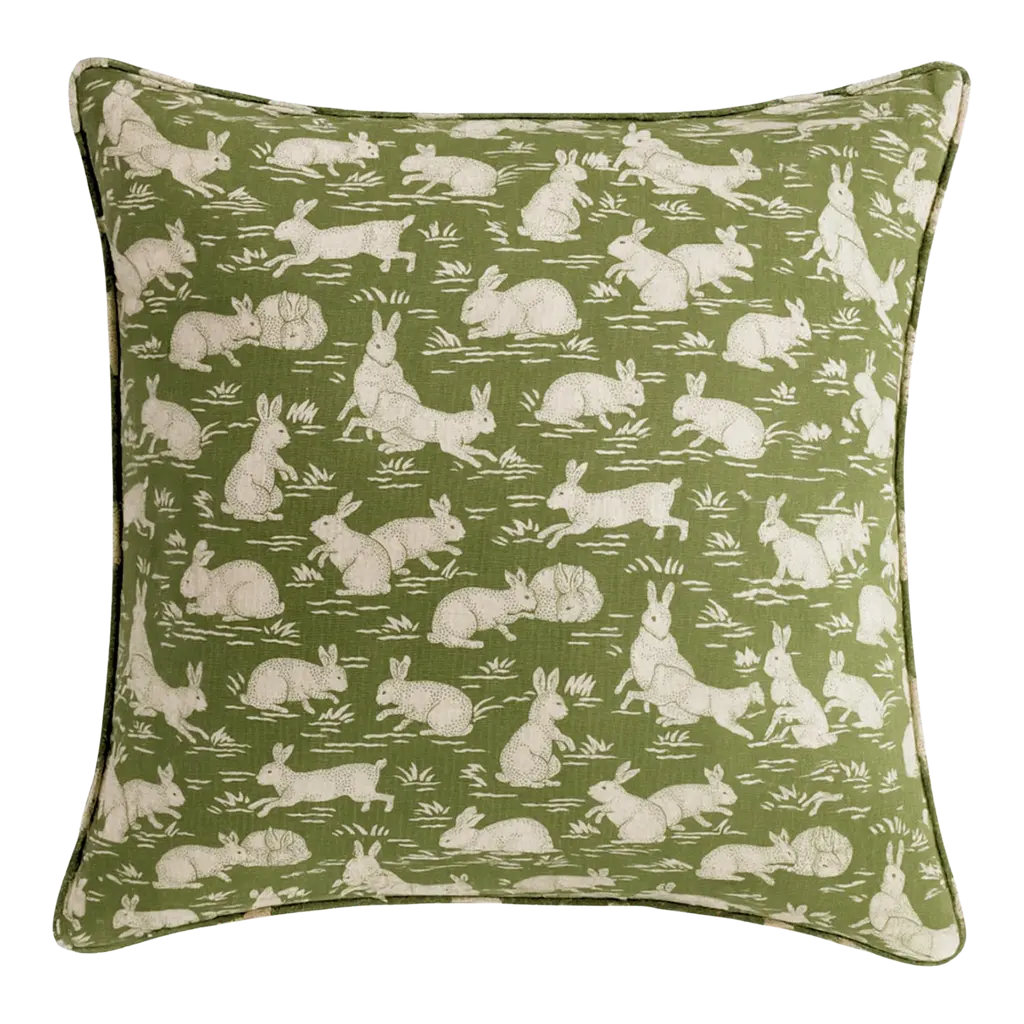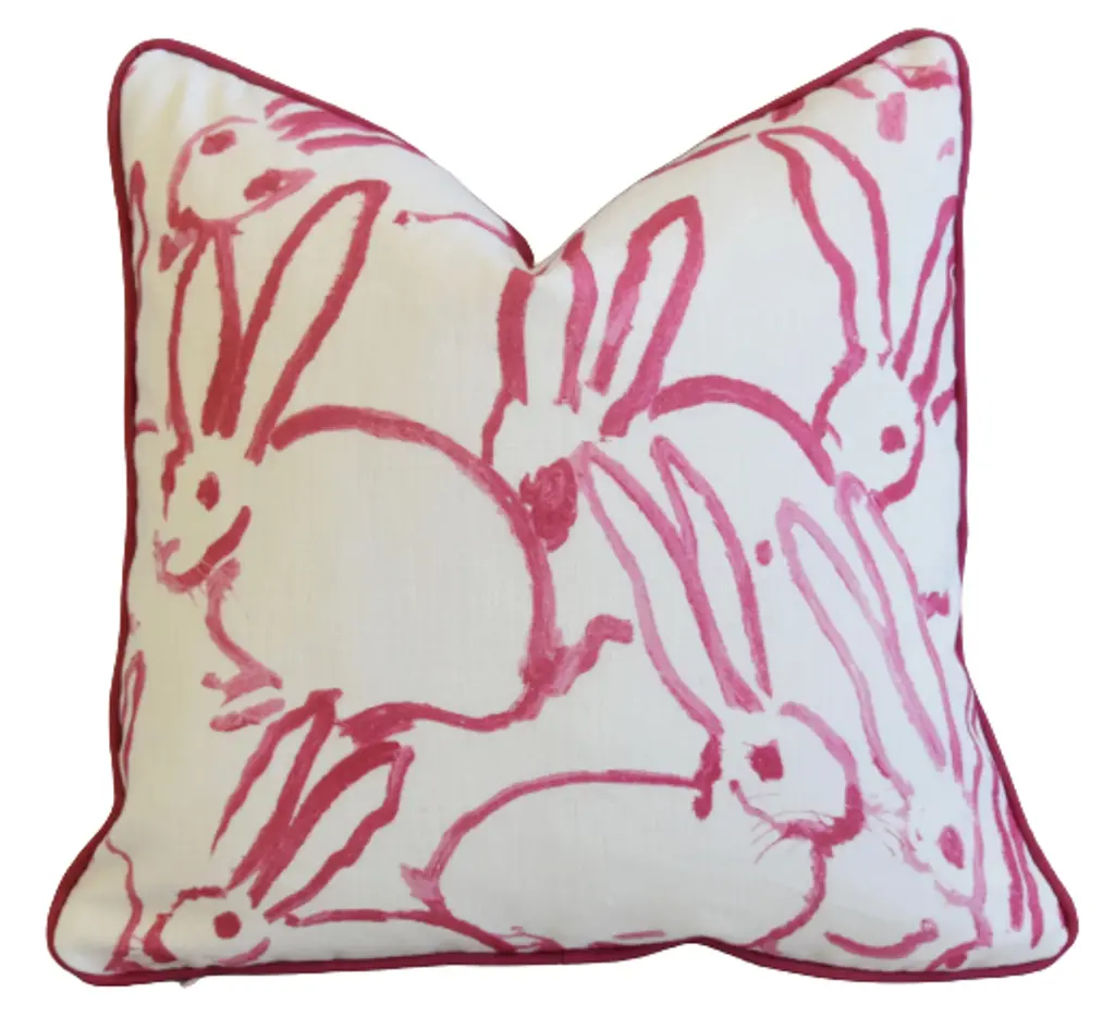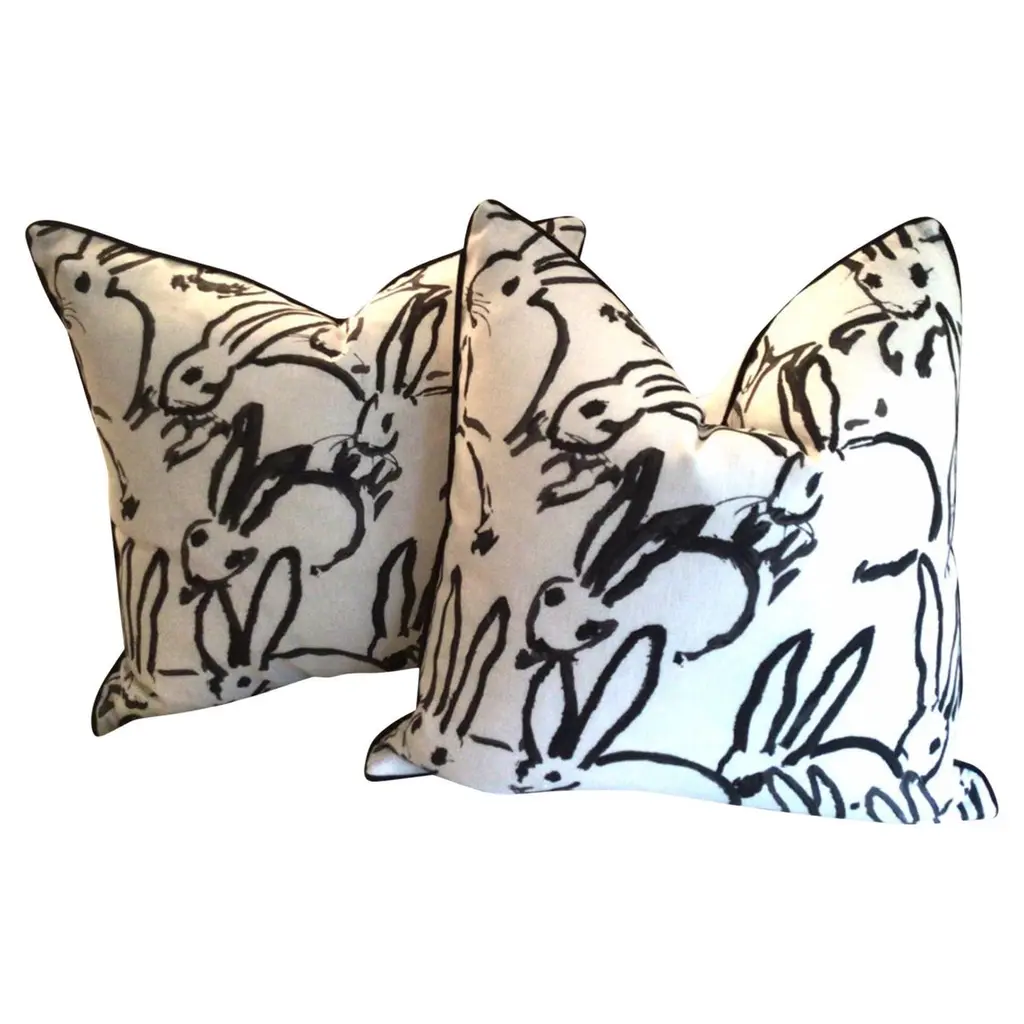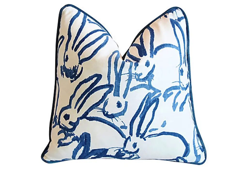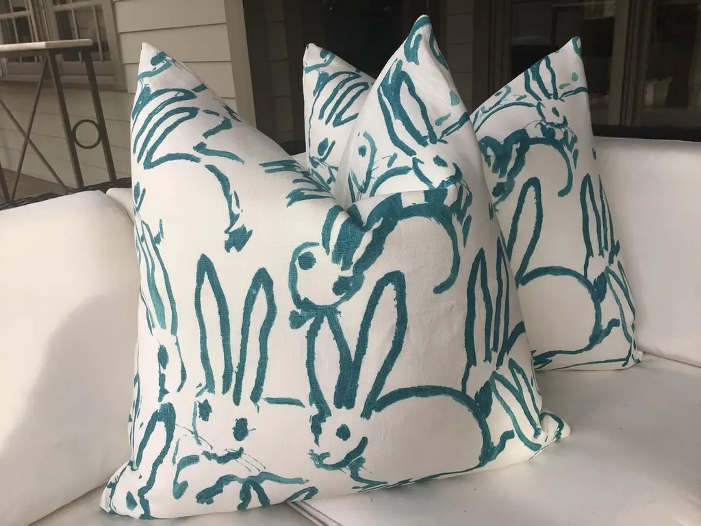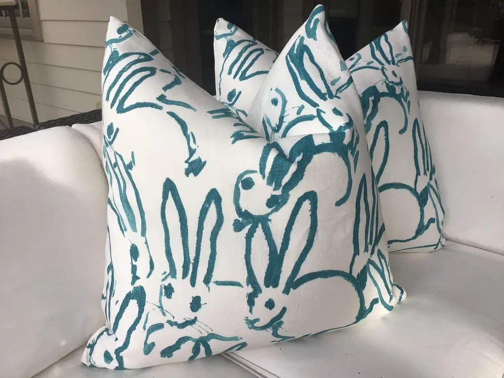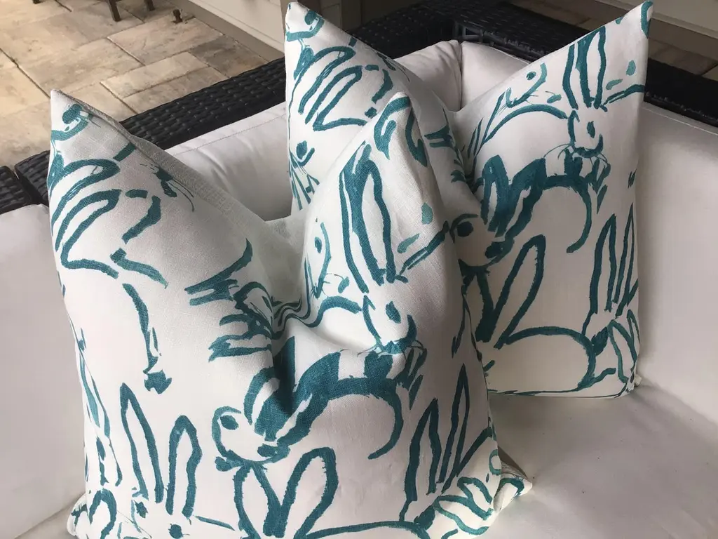 We're obsessed with this happy fabric - in all colorways and incarnations! From Groundworks by Lee Jofa comes this charming yet utterly sophisticated printed linen fabric. "BUNNY HUTCH" is a striking replication of the painting by Hunt Slonem, featuring his signature cross hatch painting style and replication technique.In teal and white (the colorway is labeled "Turquoise"), these pillow covers have been fashioned from this unique linen fabric. They are backed in a complimentary white linen fabric.This listing will come as a set of two 22” pillows, complete with down feather pillow inserts. About UsAt Accent Marks, each designer pillow is crafted with care using the finest hand-selected fabrics and trims, paired with durable, discreet invisible zippers. We specialize in creating beautiful, high-quality pieces that elevate your home decor. While most of our listings feature 22" pillow pairs, we also offer a range of sizes and single pillow options to suit your needs. All of our Accent Marks pillows are proudly made in the United States.If you don't see the fabric you're searching for, please reach out via message as we have other fabrics available upon request and can create anything that you like. Thank you for visiting Accent Marks!