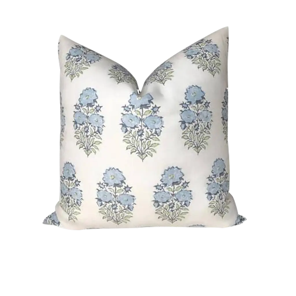 Bring a taste of the Orient to any space with one of our custom-created square Indian block print down filled pillows. Each pillow is made of soft cotton and hand block printed by our artisans in India. Set on a pale yellow background, pigmented orange flowers with blue foliage flank both sides. A down-fill insert is included with each pillow. The corners are knife-edge, with a hidden zipper on the bottom. This limited edition is inspired by the home of Lee Radziwill at 4 Buckingham Place. Radziwill hired Italian designer Renzo Mongiardino who enveloped the space with various hues of block print fabric on the walls, devan, and lampshades. Indeed a statement room! Dimensions:16" Wide16" Tall6" Deep.