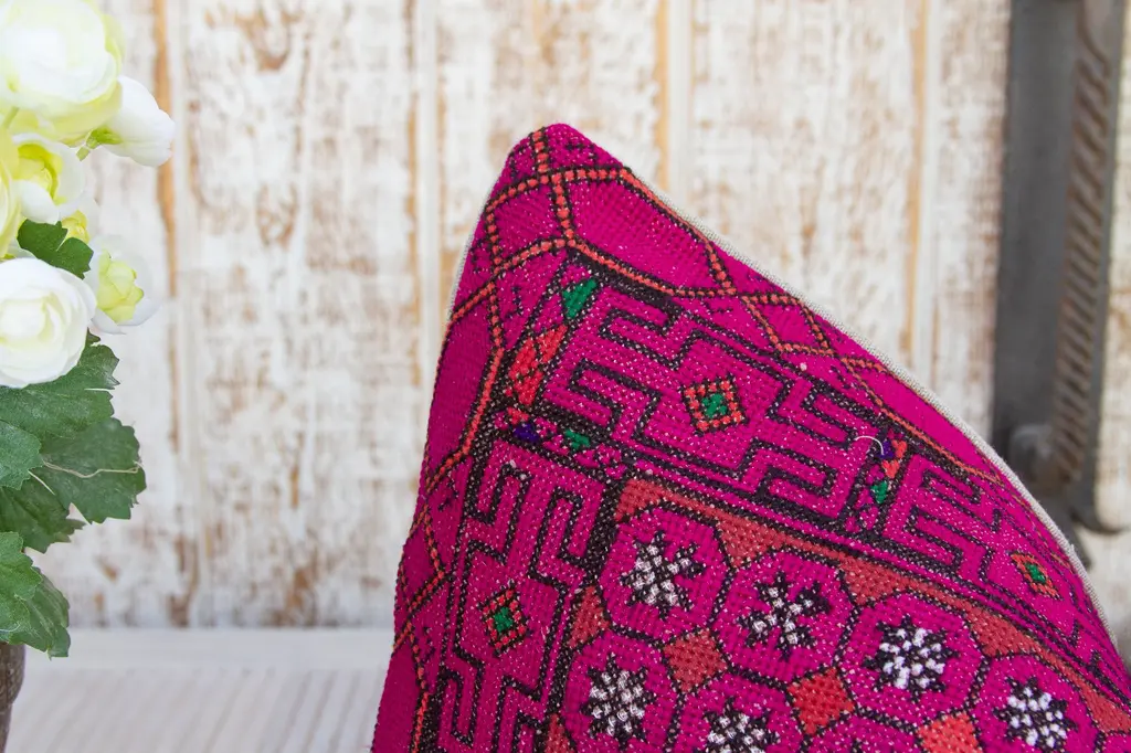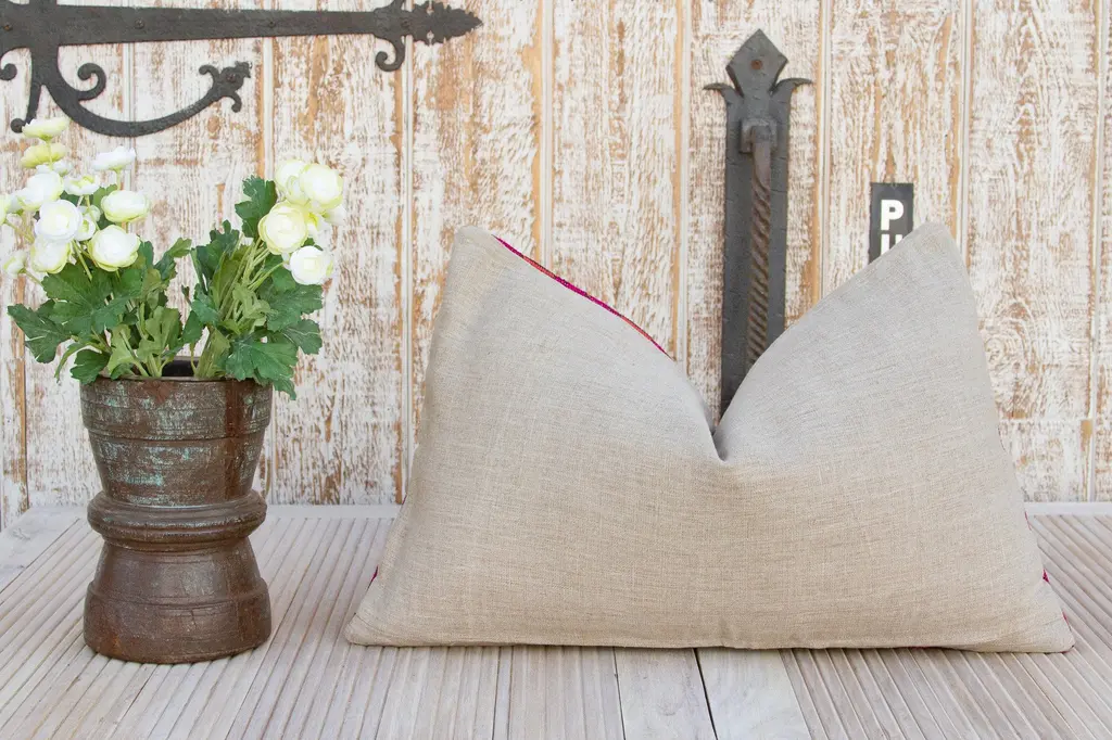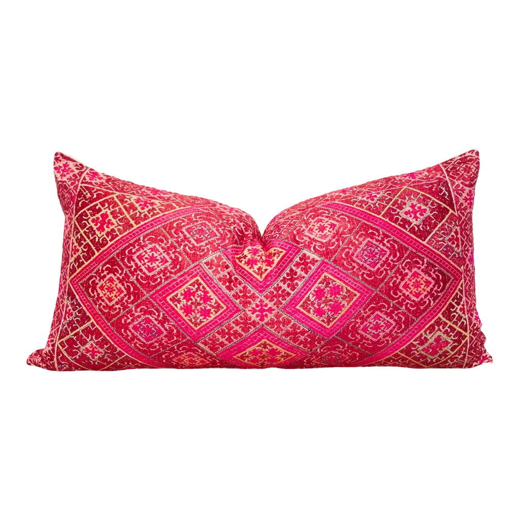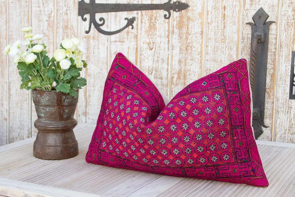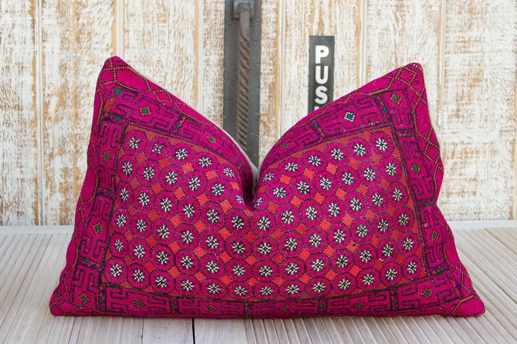 This gorgeous throw pillow is made from antique one-of-a-kind textiles like Bokhanos and Thalposh. Bokhanos are long narrow shoulder cloths that are given by to a groom from his future mother in law for his wedding day and a Thalposh is a dowry cloth, made by the bride’s family for her wedding. These rare textiles are found in the Thar desert, the traditional textiles from this region are done in heavy cotton with fine cross stitch silk embroidery in floral and geometric motifs.