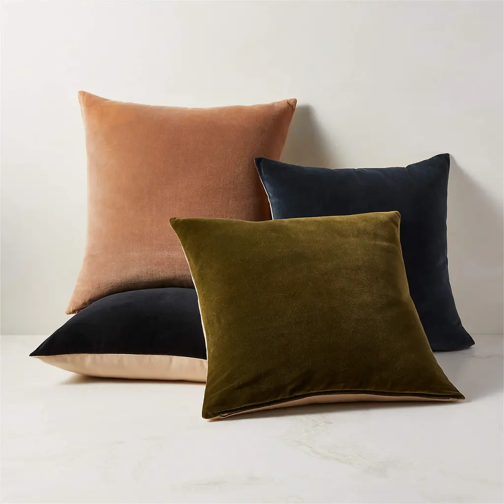 Soft and cozy in velvety cotton, dark teal pillow flips to natural cotton canvas. Perfect for a layering moment with other solid or printed pillows. CB2 pillows include a pillow insert in your choice of feather down or down alternative. CB2 exclusive.