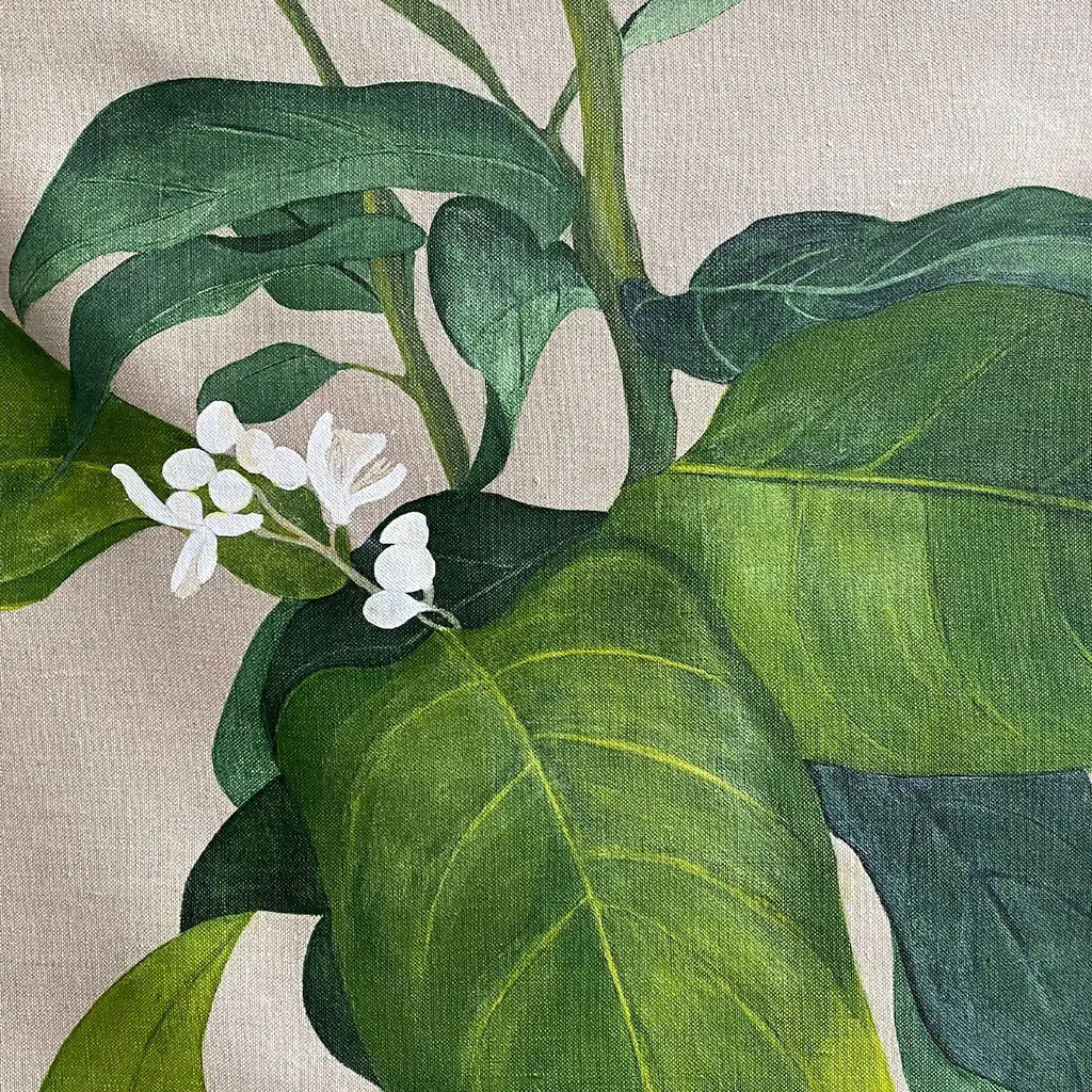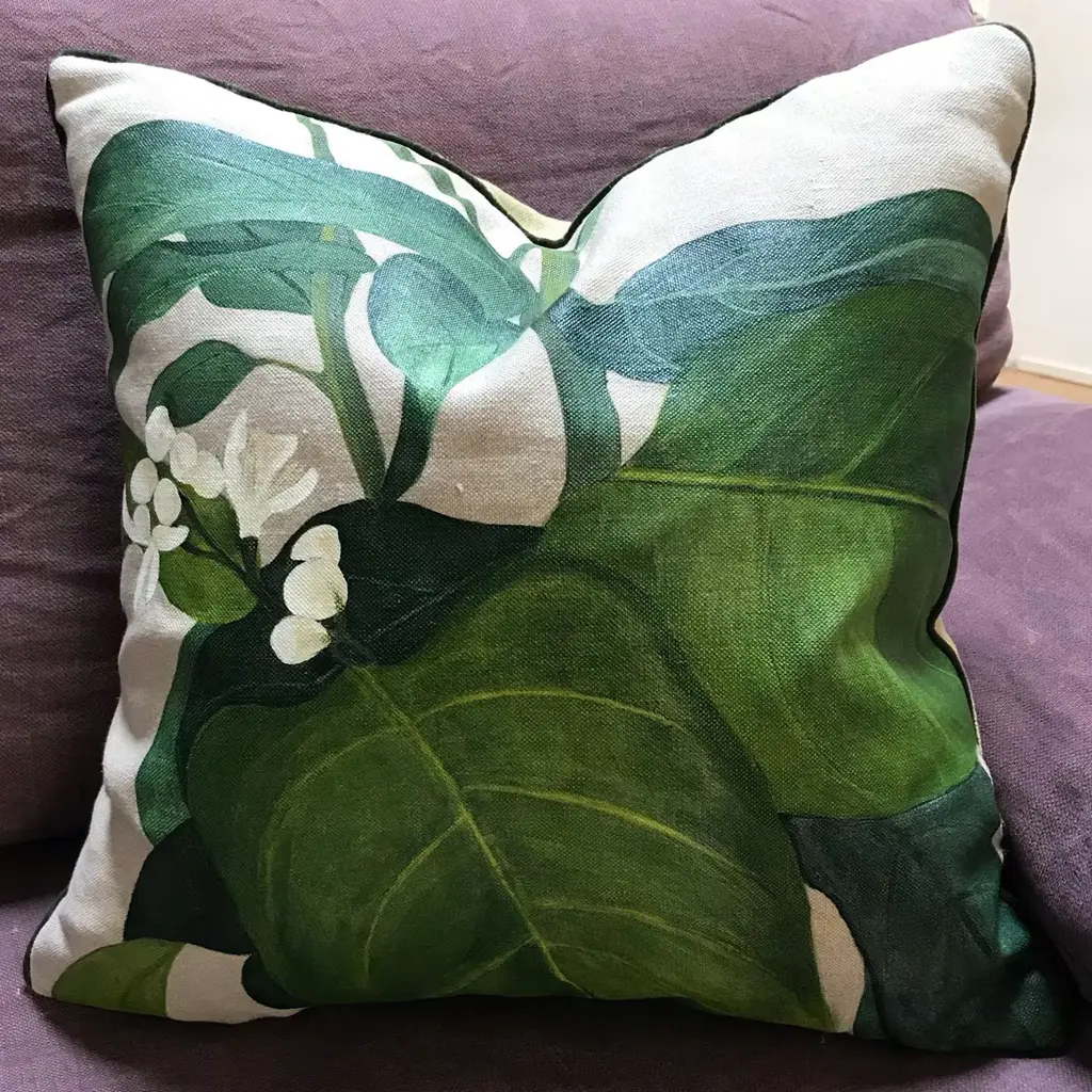 Lemon Tree Cushion is part of the Giardino collection. Finely hand painted on Linen. Velvet piping. Back of the cushion can be in different material. Limited edition. Giardino is a collection inspired by the beauty and grace of flowers. The spirit of the collection is to create a blend between images from Italian countryside and British gardens. Flowers, plants, leaves are reinvented and interpreted in a modern and creative way.