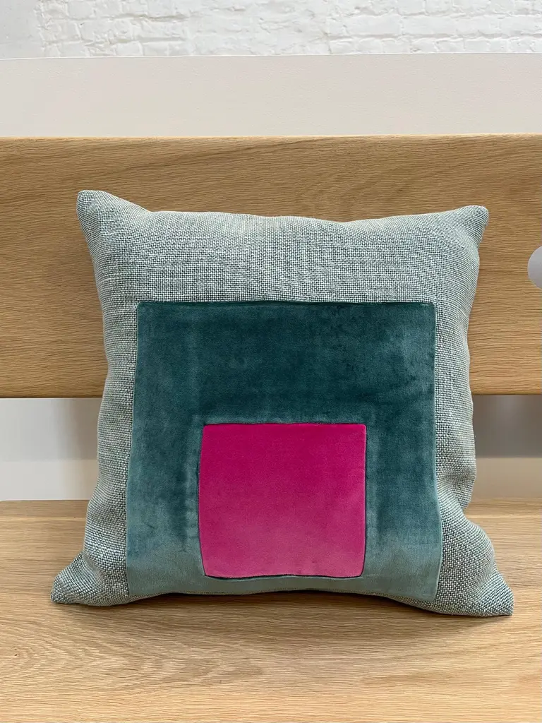 Under the theme of geometric abstraction, these cushions are made like paintings from our gallery’s high-quality and colorful fabrics. The approach comes from a reinterpretation of geometric abstract painting, based on simple geometric shapes like the square and pure colors. All this is related to realism and minimalism. Through this project, we pay homage to Josef and Anni Albers, Bauhaus-trained leaders of geometric abstraction. They carefully inscribed squares within squares, creating atmospheres that were at once peaceful and harmonically charged. To this end, we are spotlighting our craftsmen by reworking fabrics from the gallery.