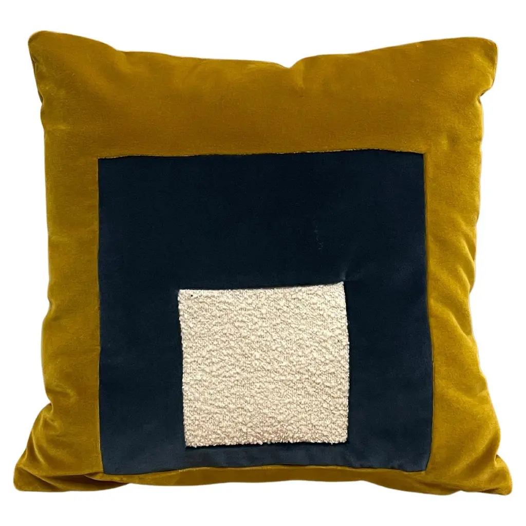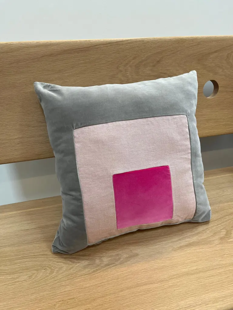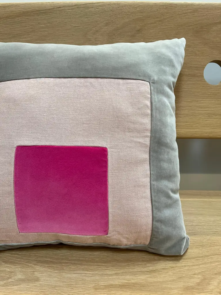 Under the theme of geometric abstraction, these cushions are made like paintings from our gallery’s high-quality and colorful fabrics. The approach comes from a reinterpretation of geometric abstract painting, based on simple geometric shapes like the square and pure colors. All this is related to realism and minimalism. Through this project, we pay homage to Josef and Anni Albers, Bauhaus-trained leaders of geometric abstraction. They carefully inscribed squares within squares, creating atmospheres that were at once peaceful and harmonically charged. To this end, we are spotlighting our craftsmen by reworking fabrics from the gallery.