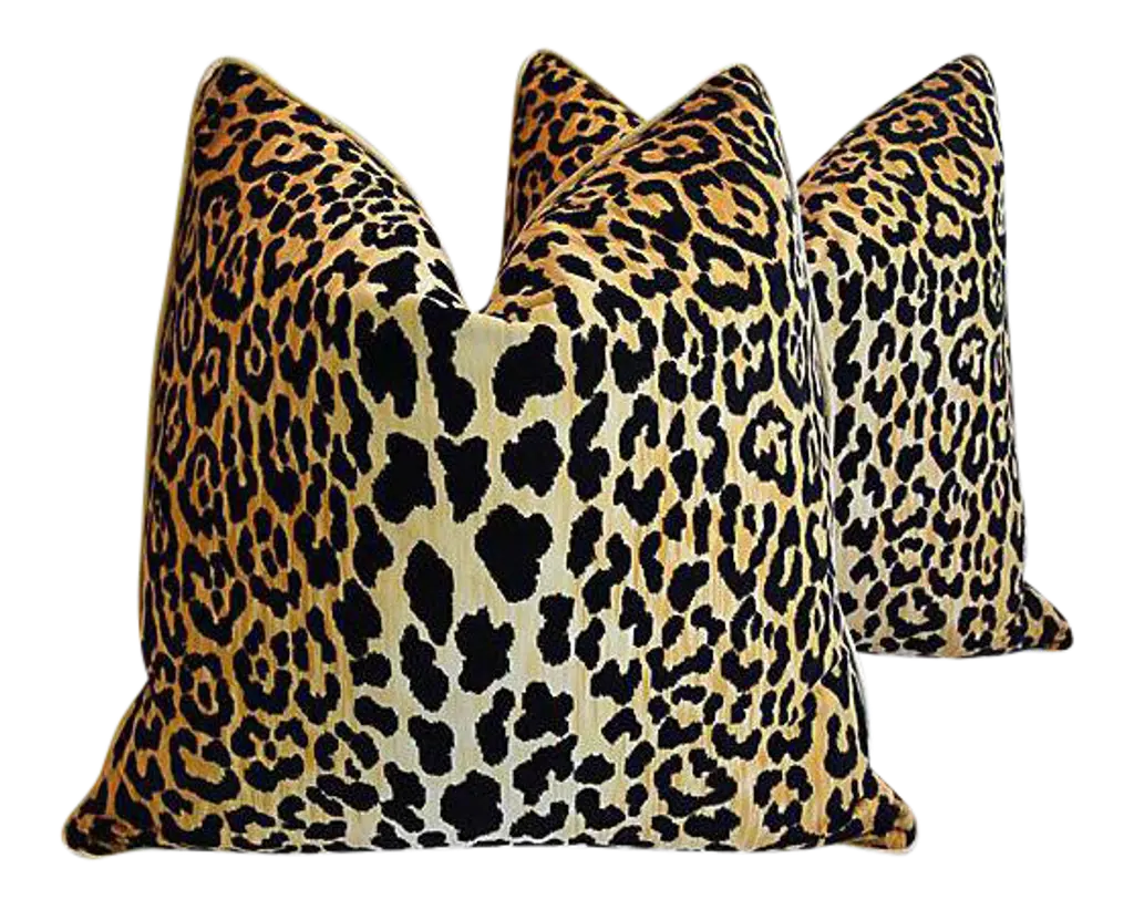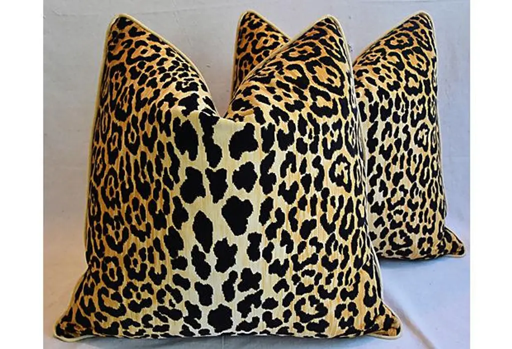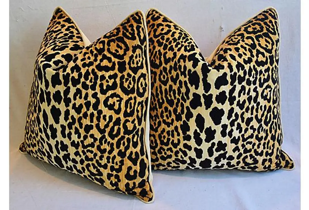 Pair of custom-tailored pillows in an ultra-soft velvety cotton low-nap fabric depicting a safari leopard spot print. The pattern has been meticulously centered on each pillow. Pillow's backs are a golden velvet fabric. Pillows are finished with a custom matching velvet cord trim, invisible zipper closures, and plump generous goose down-and-feather inserts. Excellent new unused condition!! ***PLEASE NOTE: If you purchase more than one pillow or more than one pair of pillows you may initially be charged extra shipping costs at checkout. However, I always combine items into one box when possible and I will alert Chairish to refund any overage paid on shipping costs to you. Warm regards, Mike Seratt I SHIP OUT IMMEDIATELY, SO THE ESTIMATION YOU SEE FOR THE DELIVERY TIMELINE IS CHAIRISH'S OVERALL GENERAL TIMELINE, BUT I WILL GET THIS OUT THE NEXT DAY AND DELIVERY IS USUALLY 5-7 DAYS AT MOST