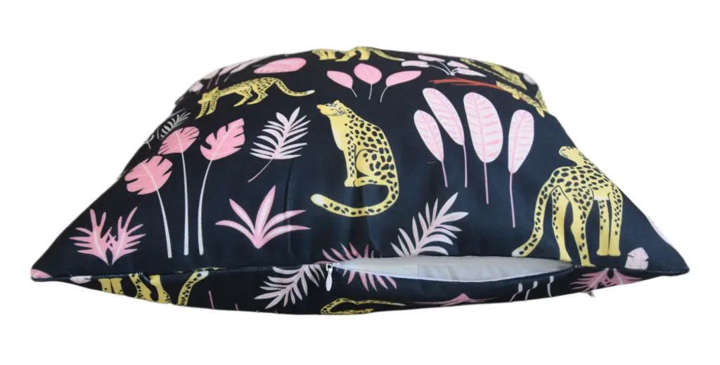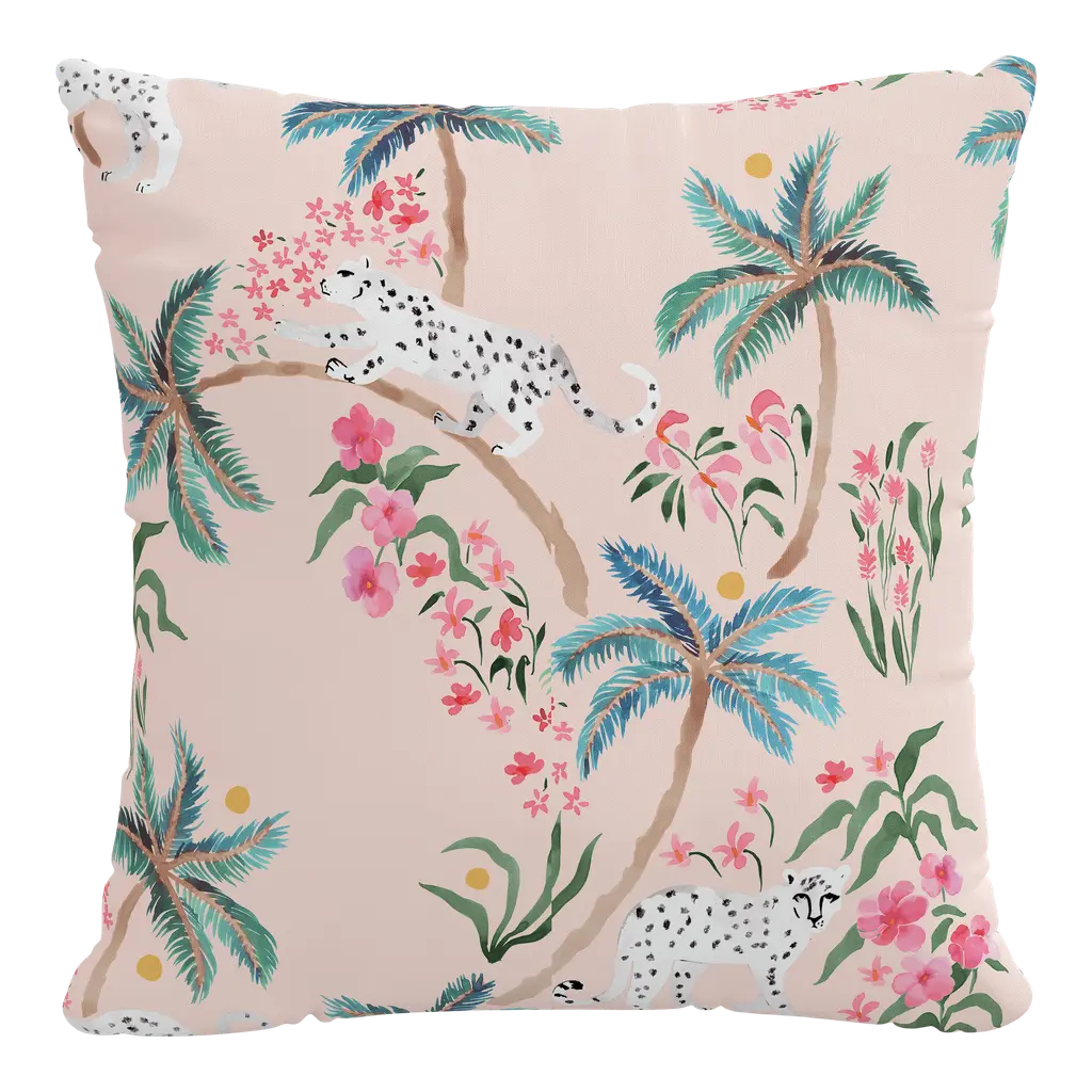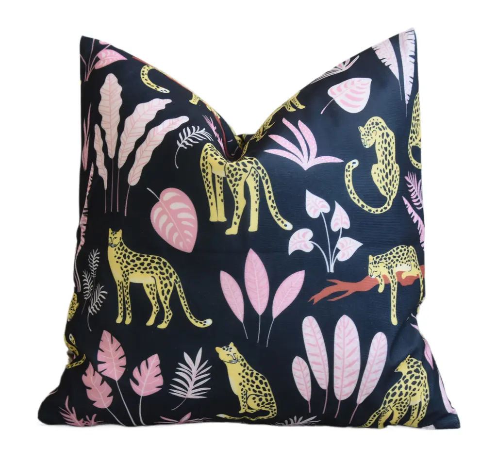 Custom-tailored pillow in a colorful cotton blend printed fabric depicting lounging leopards or cheetahs in a botanical background. Same fabric on the reverse. Zipper closure. Generous plump goose feather-and-down insert. Excellent new, unused beautiful condition!!!