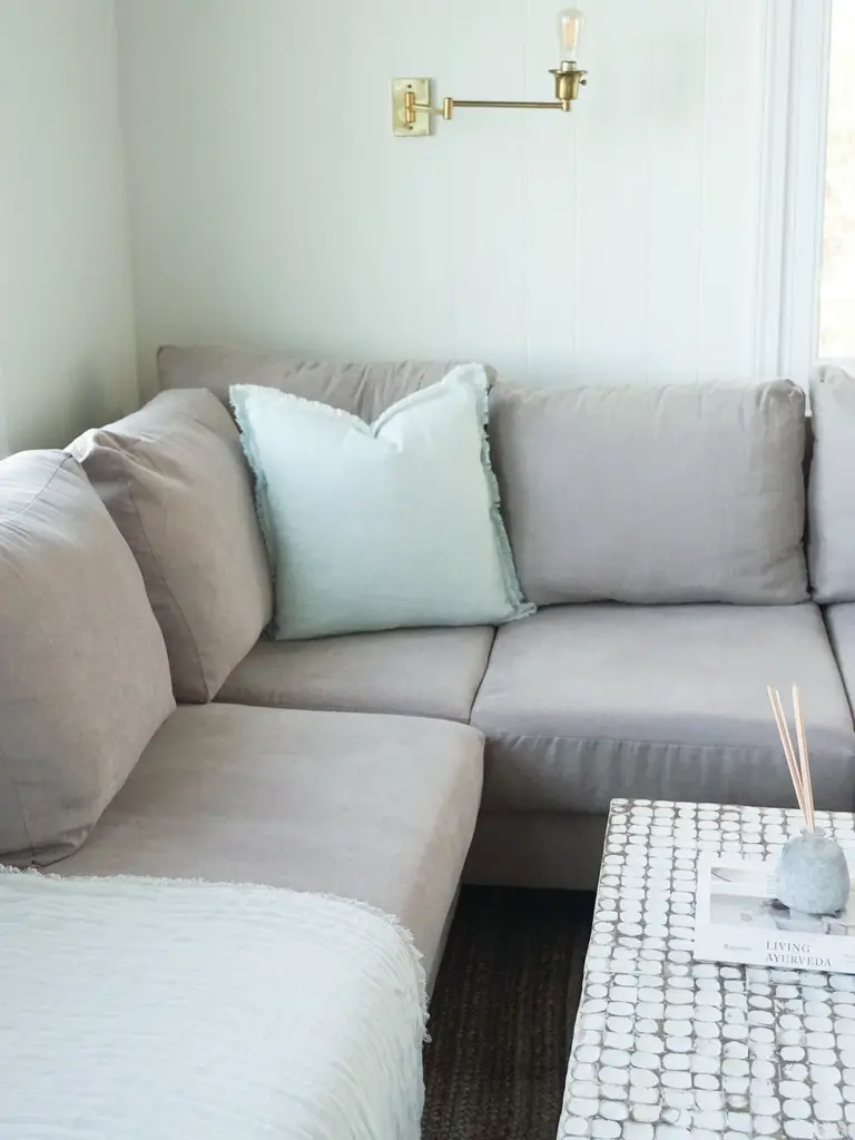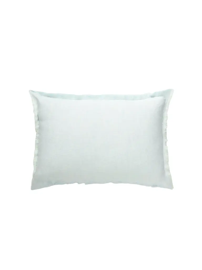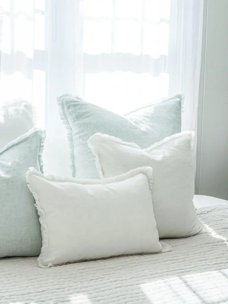 This Light Aqua Fringe Soft Linen Pillow is Soo soft- you won’t believe its linen! This yarn has a slight nub which gives it a beautiful natural texture. Edges have a self-fringe on all sides of the Light Aqua Linen Pillow. Details Front & Back Color: Light Aqua Front & Back side: 100% Linen (washed) Concealed zipper closure on back side. Hand washing or a delicate cycle with like colored fabrics recommended. Hang to Dry. Made in India. Pillows are available in 3 options:Pillow Cover Only, with a Down Alternative insert, or with a Down InsertDown Alternative InsertBenefits: Allergen free, Better back support, Retain their shapeInside Fill: 1.2 denier x1.25" polyester gelOuter Shell: 65% polyester/ 35% white cotton blendMade in the USA Down InsertBenefits: Durable, Easy to fluff and re-style, Retains heatInside Fill: 95% gray duck feathers and 5% goose downOuter Shell: 233-thread count 100% cotton fabric Made in the USA