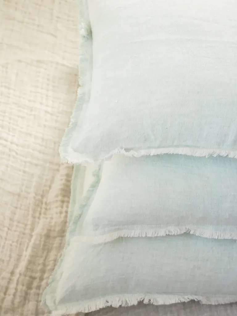 This Light Aqua Fringe Soft Linen Pillow is Soo soft- you won’t believe its linen! This yarn has a slight nub which gives it a beautiful natural texture. Edges have a self-fringe on all sides of the Light Aqua Linen Pillow. Details Front & Back Color: Light Aqua Front & Back side: 100% Linen (washed) Concealed zipper closure on back side. Hand washing or a delicate cycle with like colored fabrics recommended. Hang to Dry. Made in India. Pillows are available in 3 options:Pillow Cover Only, with a Down Alternative insert, or with a Down InsertDown Alternative InsertBenefits: Allergen free, Better back support, Retain their shapeInside Fill: 1.2 denier x1.25" polyester gelOuter Shell: 65% polyester/ 35% white cotton blendMade in the USA Down InsertBenefits: Durable, Easy to fluff and re-style, Retains heatInside Fill: 95% gray duck feathers and 5% goose downOuter Shell: 233-thread count 100% cotton fabric Made in the USA