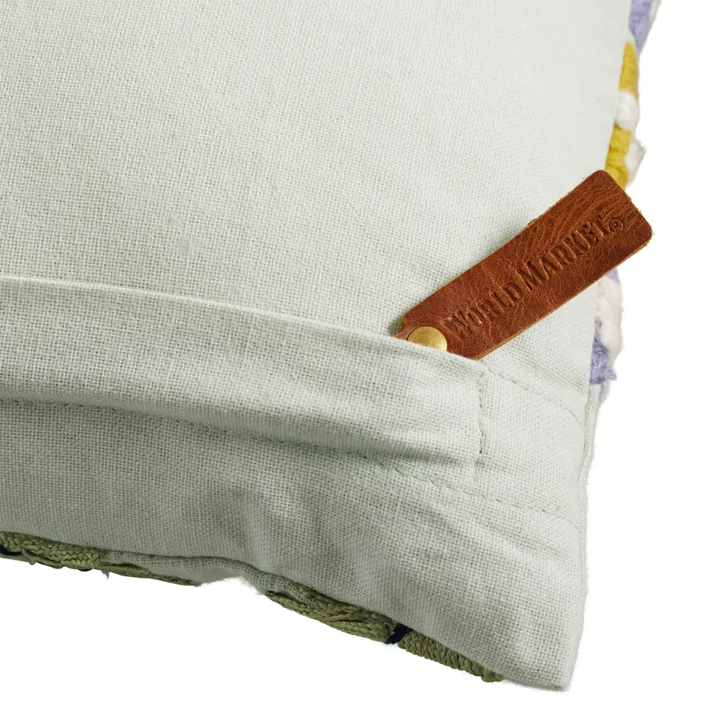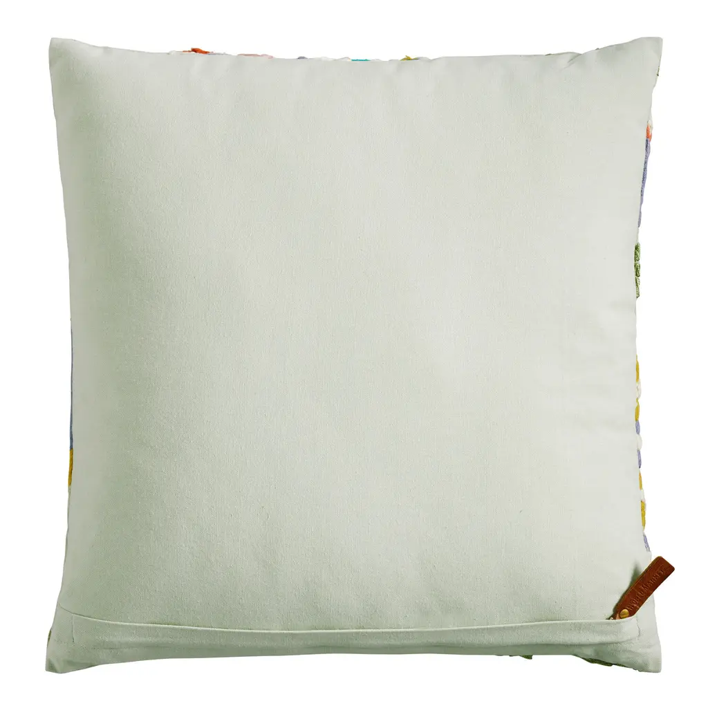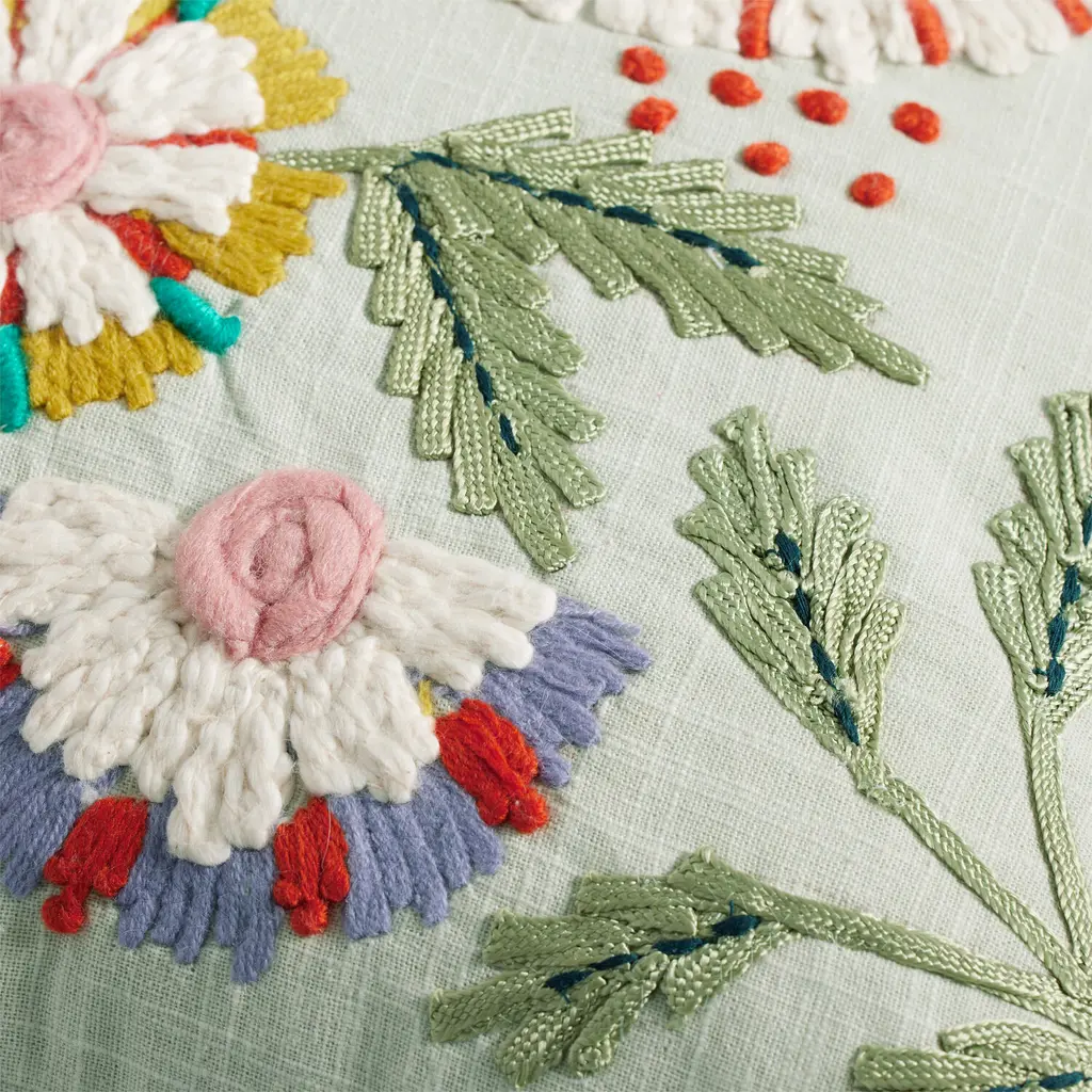 Add a touch of whimsy to your home decor with our exclusive embroidered throw pillow featuring an adorable tufted bird surrounded by a riot of florals. Multi-textured flowers and leaves in a rainbow of colors surround a gold and pink bird atop a pale aqua ground, giving your home the awakening it needs just in time for spring. It's delightful when layered with your current pillow collection and makes a sweet statement on its own.