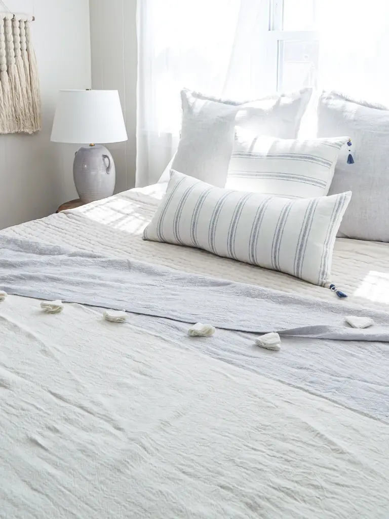 Our Light Grey Fringe Soft Linen Pillow is Soo soft- you won’t believe it's linen! This yarn has a slight nub which gives it a beautiful natural texture. Edges have a self-fringe on all sides. Sizes: 14"x20", 20"x20", 26"x26". Details Front & Back Color: Light Grey (Light Grey & White yarns Cross dyed) Front & Back side: 100% Linen (Pre-washed) Concealed zipper closure on back side. Hand washing or a delicate cycle with like colored fabrics recommended. Hang to Dry. Made in India Pillows are available in 3 options:Pillow Cover Only, with a Down Alternative insert, or with a Down InsertDown Alternative InsertBenefits: Allergen free, Better back support, Retain their shapeInside Fill: 1.2 denier x1.25" polyester gelOuter Shell: 65% polyester/ 35% white cotton blendMade in the USA Down InsertBenefits: Durable, Easy to fluff and re-style, Retains heatInside Fill: 95% gray duck feathers and 5% goose downOuter Shell: 233-thread count 100% cotton fabric Made in the USA