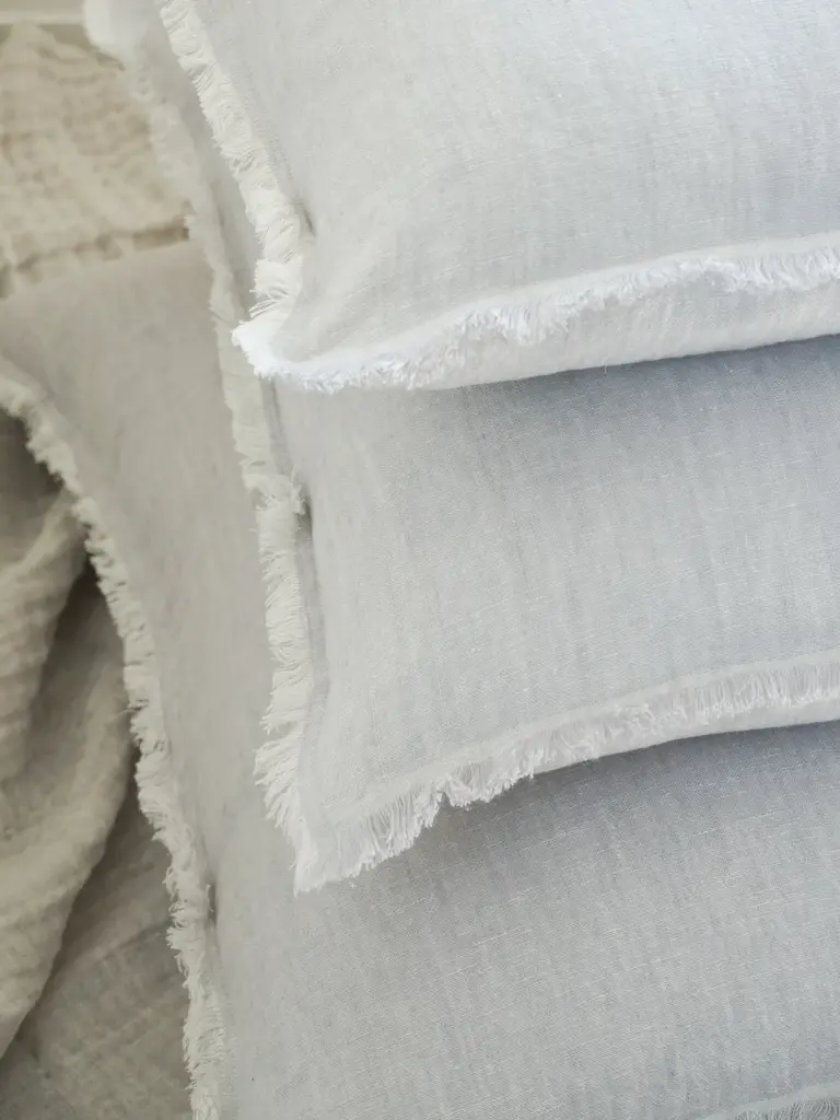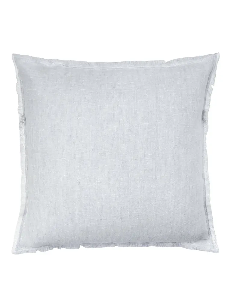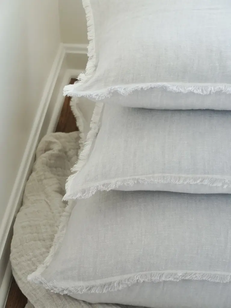 Our Light Grey Fringe Soft Linen Pillow is Soo soft- you won’t believe it's linen! This yarn has a slight nub which gives it a beautiful natural texture. Edges have a self-fringe on all sides. Sizes: 14"x20", 20"x20", 26"x26". Details Front & Back Color: Light Grey (Light Grey & White yarns Cross dyed) Front & Back side: 100% Linen (Pre-washed) Concealed zipper closure on back side. Hand washing or a delicate cycle with like colored fabrics recommended. Hang to Dry. Made in India Pillows are available in 3 options:Pillow Cover Only, with a Down Alternative insert, or with a Down InsertDown Alternative InsertBenefits: Allergen free, Better back support, Retain their shapeInside Fill: 1.2 denier x1.25" polyester gelOuter Shell: 65% polyester/ 35% white cotton blendMade in the USA Down InsertBenefits: Durable, Easy to fluff and re-style, Retains heatInside Fill: 95% gray duck feathers and 5% goose downOuter Shell: 233-thread count 100% cotton fabric Made in the USA