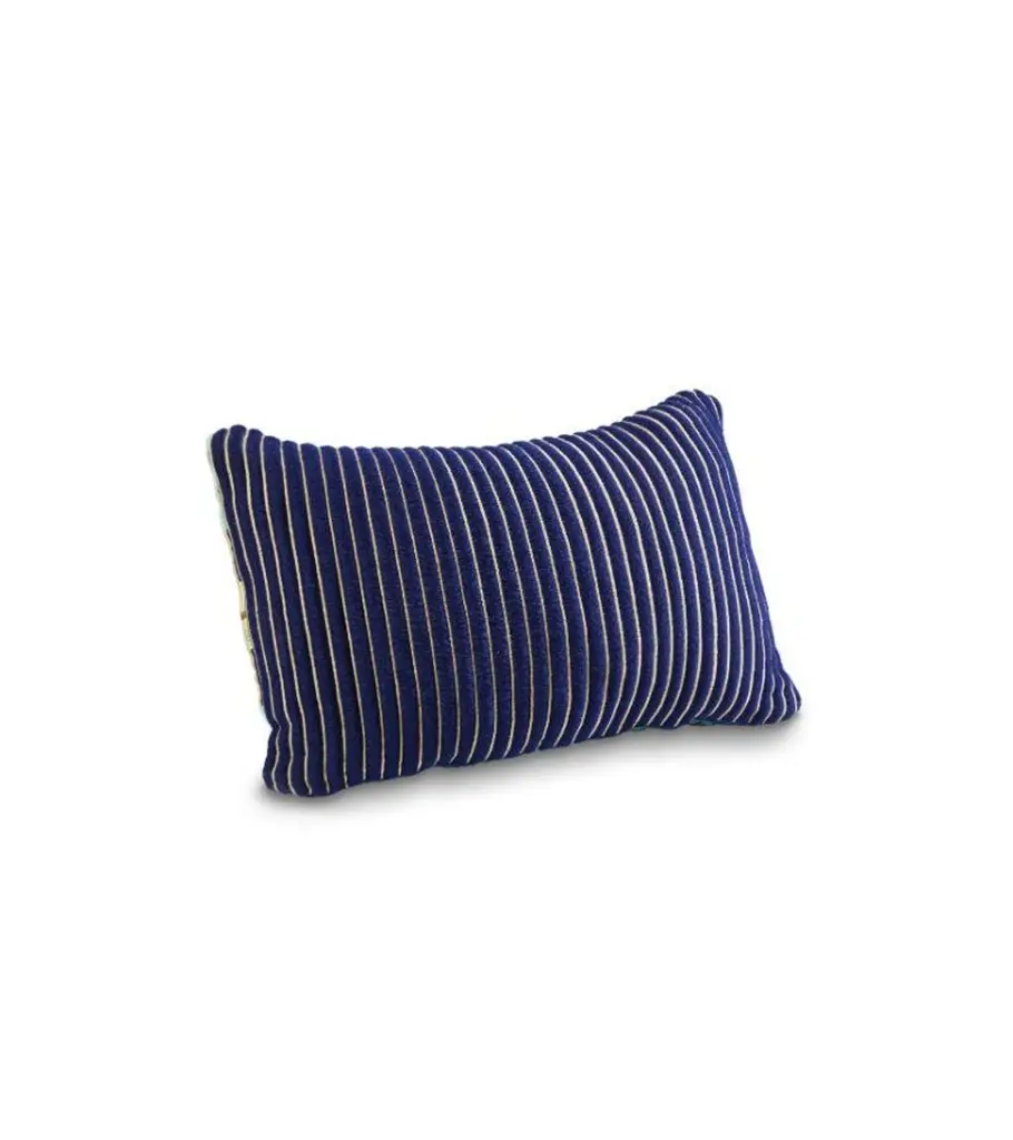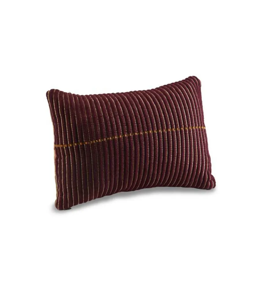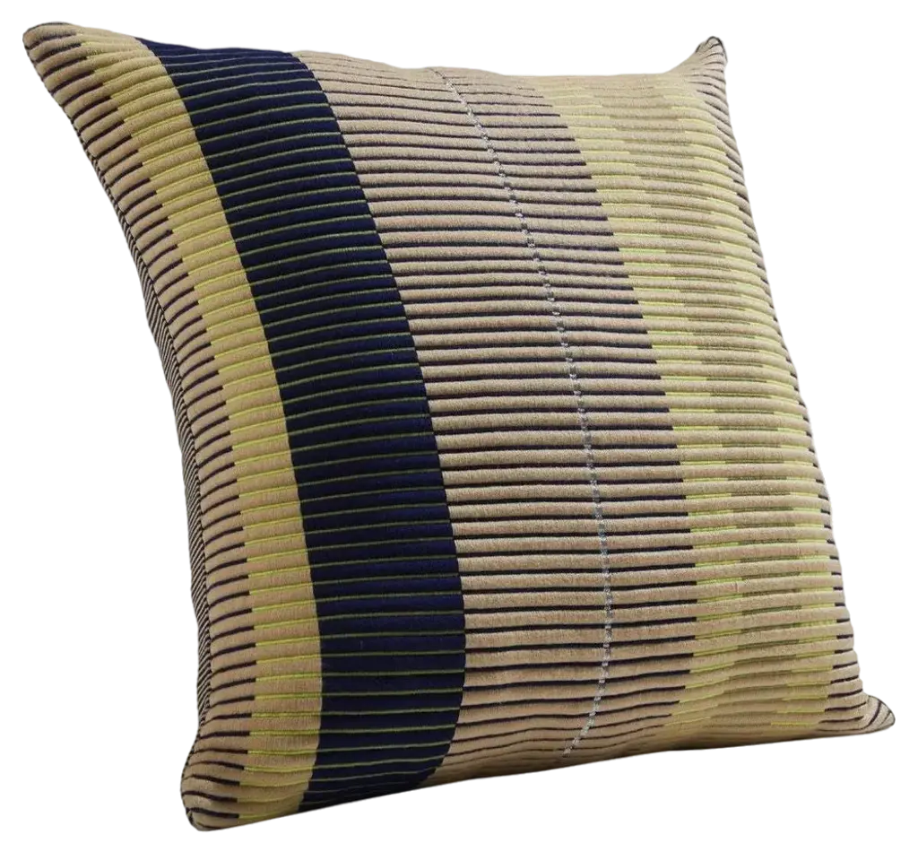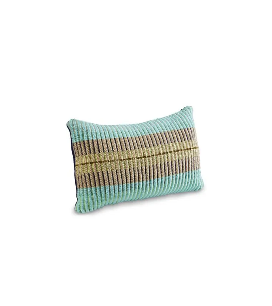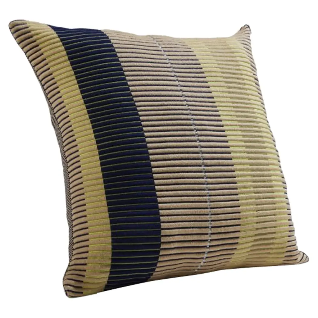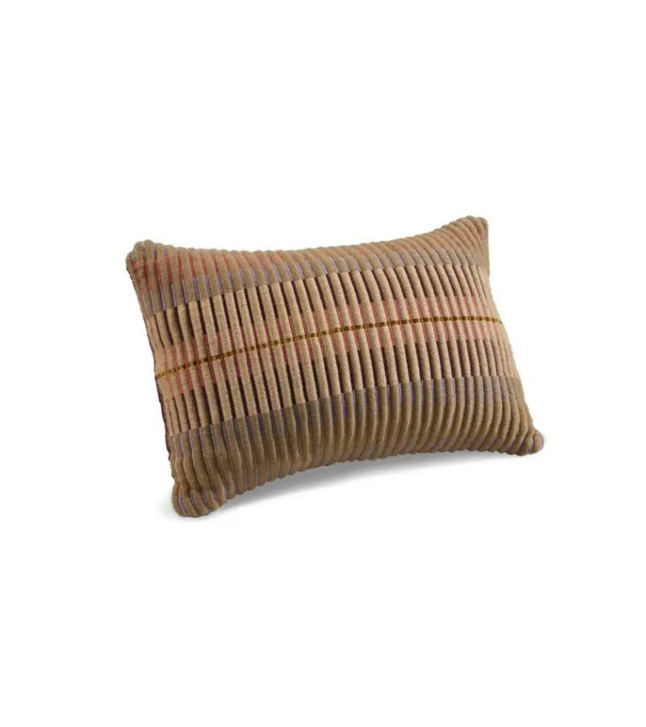 Lila Chumbes pillow 1 by Mae Engelgeer. Materials: 100% cotton. Technique: Hand-woven in Colombia. Dimensions: W 60 x H 40 cm Available in colors: Lila/ brick/ gold/ terra. Also available in sizes: Medium, large, and cylinder pillow. The Chumbes Cushion is a sumptuous accessory created by Dutch textile designer Mae Engelgeer. A lively addition to any sofa or lounge chair, its very intricate stripe pattern is inspired by the Chumbe Inga, a traditional Colombian garment. The cushion features two different hand-woven motifs that have a ribbed structure, making it a joy to touch. Thanks to the metallic threads that have been woven into the cotton, the cushion has a gentle lustrous shine. The Chumbes collection also includes a cylinder cushion and a large layer cushion. Each cushion is hand-woven in our partner workshops in San Jacinto, a municipality in the North of Columbia. Similar to the production of the hamacas, which are typical for the region, it is the artesanas, the craftswomen, who produce the textiles on vertical looms. It takes up to ten days for the women artisans to produce one cushion.Dutch designer Mae Engelgeer felt always drawn to textiles – from her school days through her studies at the Amsterdam Fashion Institute to her Masters in applied art at the Sandberg Instituut. Since opening her studio in 2013, she has been driven by her interest in traditional Craft techniques. Using yarns, colors, patterns, and fabrics, she pushes the boundaries of textile production to adapt old techniques for the modern day. Mae Engelgeer’s signature style combines subtle color palettes, patterns, and linear elements.