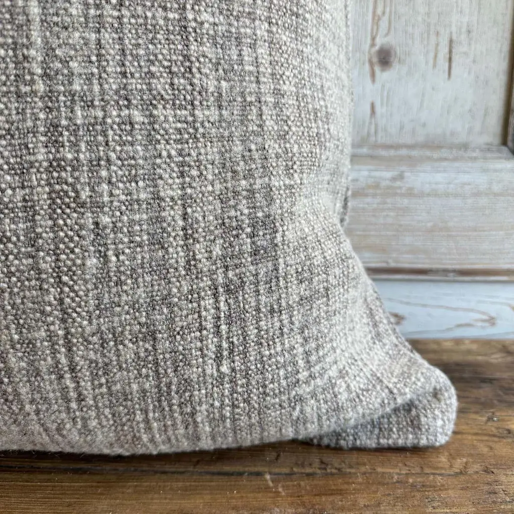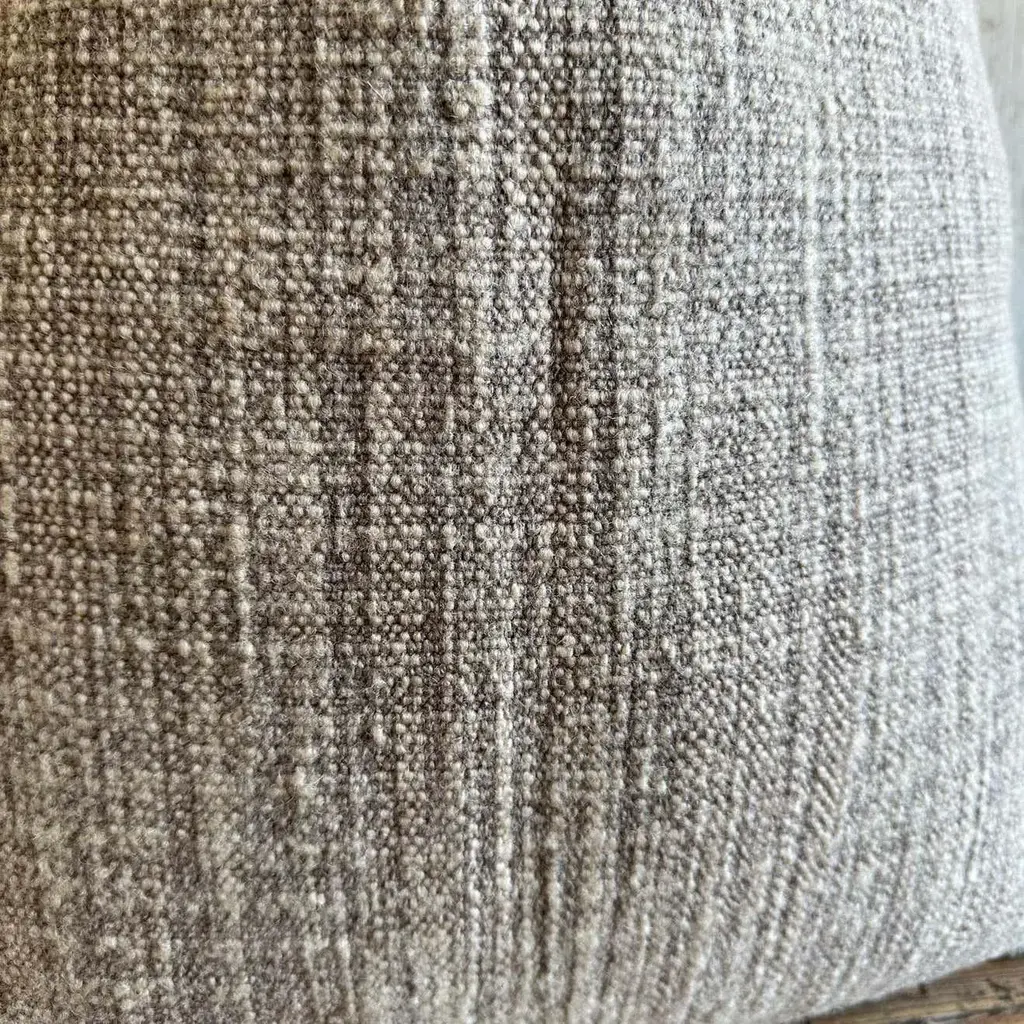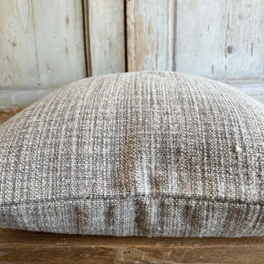 Solid woven rug style pillow in wool and linen for Bloom home inc. Color: Warm naturals, oatmeals, grays, and creams Size: 25x25x8 (when stuffed) Beeswax washed construction Zipper closure, down / feather insert is included. Dry clean only. Spot clean if neccessary.