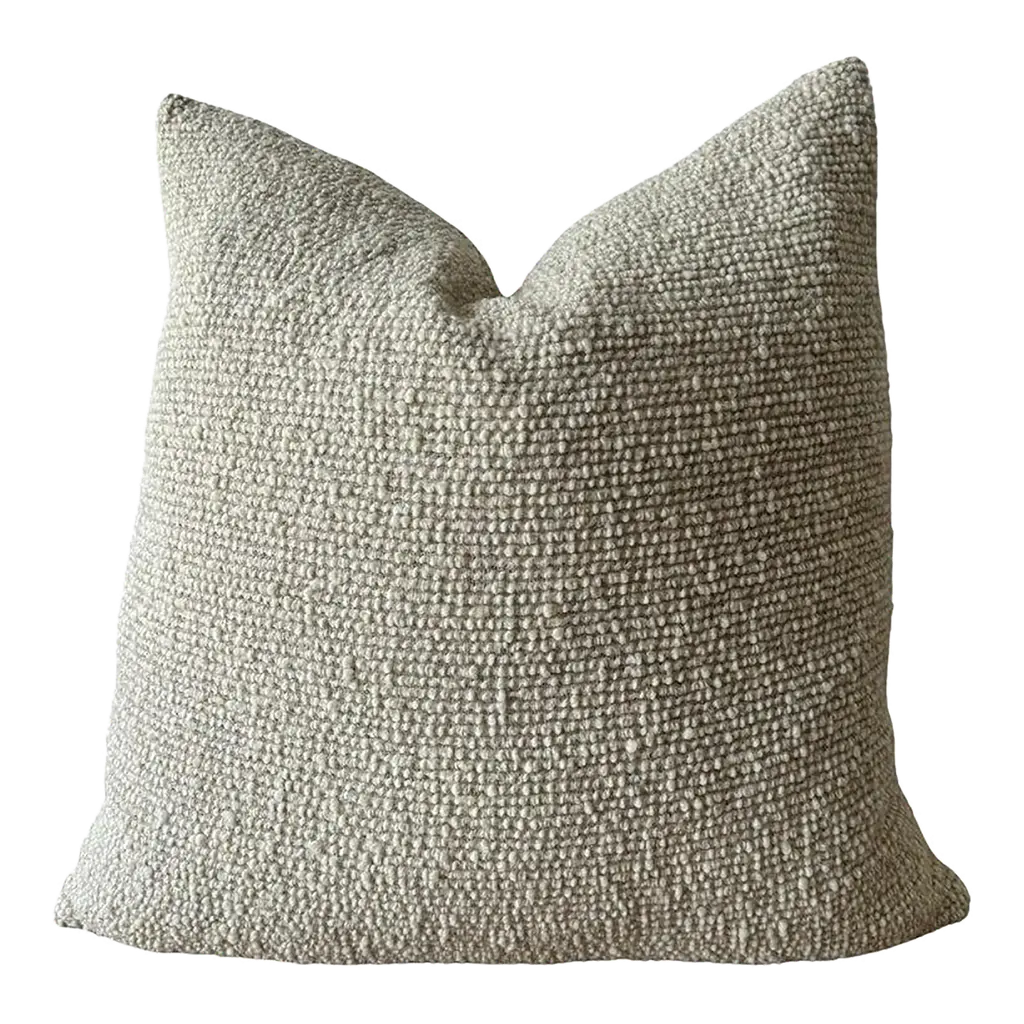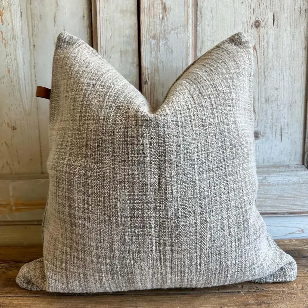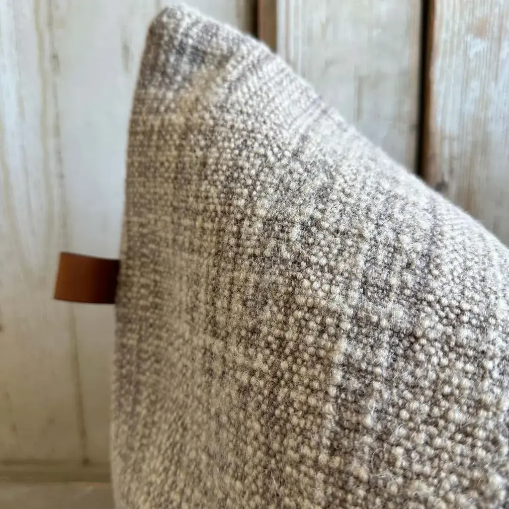 Solid woven rug style pillow in wool and linen for Bloom home inc. Color: Warm naturals, oatmeals, grays, and creams Size: 25x25x8 (when stuffed) Beeswax washed construction Zipper closure, down / feather insert is included. Dry clean only. Spot clean if neccessary.